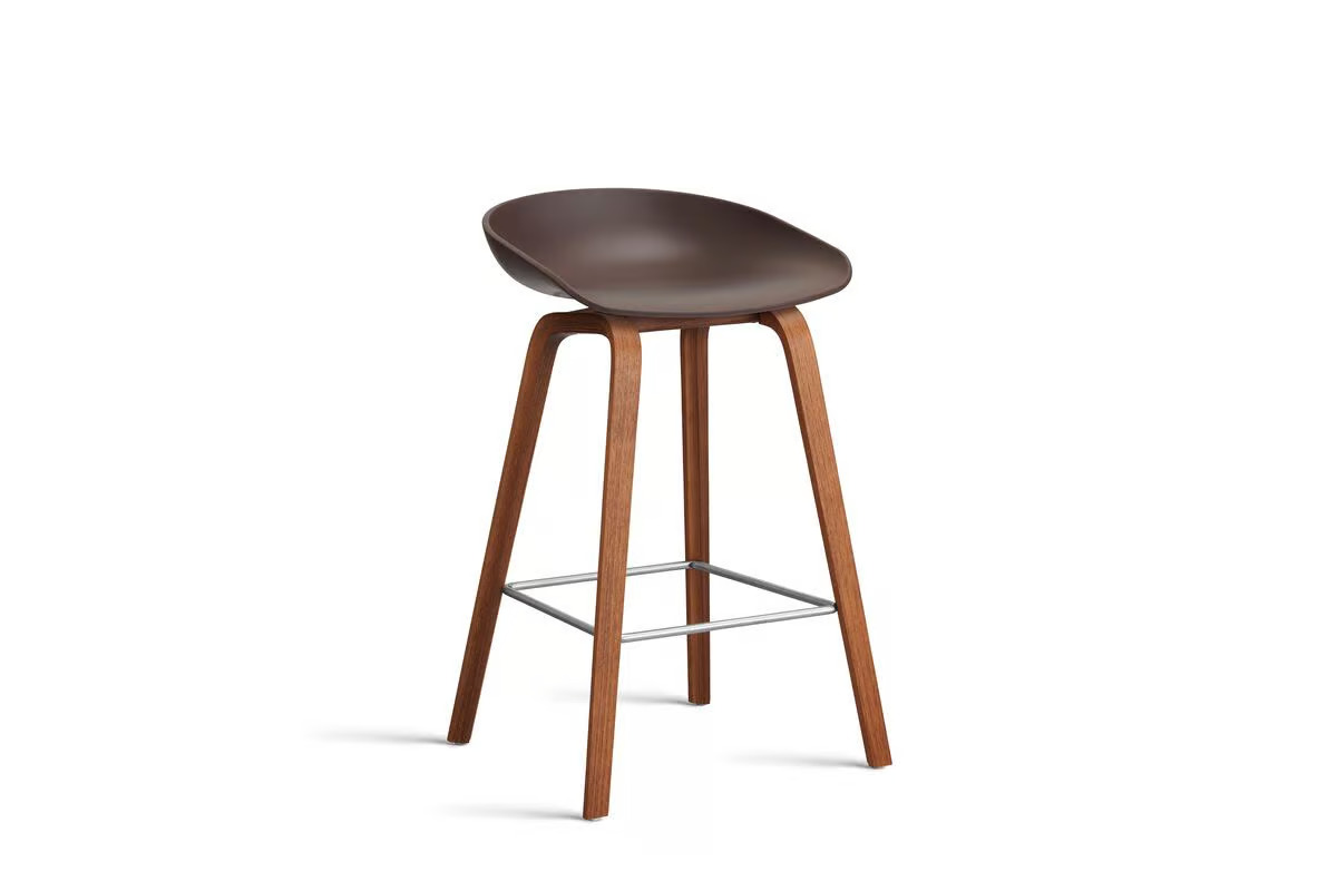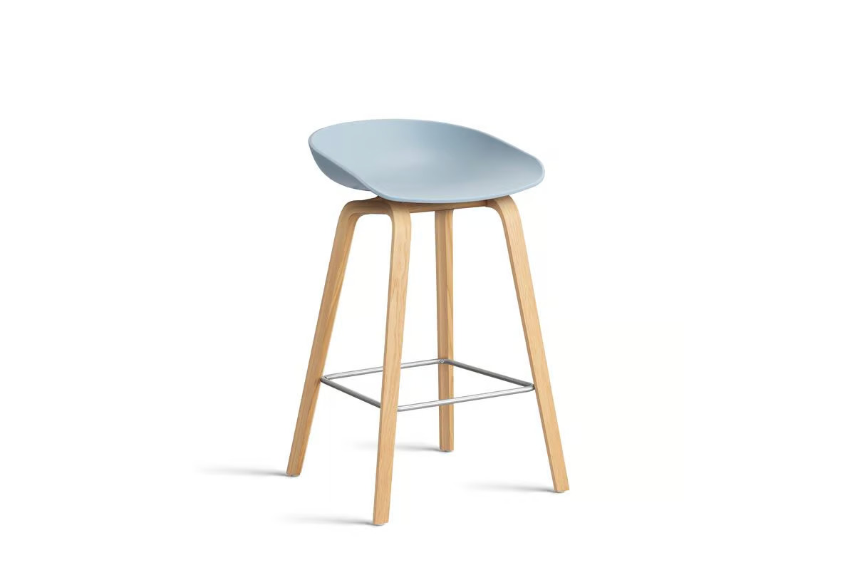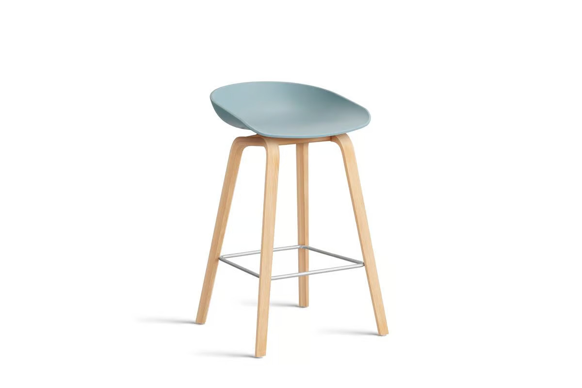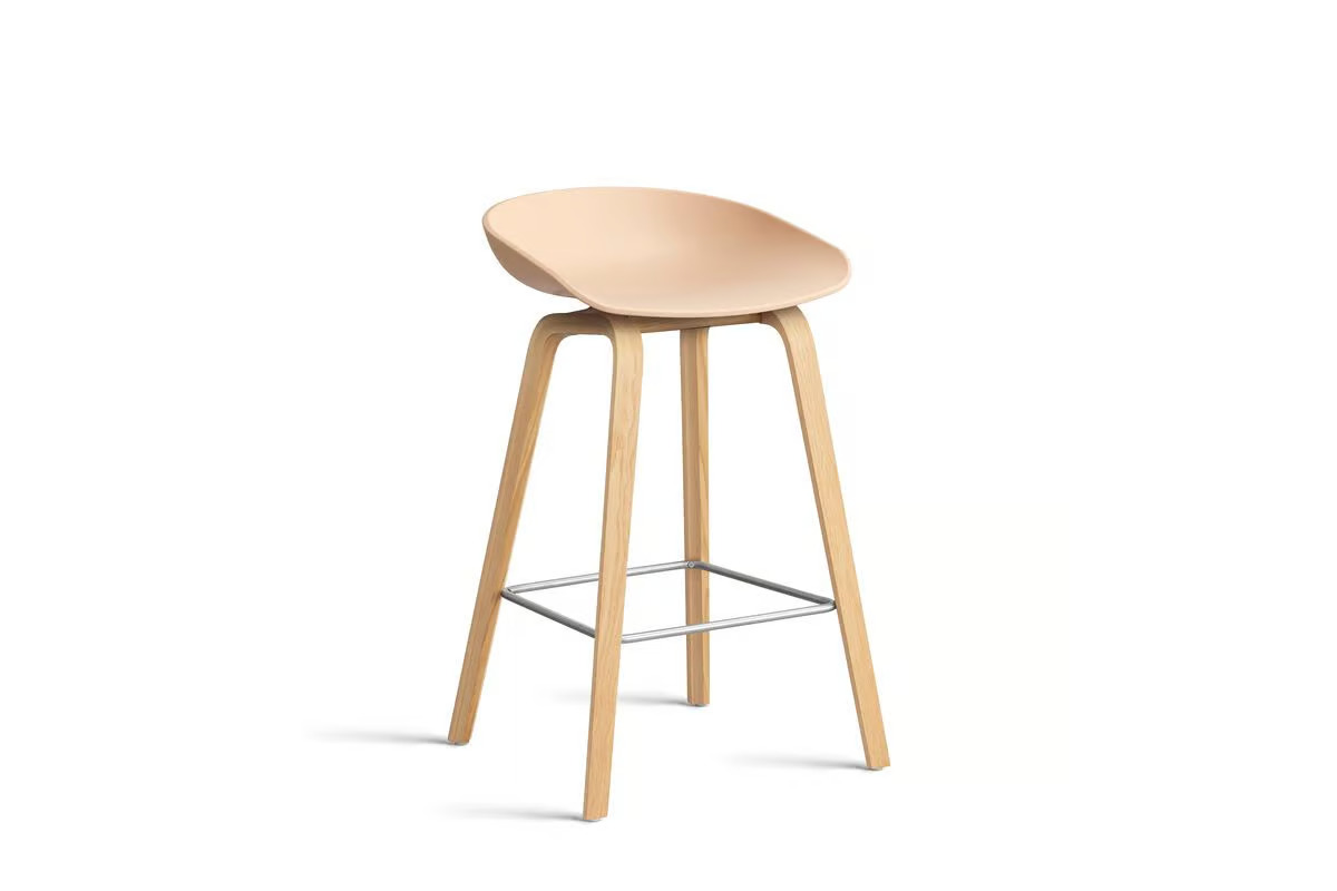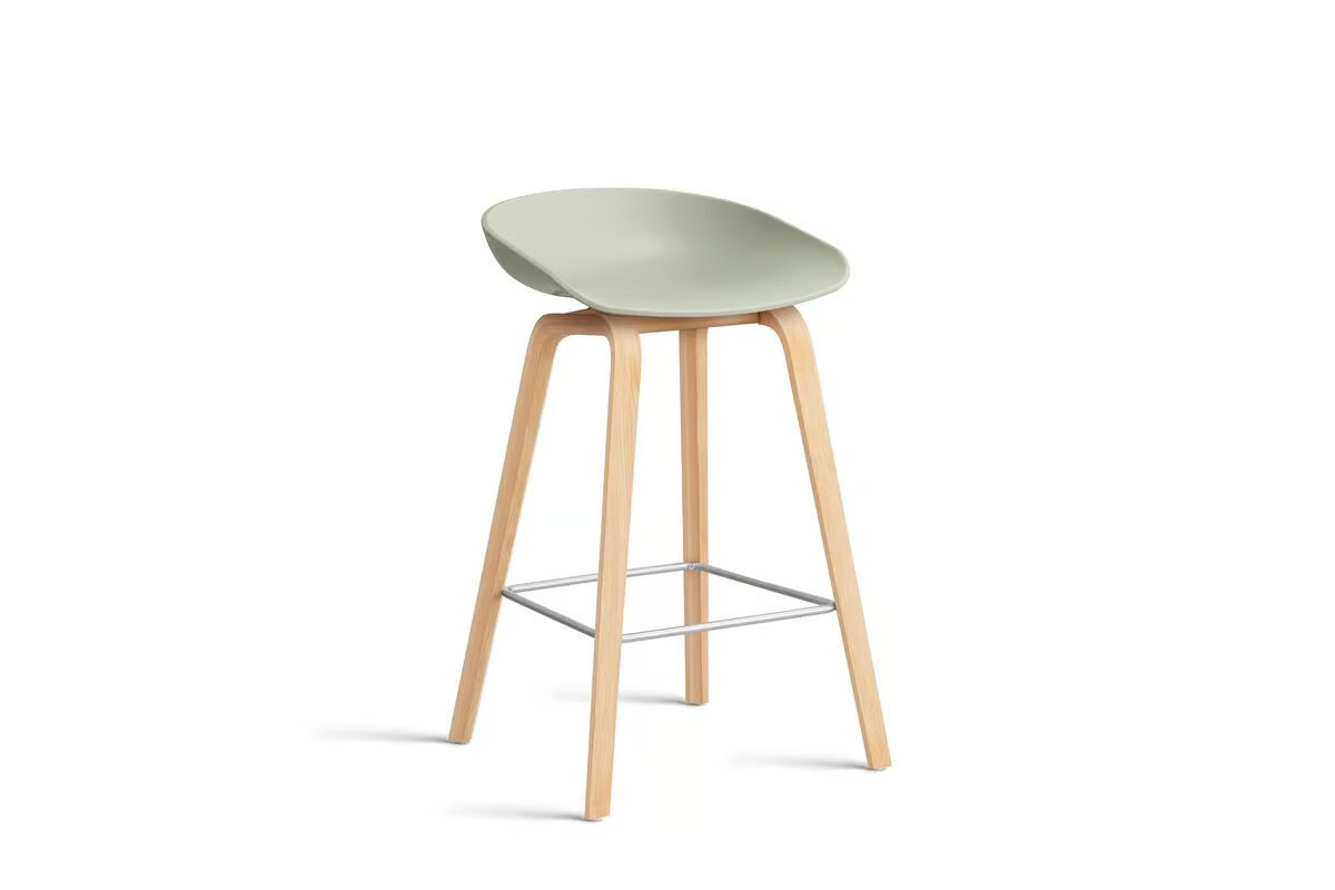 The About A Stool AAS 32 combines a curved backrest with sleek, elongated wooden legs, offering a versatile profile suitable for various settings. Its seat, crafted from post-consumer recycled plastic, is available in a range of modern colors and upholstery options. The legs come in two different heights and wood finishes, providing flexibility for diverse environments. This stool's understated yet robust design makes it an excellent choice for dining tables, café chairs, and conference room furniture. Its ergonomic and durable seating is ideal for restaurants, coworking spaces, educational institutions, and event venues. The stackable feature enhances its practicality, making it a valuable addition to any modern design table setup.