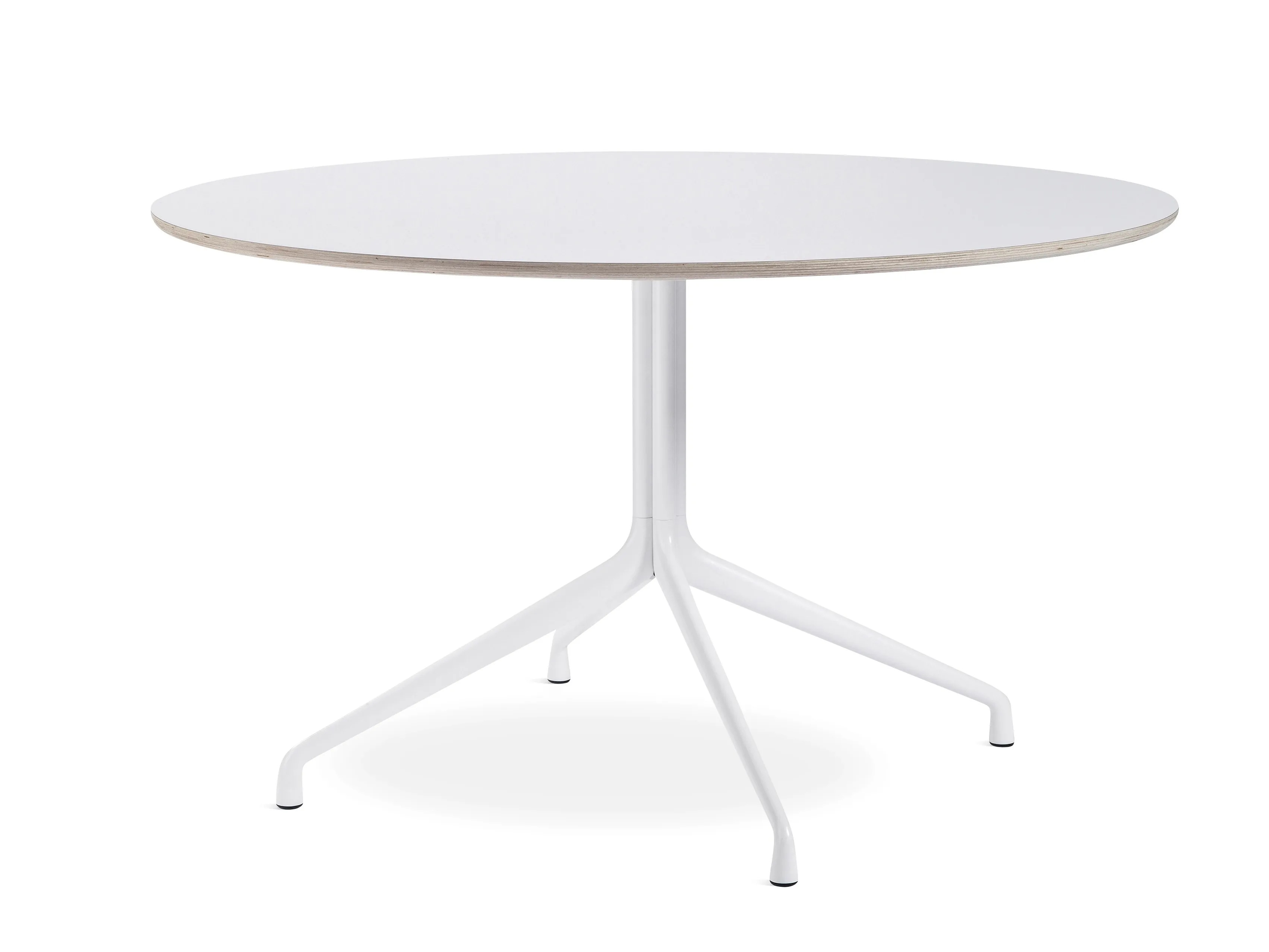 The ABOUT A TABLE AAT20 seamlessly integrates with its design family, offering a versatile solution for various settings. Its modern design features a powder-coated frame, mirroring the aesthetic of accompanying café chairs and ergonomic seating options. The table's organic curves and elevated feet contribute to its light and contemporary appearance. Available in two heights and multiple dimensions, it caters to diverse needs in restaurants, conference rooms, coworking spaces, and more. The 25 mm plywood tabletop comes with either linoleum or laminate finishes, featuring rounded edges for a refined look. Choose from three base finishes: black powder-coated aluminum (RAL 9005), white powder-coated aluminum (RAL 9003), or polished aluminum. The tabletop is available in black linoleum with black-stained plywood edges or white laminate with raw plywood edges, making it a durable and stylish choice for any environment.