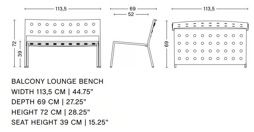 The Balcony bench, crafted by Ronan & Erwan Bouroullec for HAY, offers a versatile seating solution for outdoor environments. Its minimalist, square design is accentuated by strategically placed holes that enhance both the aesthetic and structural integrity of the seat and backrest. This modular outdoor seating option is stackable, making it ideal for a variety of settings, from intimate balconies and terraces to expansive gardens and patios. Constructed from powder-coated steel with an outdoor primer, it ensures durability and resilience against the elements, qualifying it as durable outdoor furniture. Available in five distinct finishes—Anthracite, Iron Red, Desert Green, Dark Forest, and Chalk Beige—this all-weather outdoor furniture piece complements any setting, whether for resorts, cafés, restaurants, or beachside hotels.