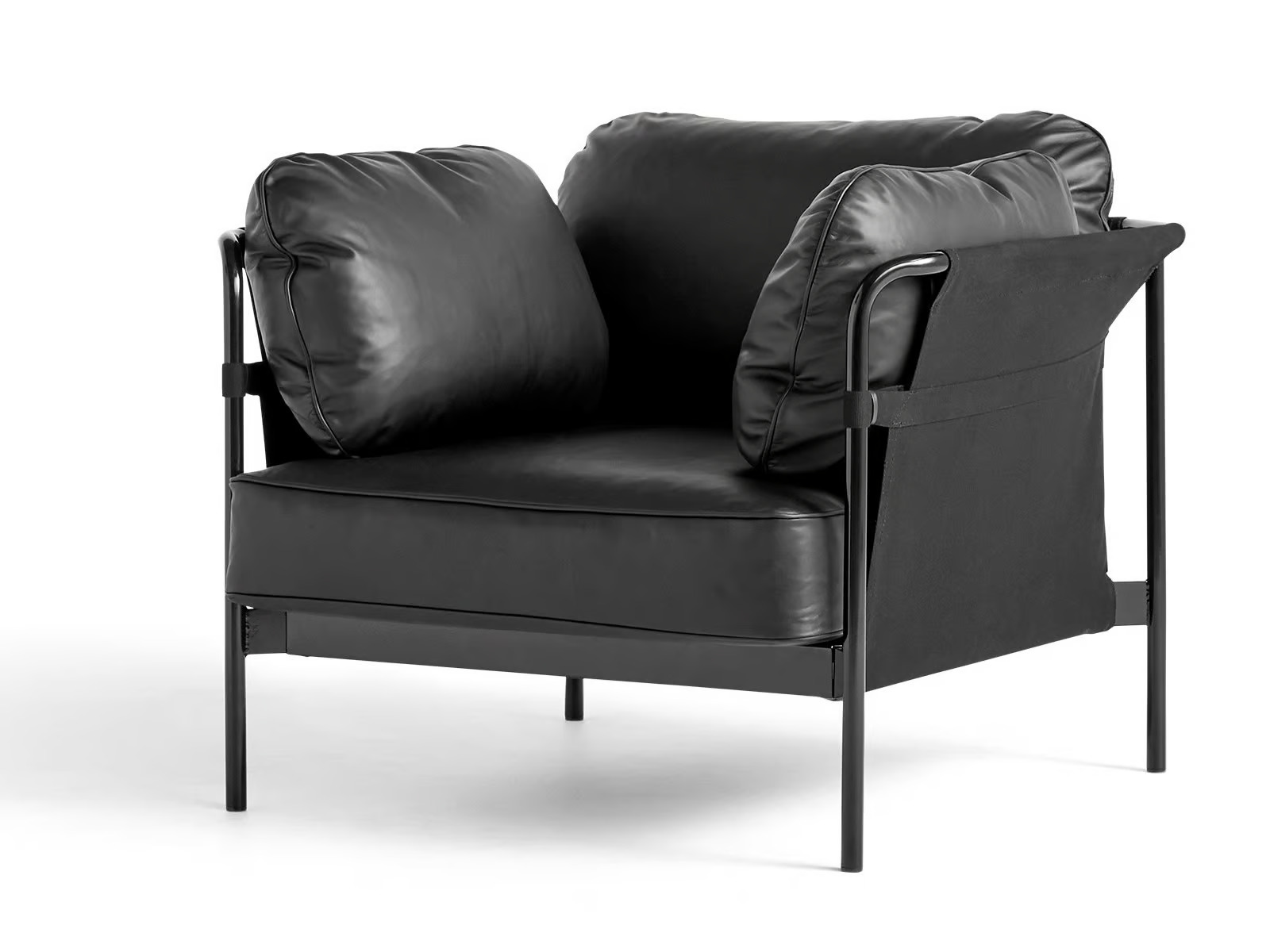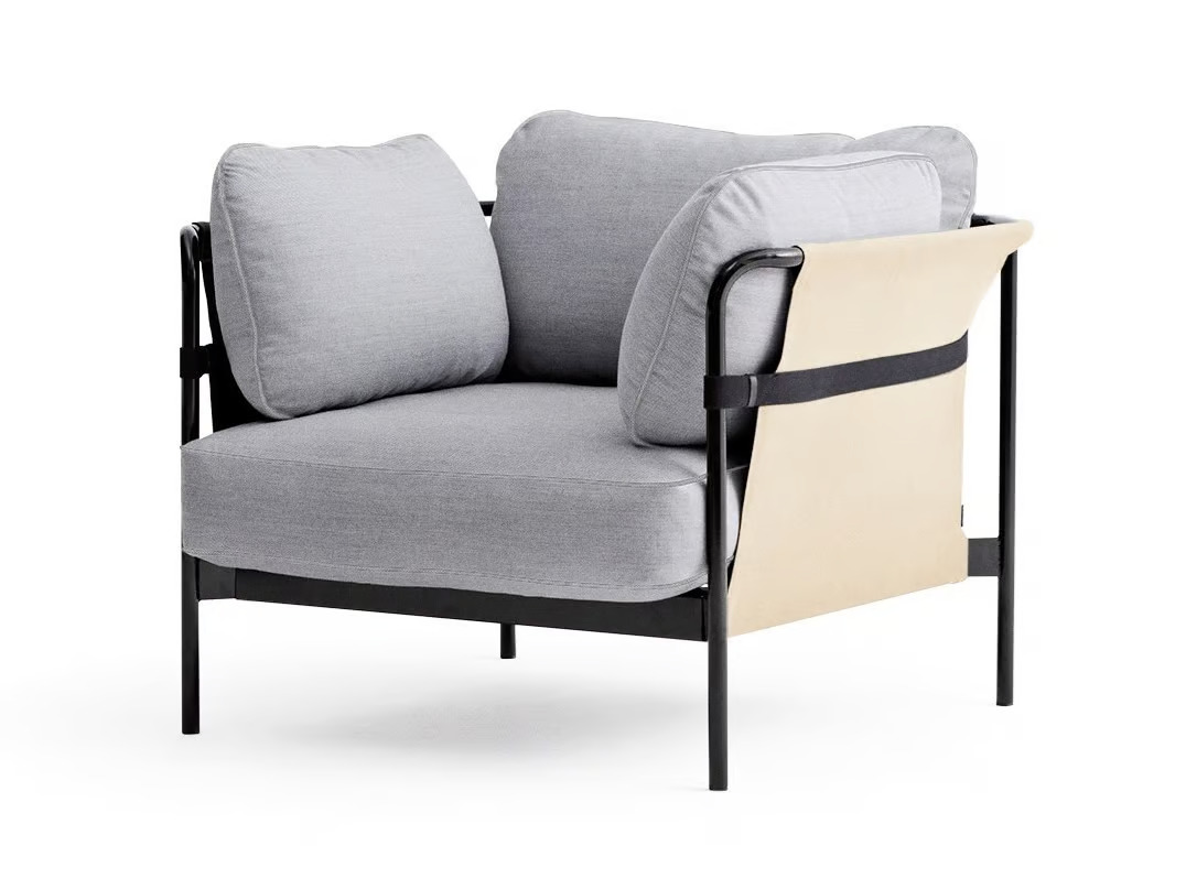 The CAN armchair, designed by Ronan and Erwan Bouroullec, redefines traditional seating with its simple, relaxed, and accessible design. Ideal for hotels, cafés, lounges, and waiting rooms, this piece offers a blend of modern lounge furniture and ergonomic design. The armchair arrives flat-packed, allowing for easy assembly from three main components: a frame, cover, and cushions. The frame is available in black powder-coated steel or chromed steel, providing a sturdy base. The mattress and cushions, crafted from foam and feather duvet, feature an integrated anti-slip fleece and non-reversible design. Upholstered armchairs come in black or natural canvas, with matching piping and a black cotton strap. Choose from seven fabric and leather options for the mattress and cushions, ensuring customizable sofa designs that fit any interior. This compact furniture solution is perfect for small spaces, offering comfortable seating solutions and luxury armchairs for any setting.