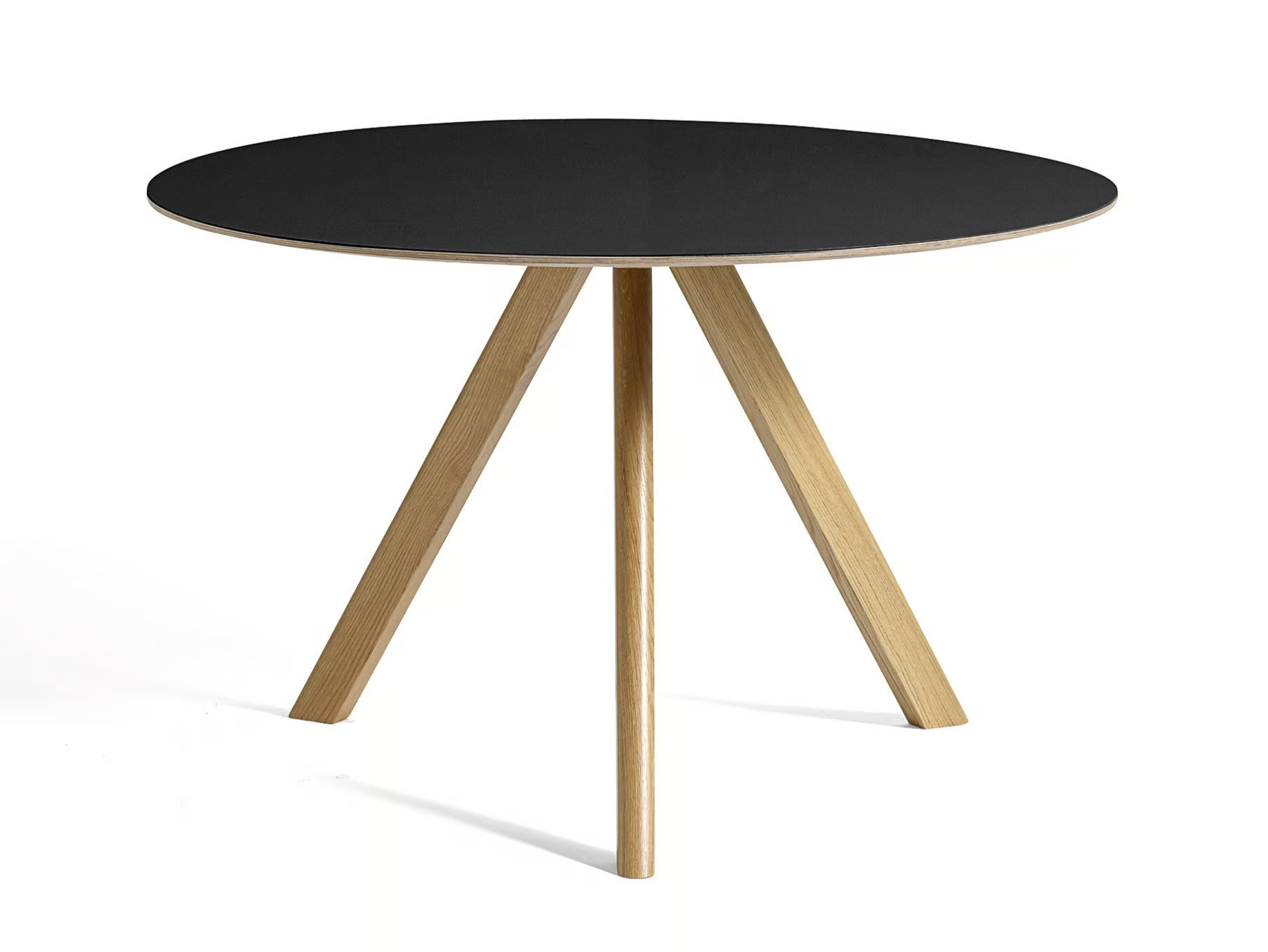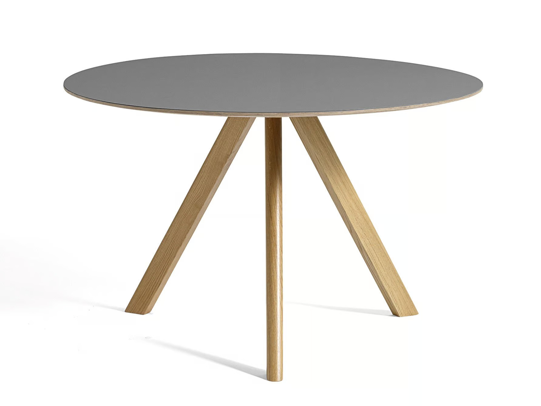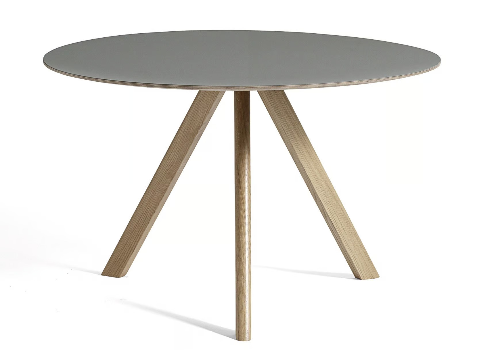 The COPENHAGUE CPH 20 ROUND table, designed by the Bouroullec brothers, features distinctive angled legs and a round tabletop that adds a softer touch to its engineered look. This versatile piece is ideal for a range of settings, from intimate meetings to larger, café-like environments, seamlessly fitting into both private and public spaces. Available in various heights and sizes, the table offers options in soap-finished and lacquered oak, with tabletops crafted from veneer, laminate, or linoleum. The edge is made from oak water-based lacquered plywood, while the frame is constructed from solid oak with a water-based lacquer finish. This modern design table is a perfect addition to dining areas, conference rooms, and educational institutions, providing durable seating and a contemporary aesthetic.
