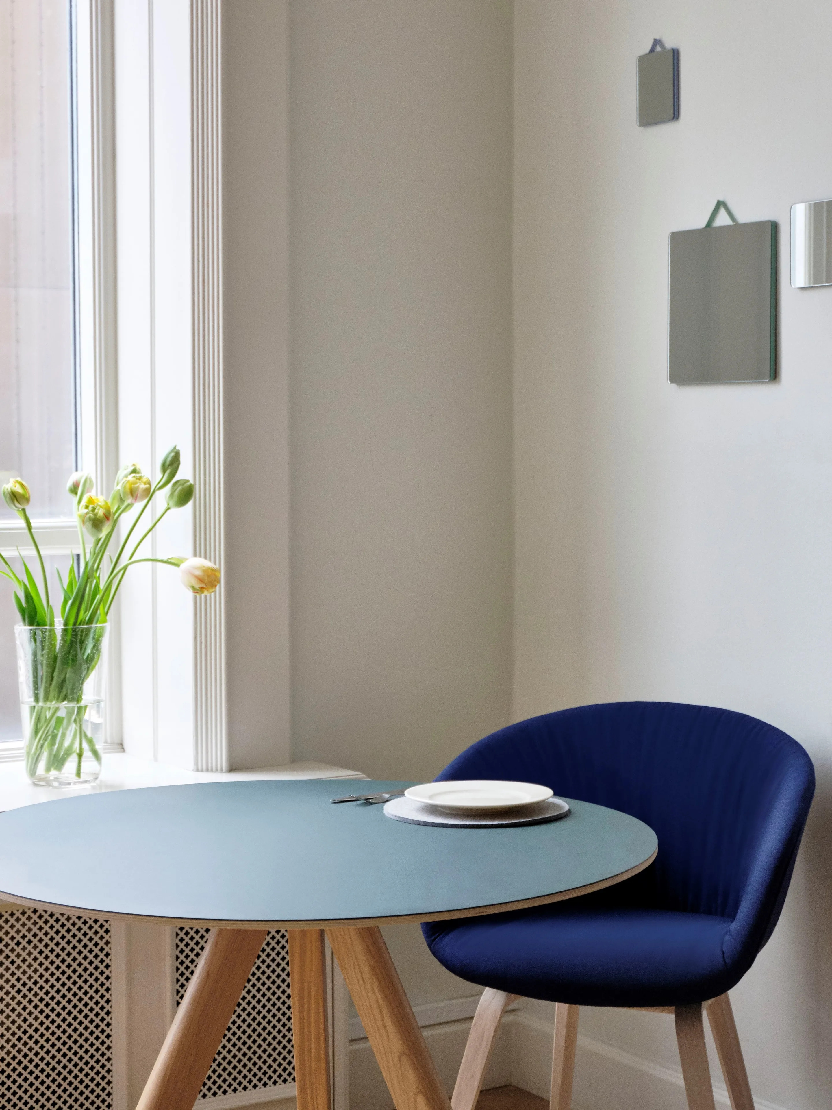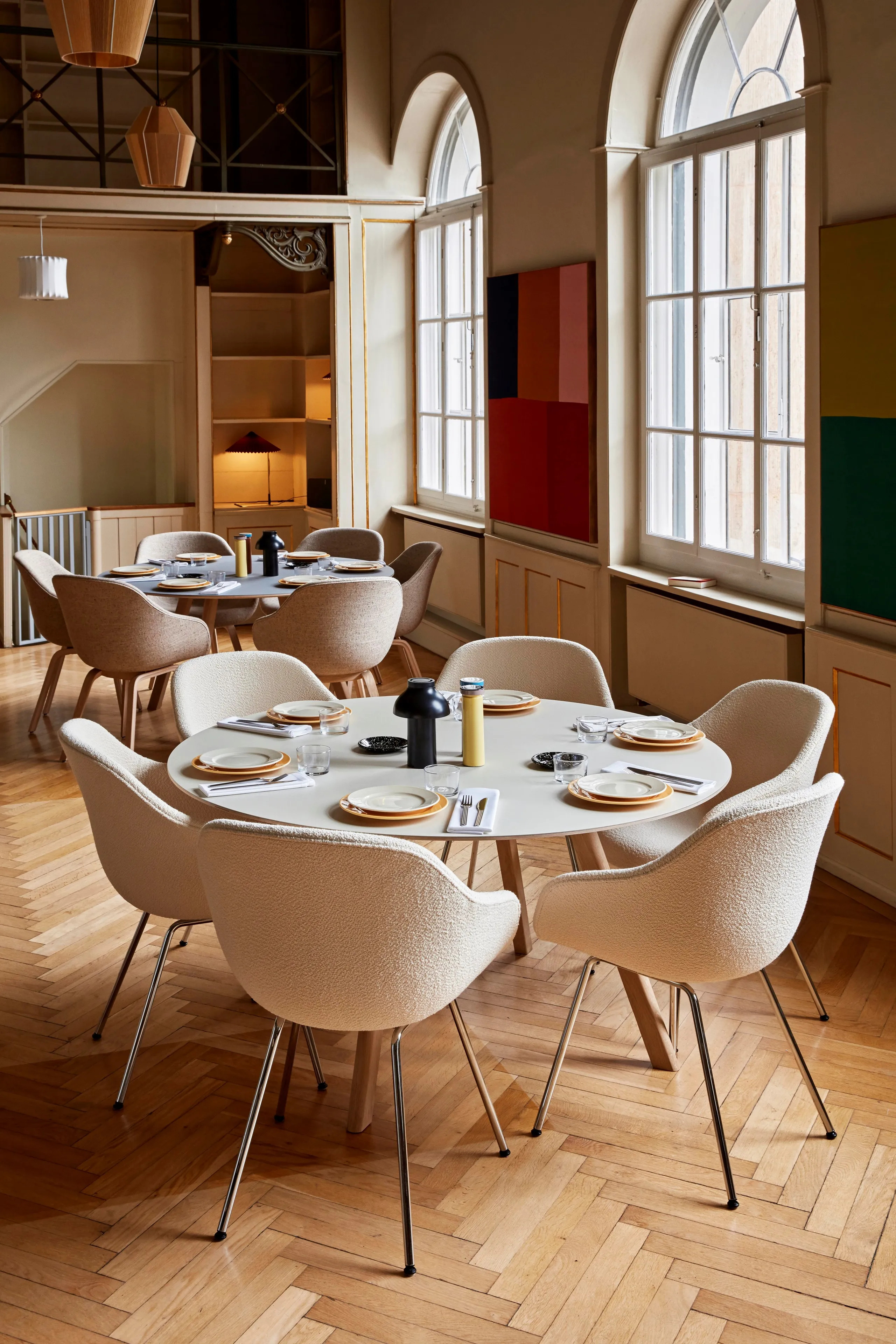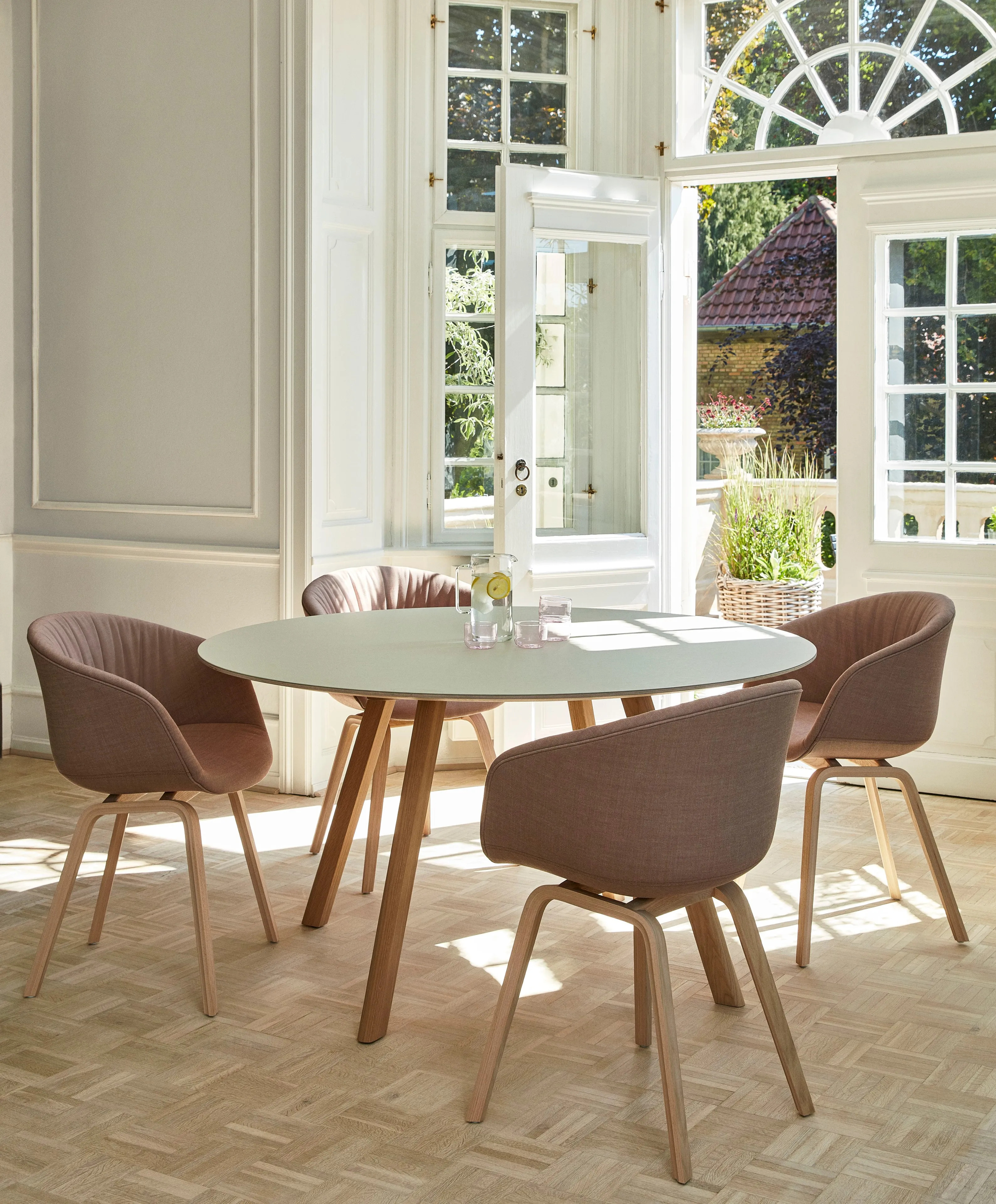 The COPENHAGUE CPH 25 ROUND table, designed by the Bouroullec brothers, features distinctive angled legs and a round tabletop that adds a softer touch to its engineered look. This versatile piece is ideal for various settings, from intimate meetings to larger café-like environments, seamlessly fitting into both private and public spaces. Available in multiple heights and sizes, the table offers options in soap-finished and lacquered oak, with tabletops crafted from veneer, laminate, or linoleum. The 24 mm plywood tabletop includes a bevelled edge, with the edge finish matching the frame. The solid wood legs incorporate non-visible, adjustable feet, extendable up to 12 mm, ensuring stability on uneven surfaces. This modern design table is a perfect addition to dining areas, conference rooms, and educational institutions, providing durable seating and ergonomic comfort.