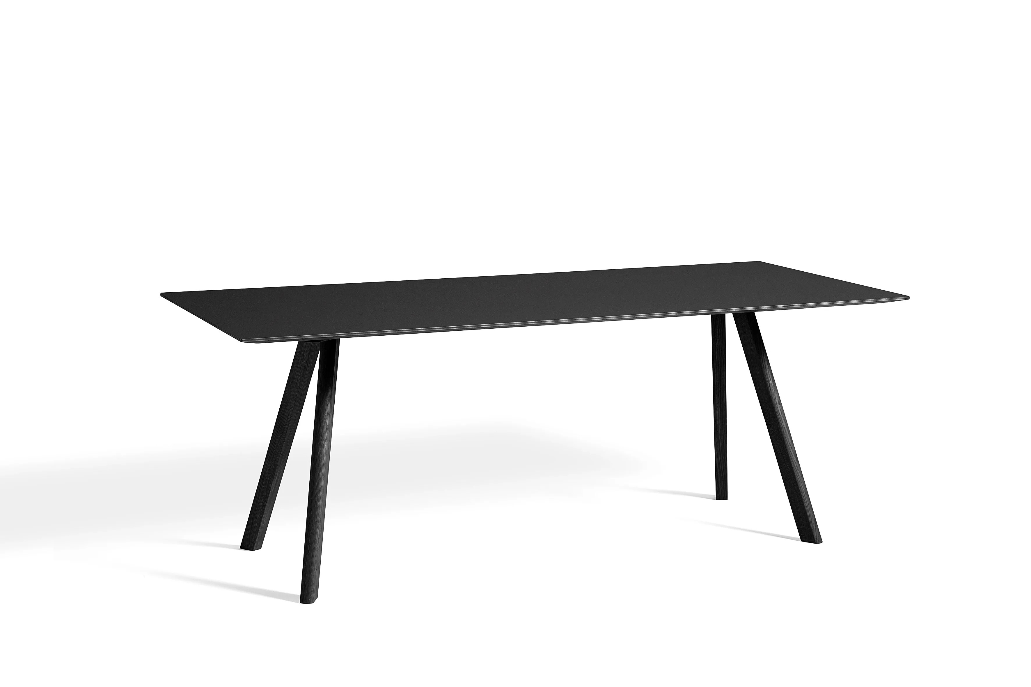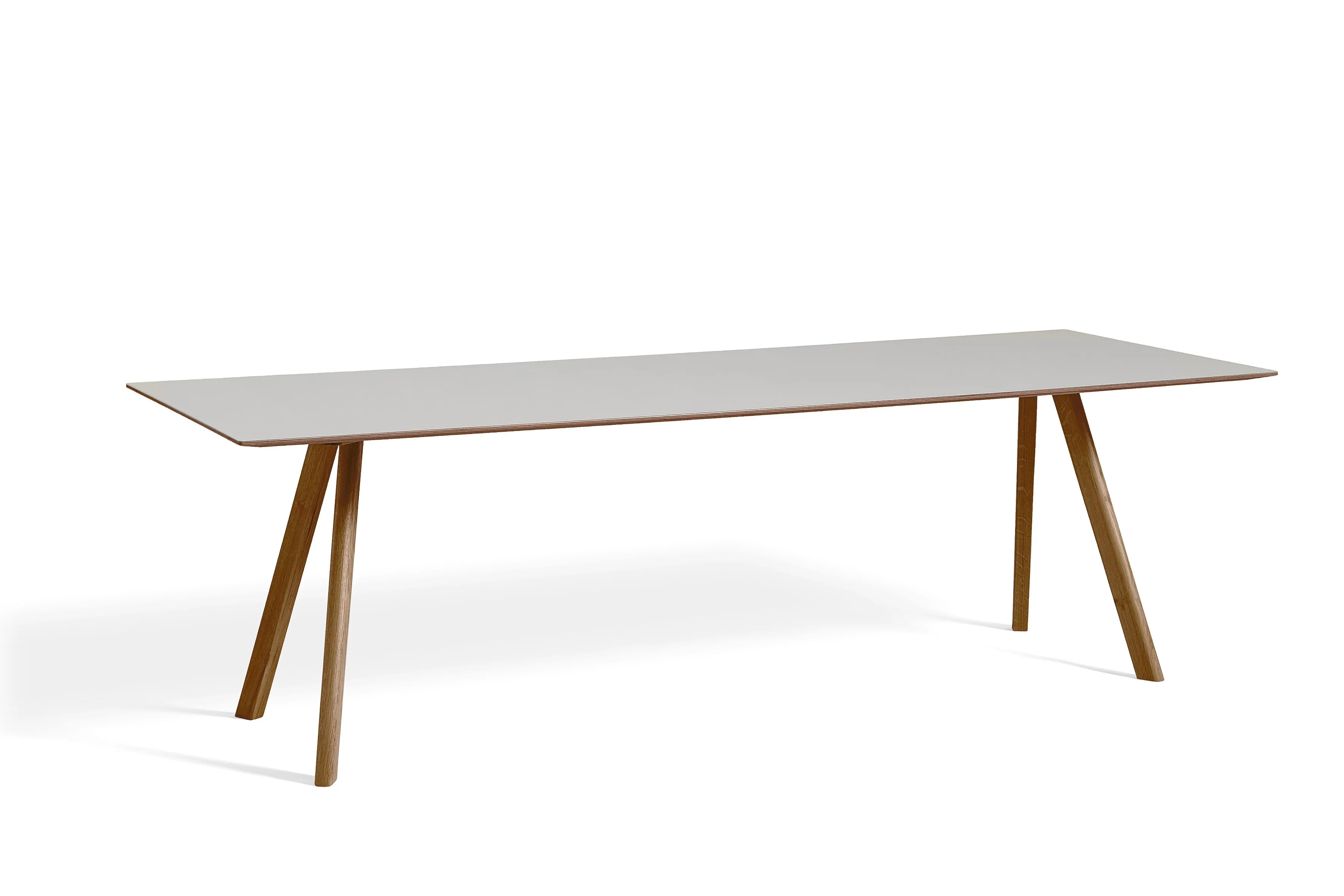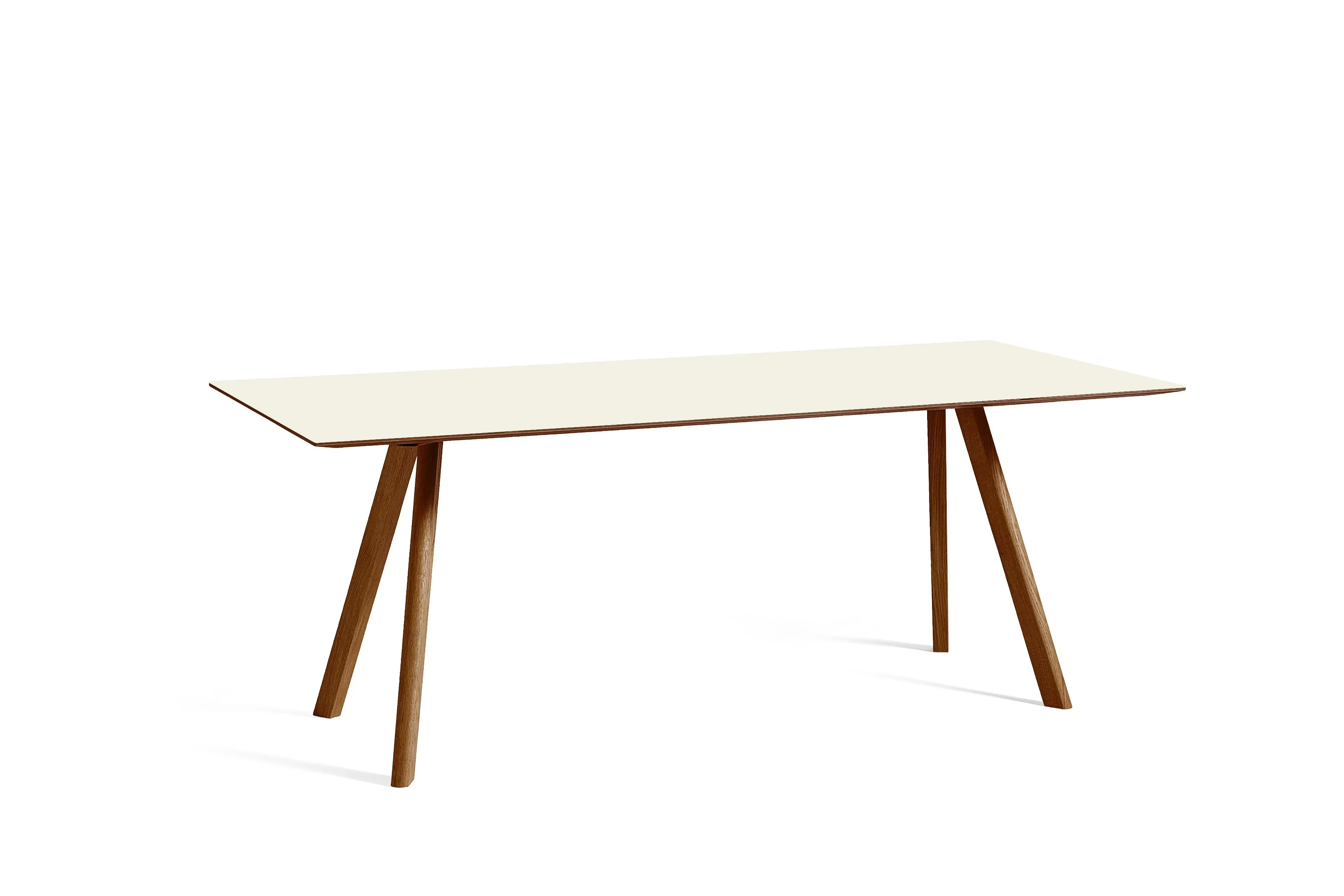 The CPH 30, part of the Copenhague collection by Ronan and Erwan Bouroullec, is distinguished by its angled legs and unique tabletop, making it suitable for diverse environments such as restaurants, conference rooms, and educational institutions. This modern design table is available in various sizes, featuring an oak frame with multiple finish options. The 24 mm plywood tabletop offers choices of laminate, linoleum, or veneer, each with a bevelled edge that complements the frame's finish. The solid wooden legs are slanted and include non-visible, adjustable feet, allowing for stability on uneven surfaces. This versatile piece serves as an ideal dining table, conference room furniture, or desk, providing durable seating and ergonomic support. The stackable chairs in the collection further enhance its functionality for cafés, coworking spaces, and event venues.