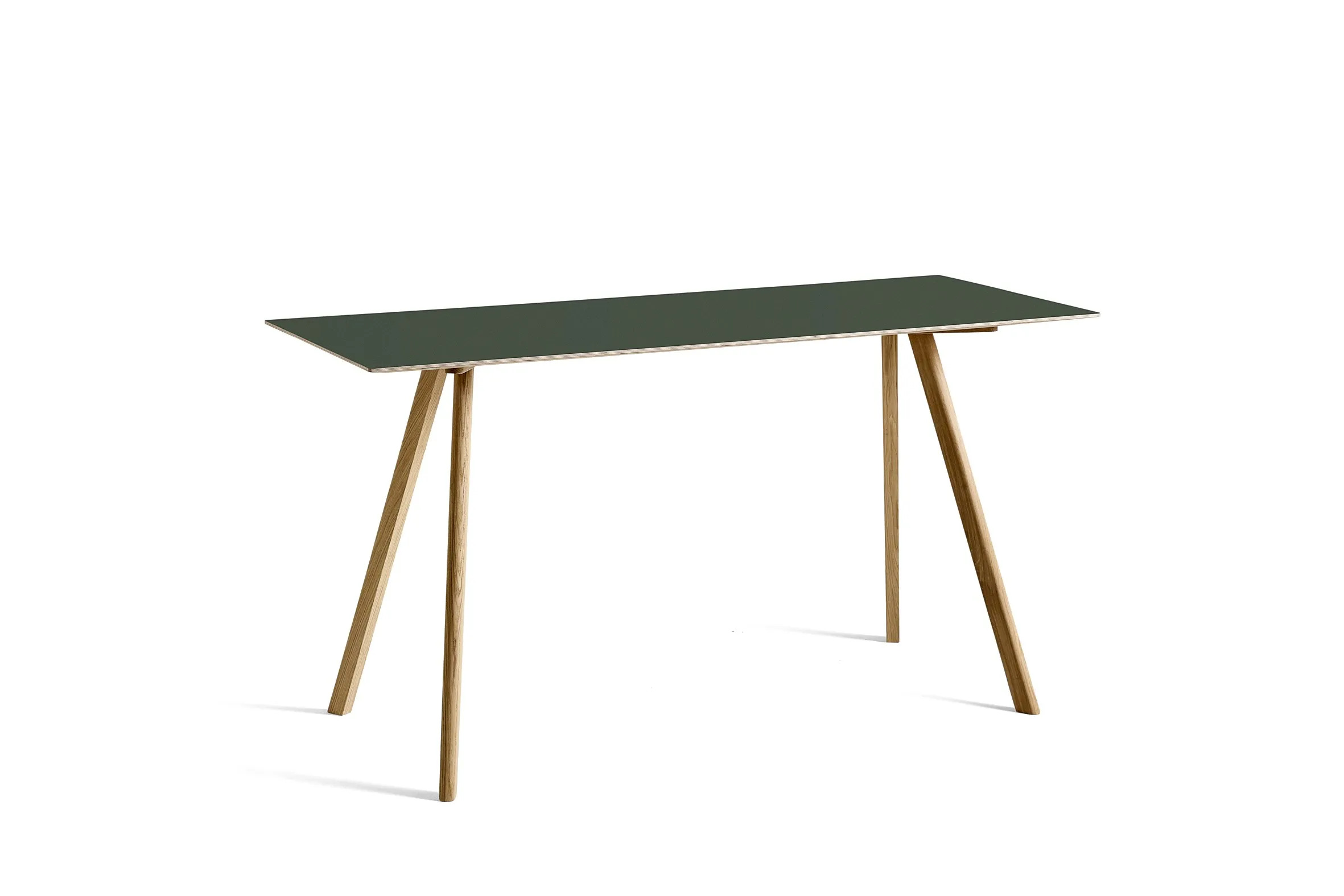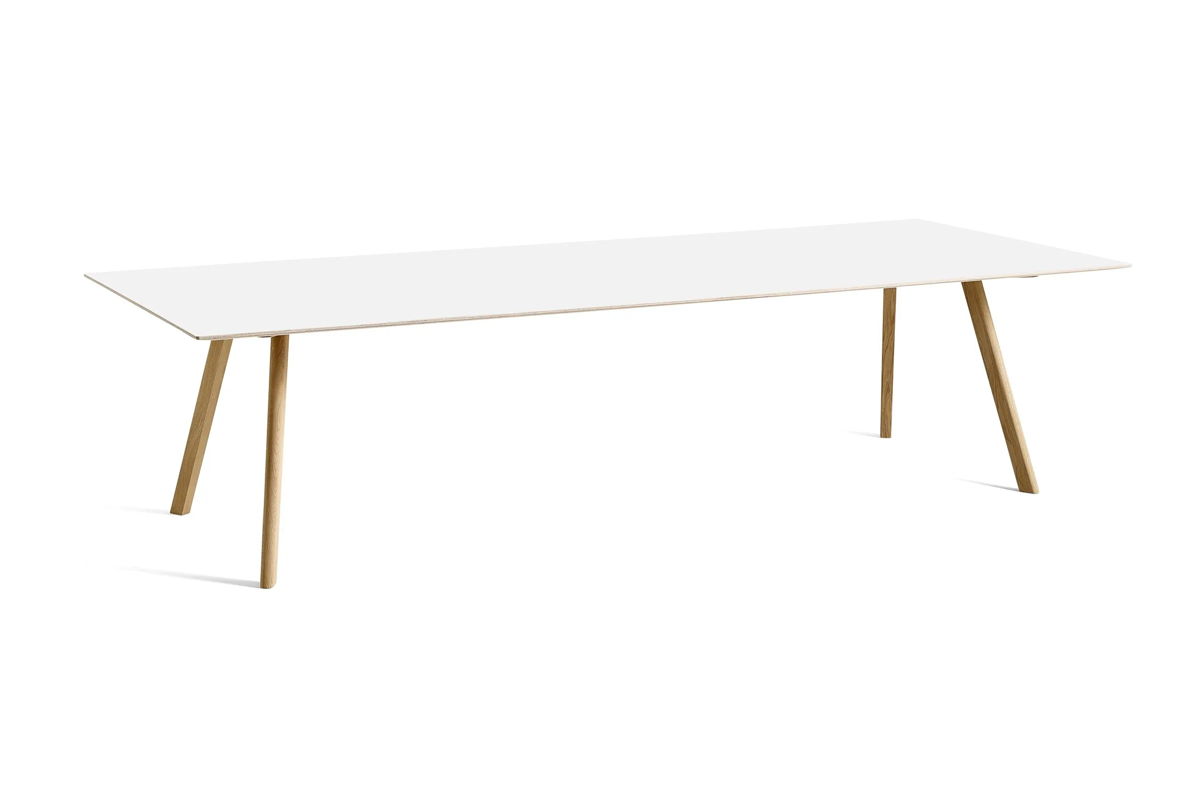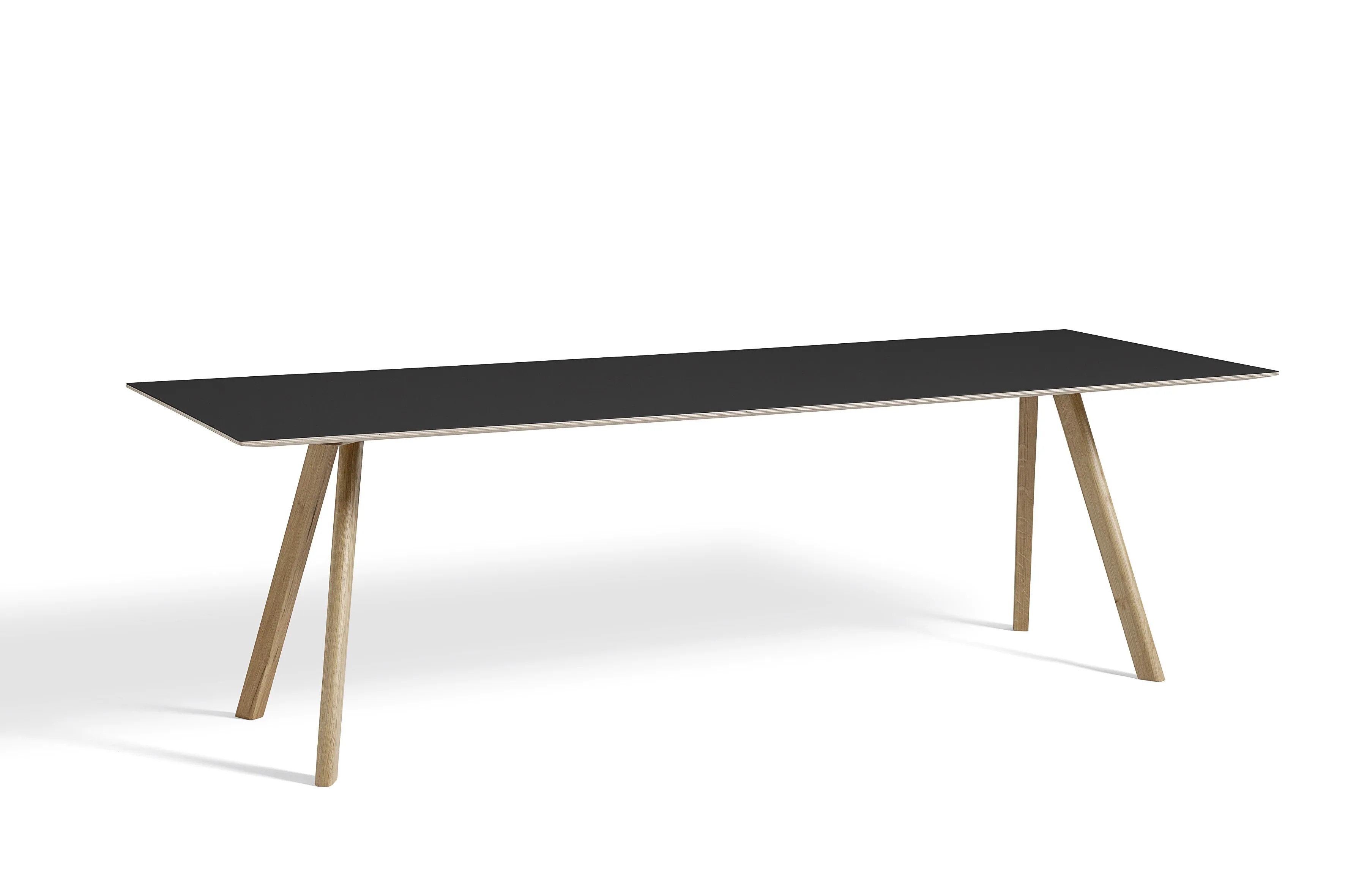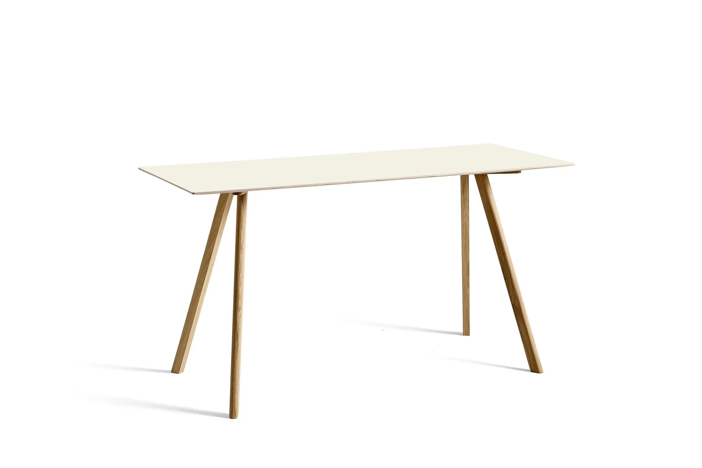 The CPH 30, part of the Copenhague collection by Ronan and Erwan Bouroullec, is distinguished by its angled legs and unique tabletop, making it suitable for diverse environments such as restaurants, conference rooms, and educational institutions. This modern design table is available in various sizes, featuring an oak frame with multiple finish options. The 24 mm plywood tabletop offers choices of laminate, linoleum, or veneer, each with a bevelled edge that complements the frame's finish. The solid wooden legs are slanted and include non-visible, adjustable feet, allowing for stability on uneven surfaces. This versatile piece serves as an ideal dining table, conference room furniture, or desk, providing durable seating and ergonomic support. The stackable chairs in the collection further enhance its functionality for cafés, coworking spaces, and event venues.