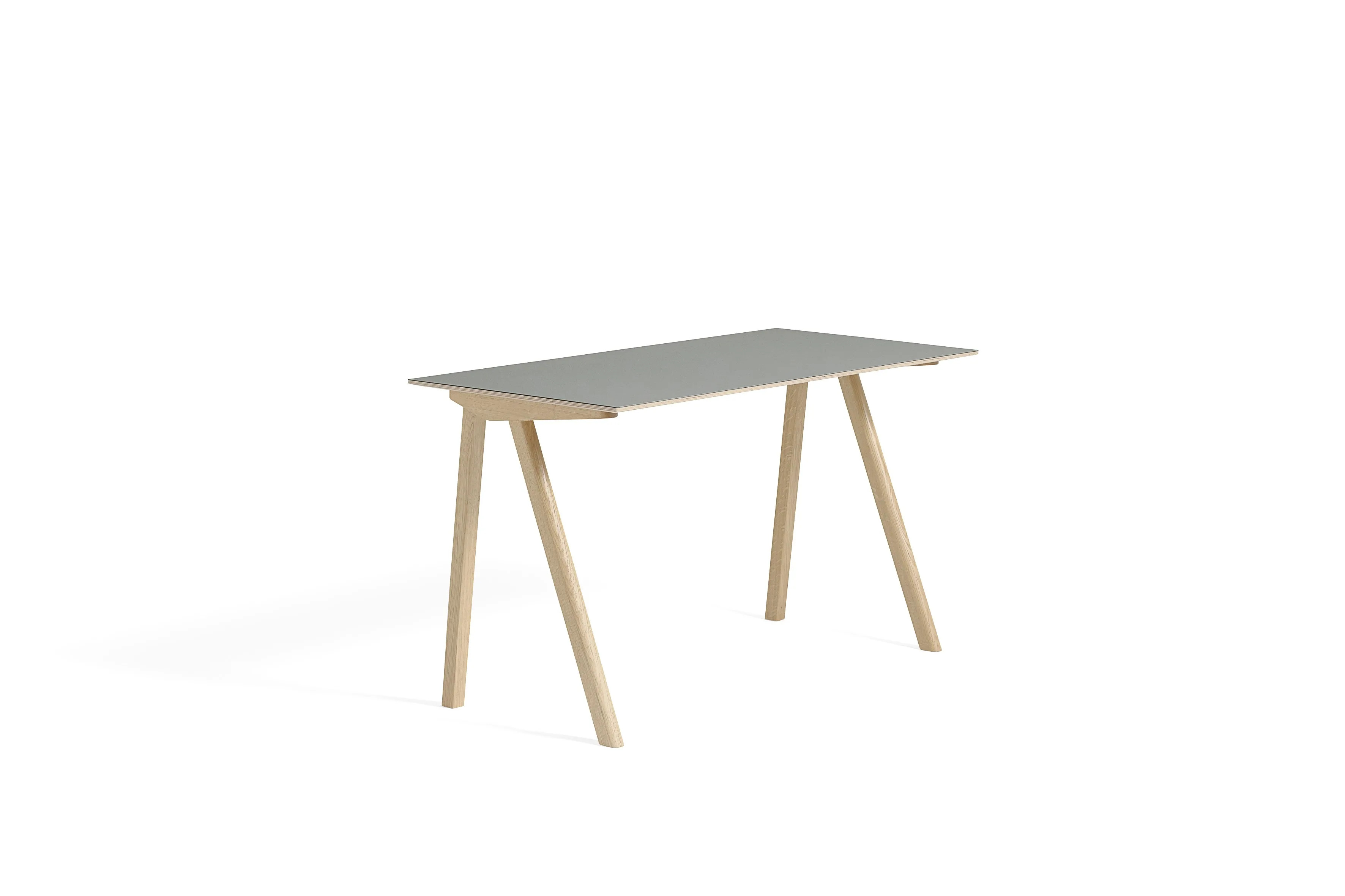 The CPH 90 seamlessly integrates classic desk aesthetics with a contemporary flair, making it a versatile choice for various settings such as restaurants, conference rooms, coworking spaces, cafés, event venues, and educational institutions. Designed by the Bouroullec brothers, its elegant asymmetrical legs and streamlined tabletop create a functional and compact design. The frame is crafted from solid oak, while the 18 mm plywood tabletop is available in a range of finishes, including laminate, linoleum, or veneer, with a beveled edge that complements the frame. The table's slanted wooden legs feature discreet, adjustable feet, allowing for stability on uneven surfaces. This modern design table is ideal for environments requiring durable seating and ergonomic, stackable chairs, enhancing the functionality of dining tables and café chairs in any professional setting.