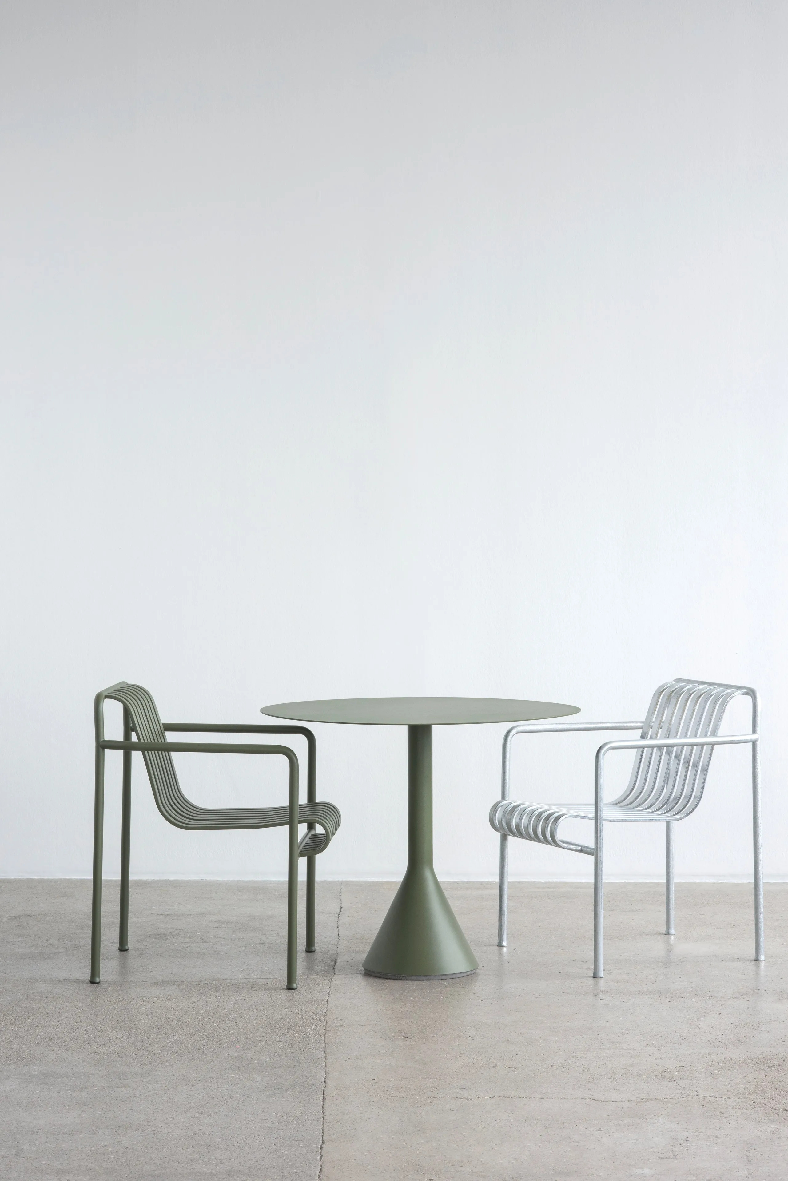 The PALISSADE CONE, designed by Ronan and Erwan Bouroullec in collaboration with HAY, is a versatile addition to any restaurant, conference room, coworking space, café, event venue, or educational institution. This modern design table features a solid concrete base and an ultra-thin, powder-coated steel tabletop, ensuring durability without compromising elegance. Available in round and square shapes, the table's robust construction is complemented by a protective outdoor primer, making it suitable for both indoor and outdoor settings. The collection offers three distinct colors: Anthracite, Olive, and Iron Red, allowing for seamless integration into various environments. Ideal for dining tables and café chairs, the PALISSADE CONE provides ergonomic and stackable seating solutions, enhancing the functionality of conference room furniture and other communal spaces.
