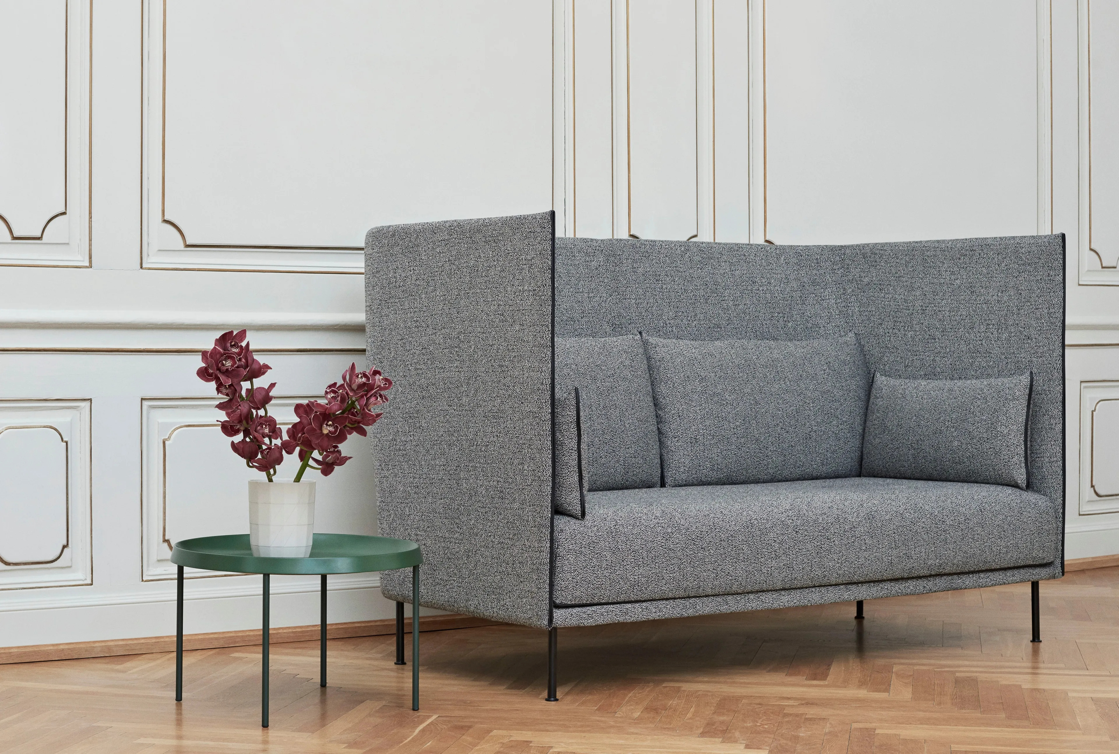The Silhouette High Back series by GamFratesi is distinguished by its elegantly curved back, merging robust character with a minimalist, organic design. Its angular front and detailed piping create a compact yet spacious appearance, offering ample seating. This collection includes various sizes and heights, with leg options in metal or solid wood, and a wide range of custom upholstery choices. Its modular design and strong structural language make it ideal for defining spaces and fostering intimacy in both private and public settings. The frame features a molded reinforced fiberglass shell with PU foam, while the seat cushions combine polyurethane foam with feather and foam pieces. Leg options include powder-coated steel, chromed steel, or solid oak, available in four finishes: black powder-coated steel, chromed steel, oiled solid oak, and smoked solid oak.