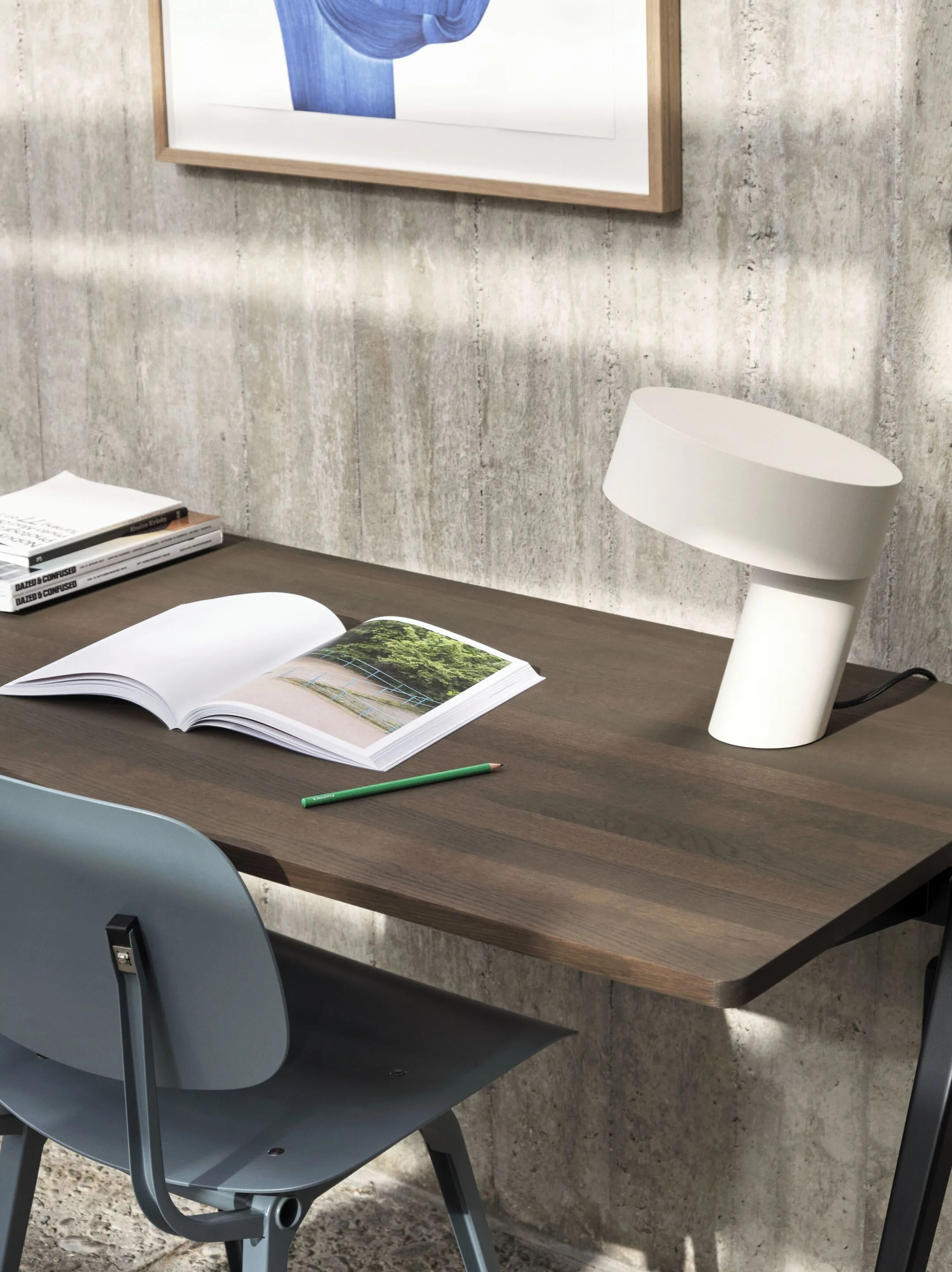 The SLANT lamp features a sleek, slanted cylindrical design with a weighted base, ensuring a perfectly balanced angle. Crafted from aluminum, it boasts a wet spray satin finish for a smooth, refined surface. This modern LED interior lighting solution conceals all components within its structure, preserving its clean and minimalist silhouette. The lamp utilizes a standard retrofit bulb, discreetly positioned behind an acrylic diffuser, which gently disperses ambient lighting throughout the space. Ideal for hotels, offices, retail spaces, restaurants, and residential interior design, SLANT embodies energy-efficient lighting designs and modern chandelier aesthetics, offering a sophisticated touch to any environment.