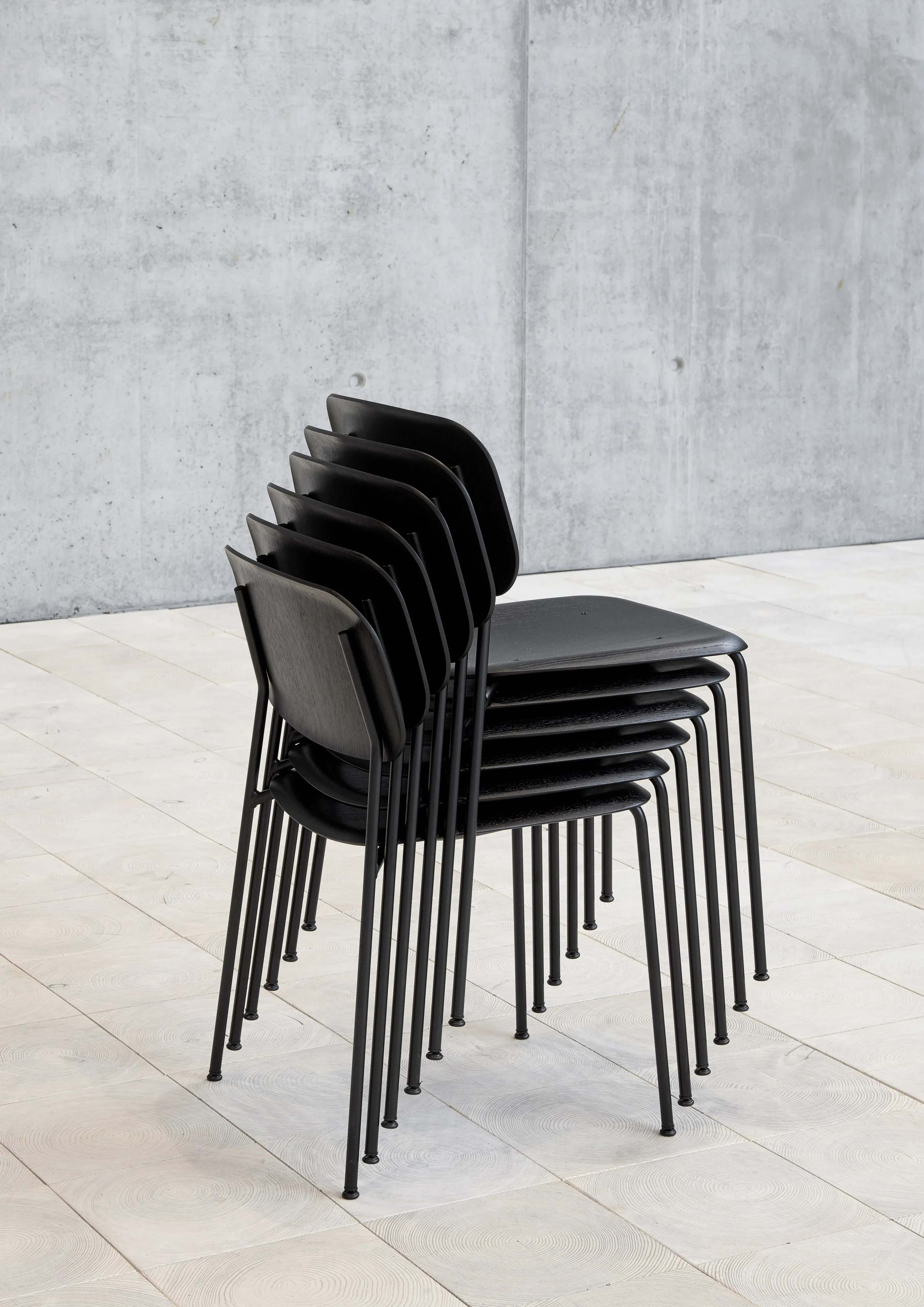 The Soft Edge 45 series by Iskos-Berlin combines an organically contoured seat and backrest, merging robust curves with a lightweight design to achieve a unique three-dimensional form. This modern design table and chair set prioritizes ergonomic comfort, accommodating natural movement and posture shifts. Featuring a wooden seat and back available in various finishes, paired with a sturdy steel base, it offers a clean aesthetic, stability, and practicality. Its durable seating and stackable chairs make it suitable for diverse environments, including restaurants, conference rooms, coworking spaces, cafés, event venues, and educational institutions. Constructed with moulded plywood and a 10 mm PU foam layer, supported by Ø16 mm steel tubing, it includes plastic gliders for compatibility with most flooring types.