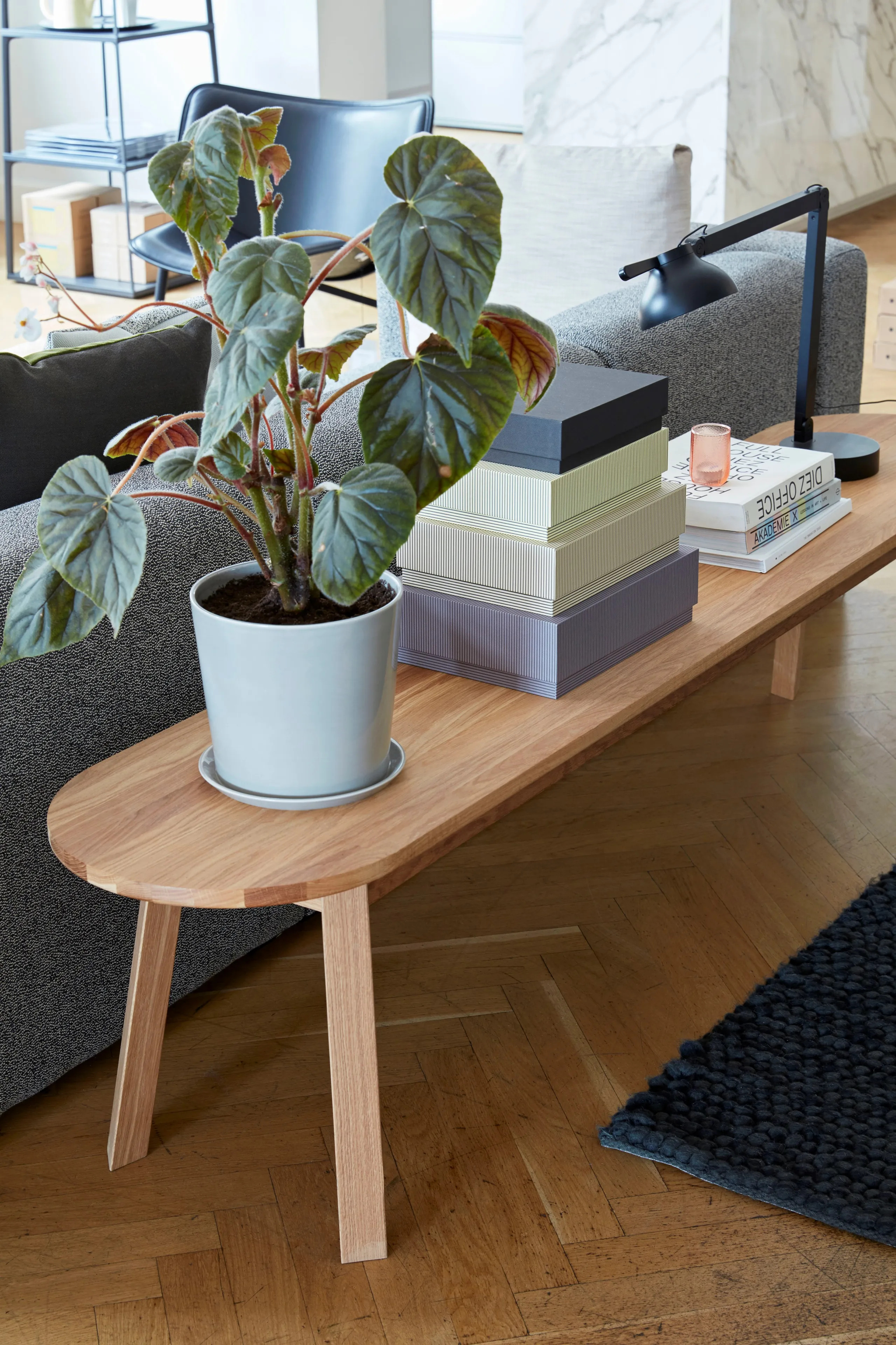 The TRIANGLE LEG series, designed by Simon Jones, offers a practical solution for maximizing seating around circular tables. This collection includes tables and benches with rounded rectangular ends, fostering a sociable atmosphere ideal for restaurants, conference rooms, coworking spaces, cafés, event venues, and educational institutions. Constructed from solid oak, the series is available in three finishes: water-based lacquer, soaped, and oiled. The 22 mm thick benchtop is supported by bars mounted underneath, ensuring durability. Each piece features four solid wooden legs with discreet, adjustable screw-in feet, allowing for up to 12 mm of extension to accommodate uneven surfaces. This modern design is perfect for dining tables, café chairs, and other conference room furniture, offering both style and functionality in various settings.