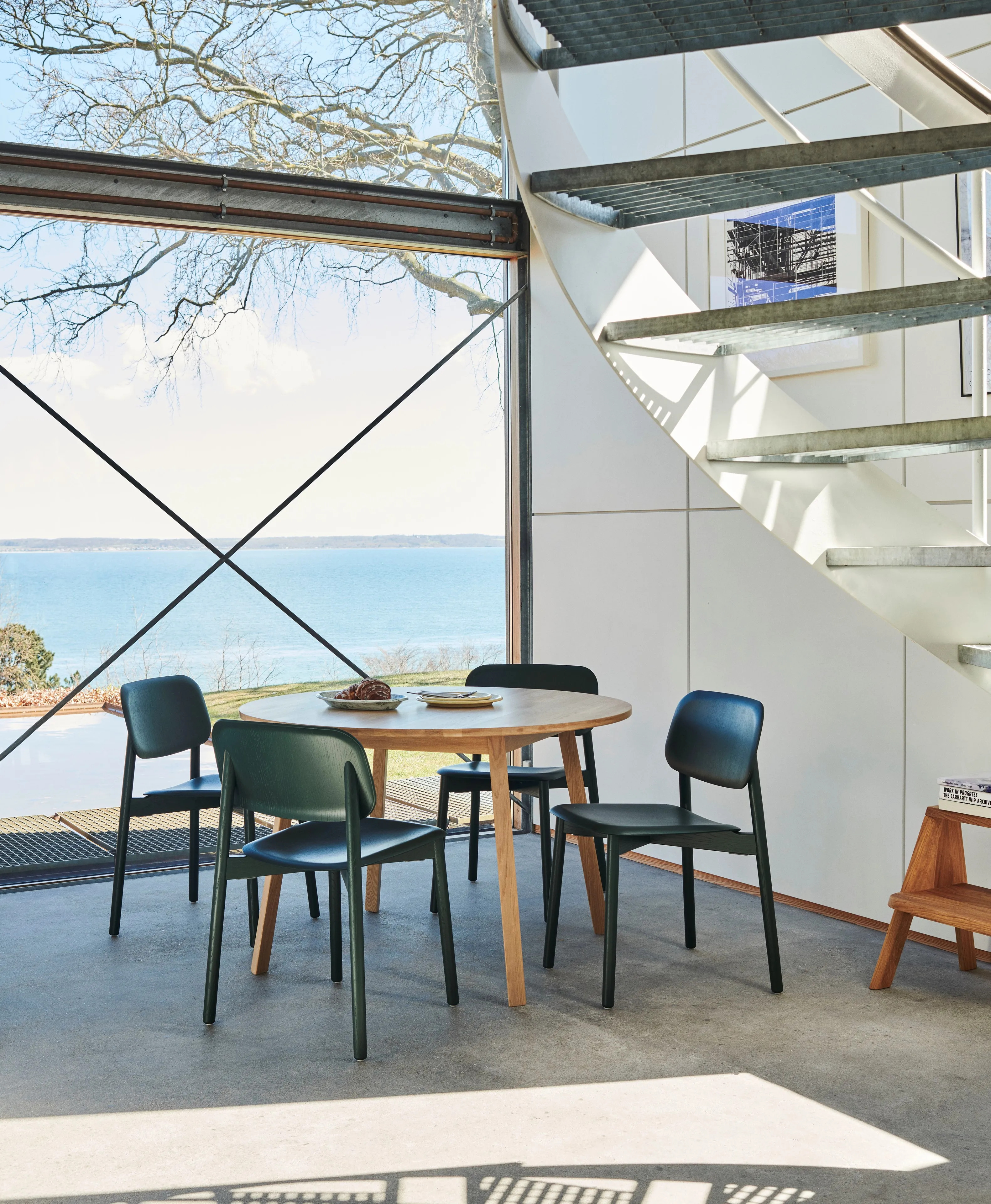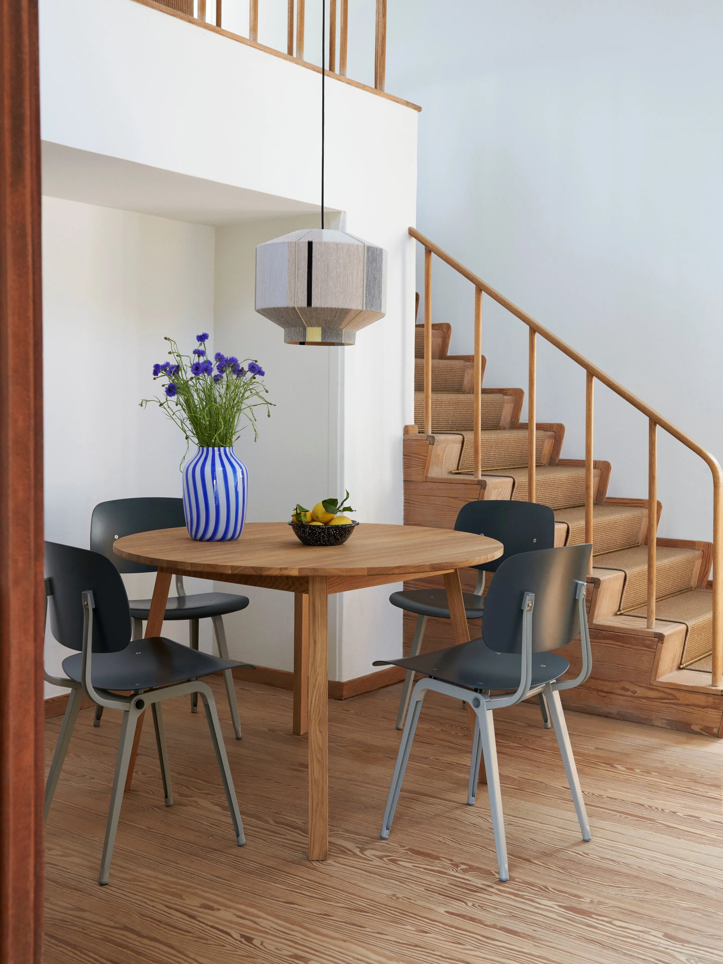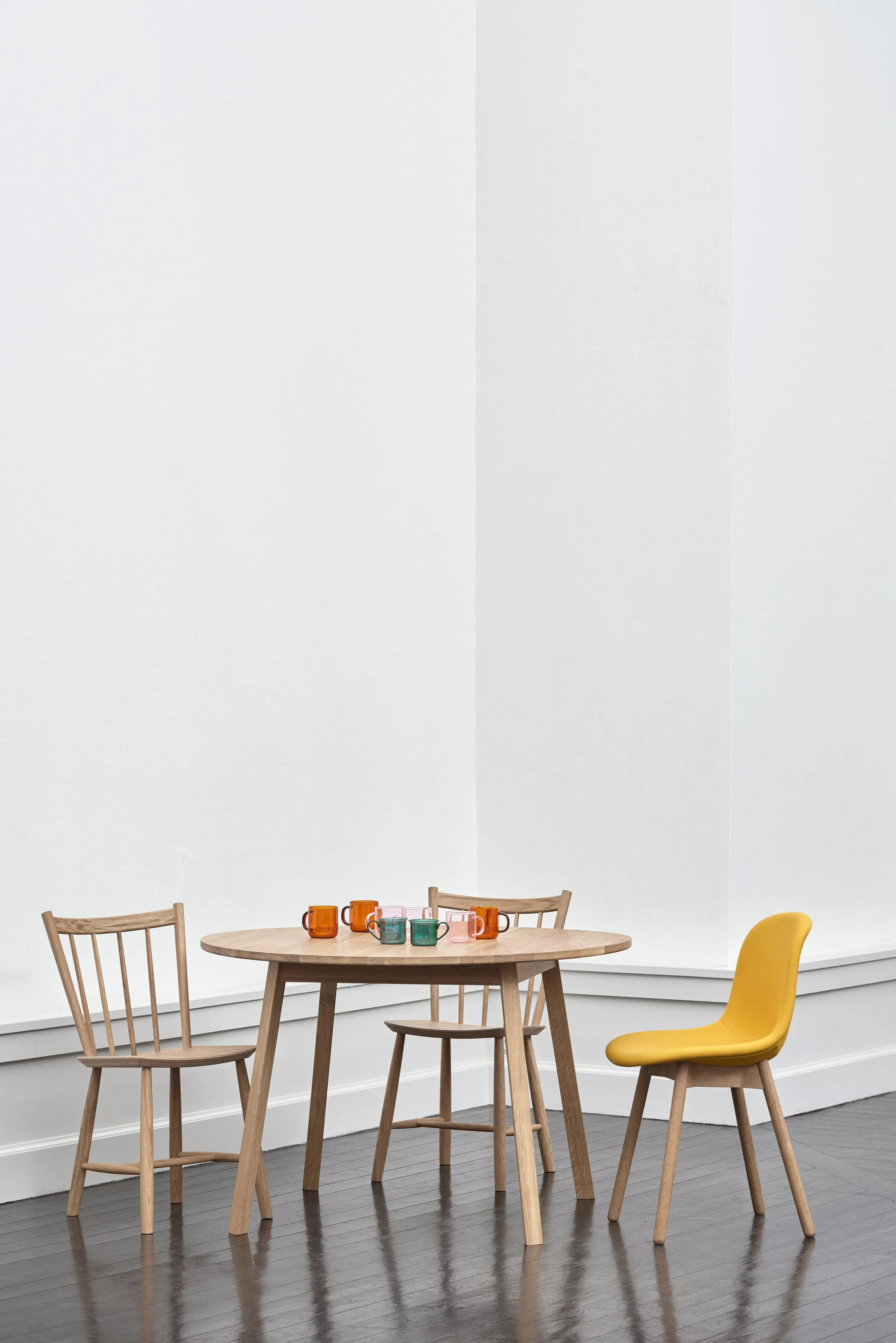 The TRIANGLE LEG series, designed by Simon Jones, optimizes space around circular tables, making it ideal for restaurants, conference rooms, coworking spaces, cafés, event venues, and educational institutions. The series features a table and bench with rounded rectangular ends, enhancing social interaction and maximizing seating capacity. Constructed from solid oak, the tabletop is available in various finishes, including oiled, soaped, or clear lacquer. The 22 mm thick tabletop is supported by bars mounted underneath, ensuring stability. The frame consists of four solid wooden legs with discreet, adjustable screw-in feet, allowing for up to 12 mm of extension to accommodate uneven surfaces. This modern design is available in three finishes: water-based lacquered solid oak and oiled solid oak, offering a durable and stylish solution for dining tables, café chairs, and conference room furniture.