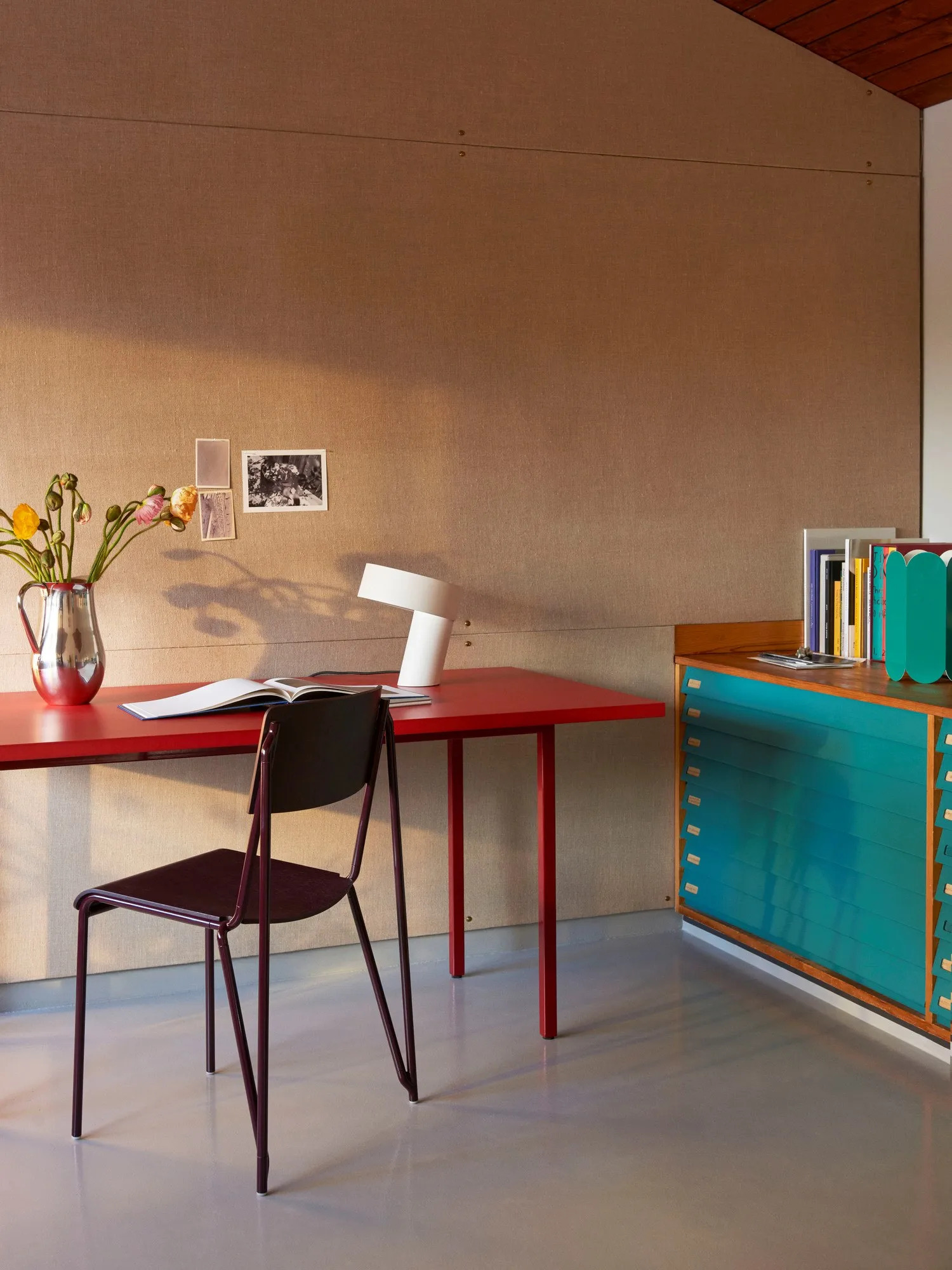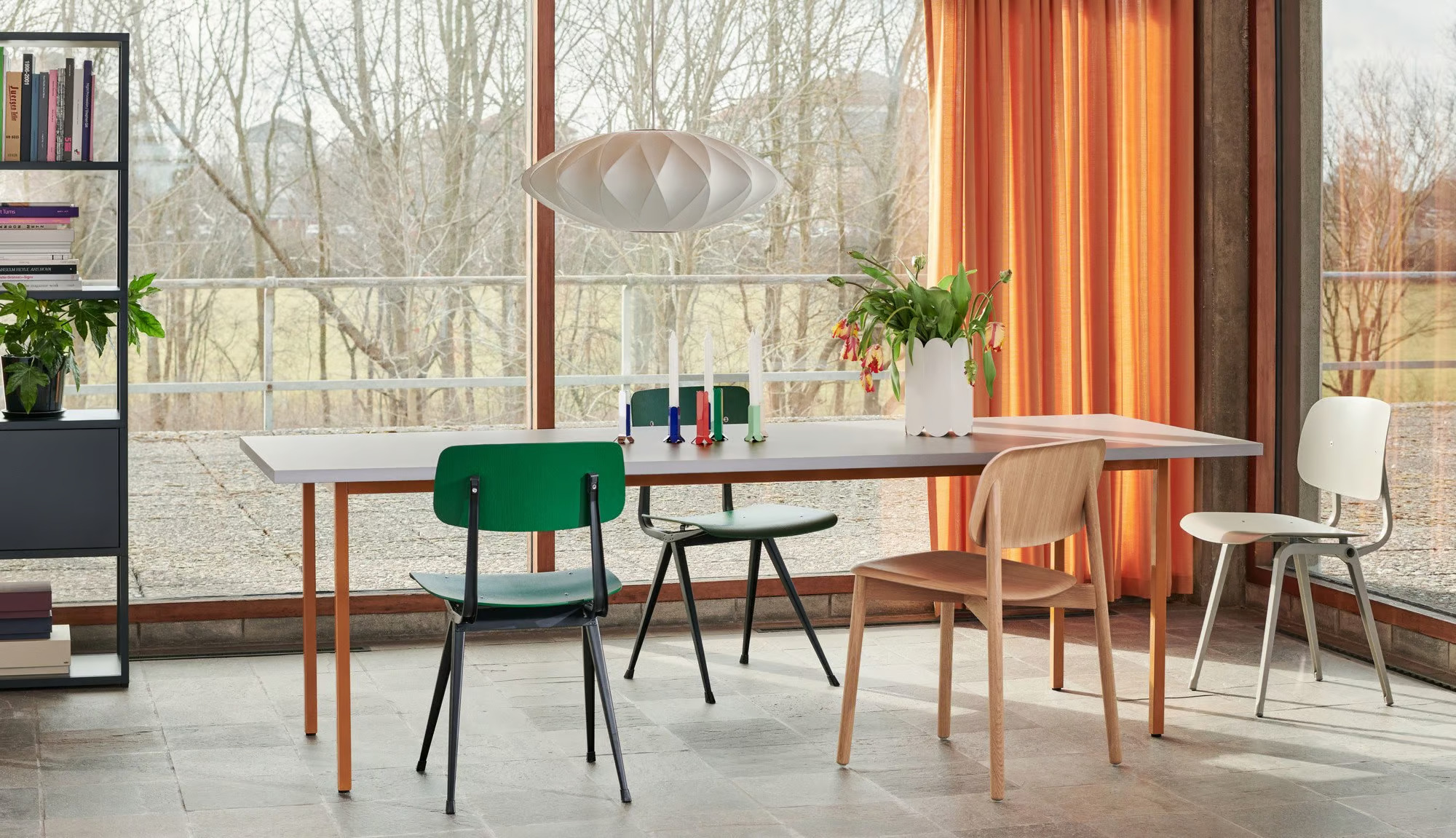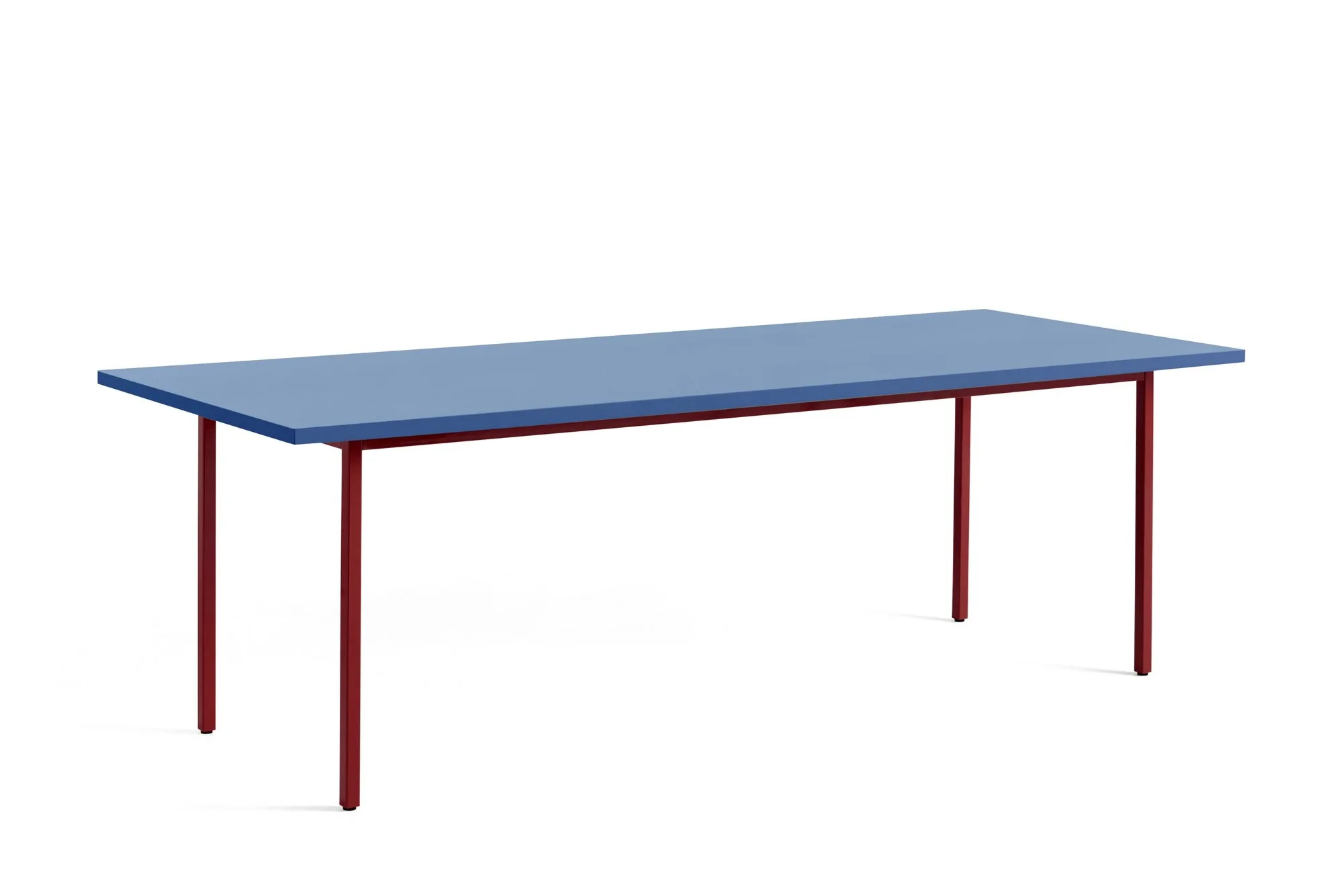 The Two-Colour series, designed by Belgian duo Muller Van Severen, showcases a harmonious blend of materials, emphasizing both contrast and cohesion. This collection features modern design tables with steel tube legs, ensuring durability and stability, ideal for dining tables in restaurants or conference room furniture. The table surface is crafted from 30 mm Valchromat, an organic colored MDF material, enhanced with a water-based lacquer and subtle color pigments, revealing visible wood fibers. The uniform silhouette is accentuated by contrasting colors, available in various shapes and sizes, making it suitable for diverse settings such as cafés, coworking spaces, and educational institutions. The powder-coated steel frame supports both round and rectangular tables, with integrated screw-in adjustable gliders for added convenience. The stackable chairs complement the tables, offering ergonomic and durable seating solutions for any venue.
