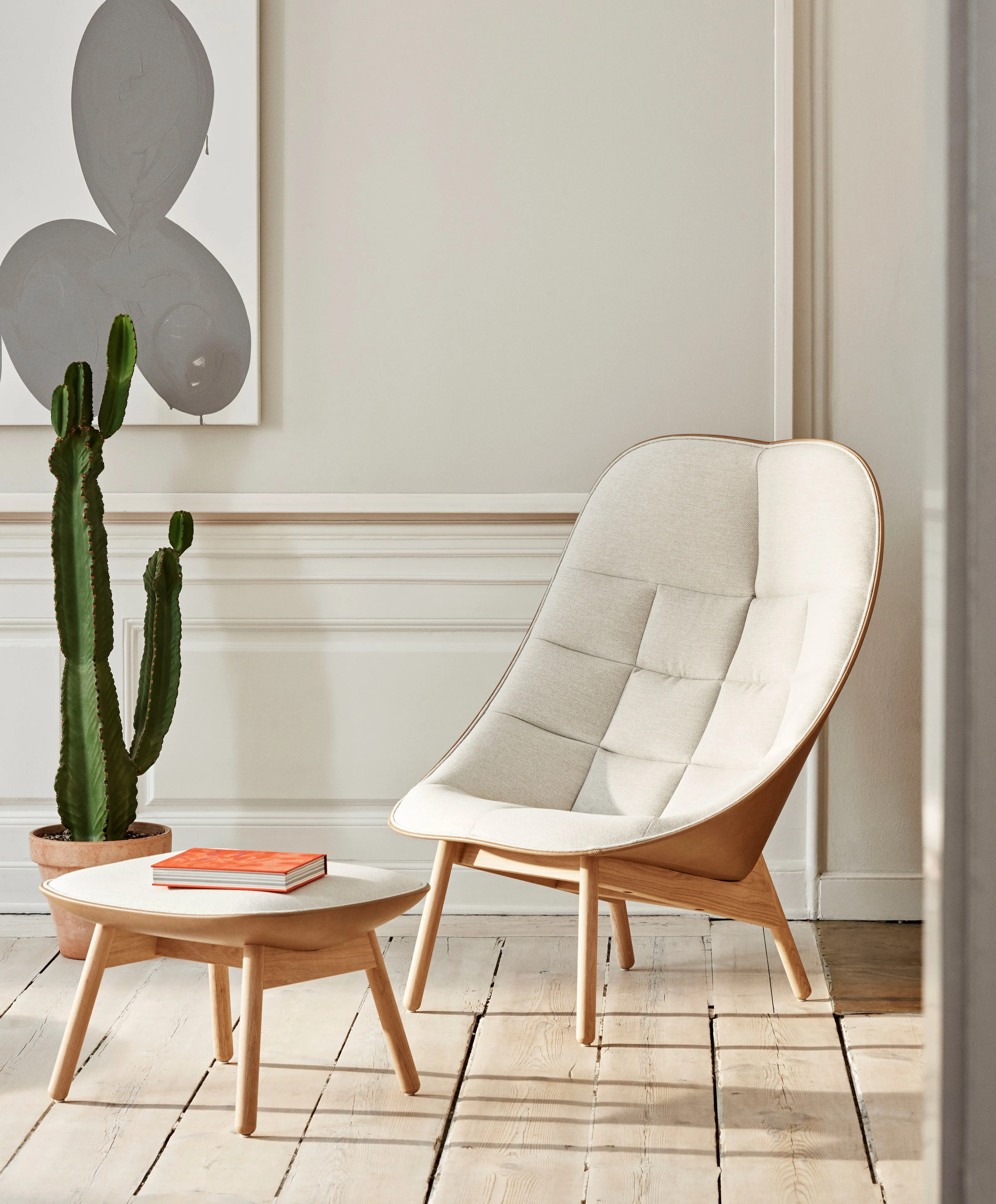 The UCHIWA QUILTED armchair draws inspiration from the traditional Japanese hand fan, offering a spacious and welcoming design. Ideal for hotels, cafés, lounges, and waiting rooms, this piece of modern lounge furniture is available in two upholstered versions: a softer quilted model suited for residential interiors and a moulded foam variant for more demanding environments. The ergonomic design ensures comfortable seating solutions, while the solid oak base, available in natural or stained finishes, adds a touch of elegance. This luxury armchair features a quilted shell with moulded HR polyurethane foam and a wadding layer for added volume, making it a versatile choice for custom upholstery and modular sofa arrangements in compact spaces.