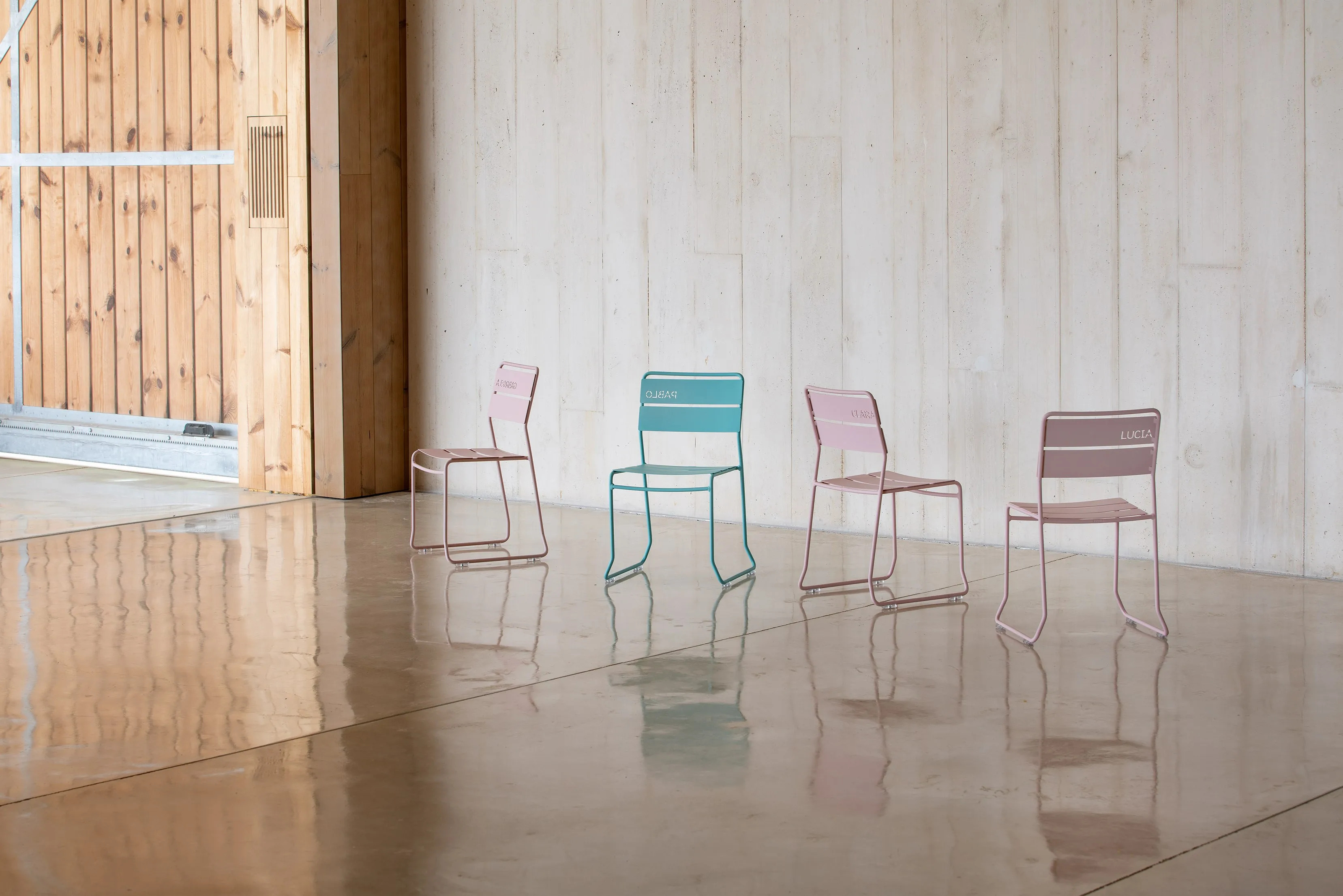 The PORTOFINO KIDS PERSONALIZED collection offers a versatile solution for various settings, including restaurants, conference rooms, coworking spaces, cafés, event venues, and educational institutions. Crafted from galvanized steel, these dining tables and café chairs feature a modern design with a playful and colorful aesthetic inspired by the Mediterranean. The collection includes ergonomic and stackable chairs, ensuring both comfort and practicality. The durable seating is designed for intensive use and is weather-resistant, making it suitable for both indoor and outdoor environments. The materials used are 100% recycled and recyclable, emphasizing environmental responsibility. The collection is available in sets of four, providing a cohesive and stylish option for any space.