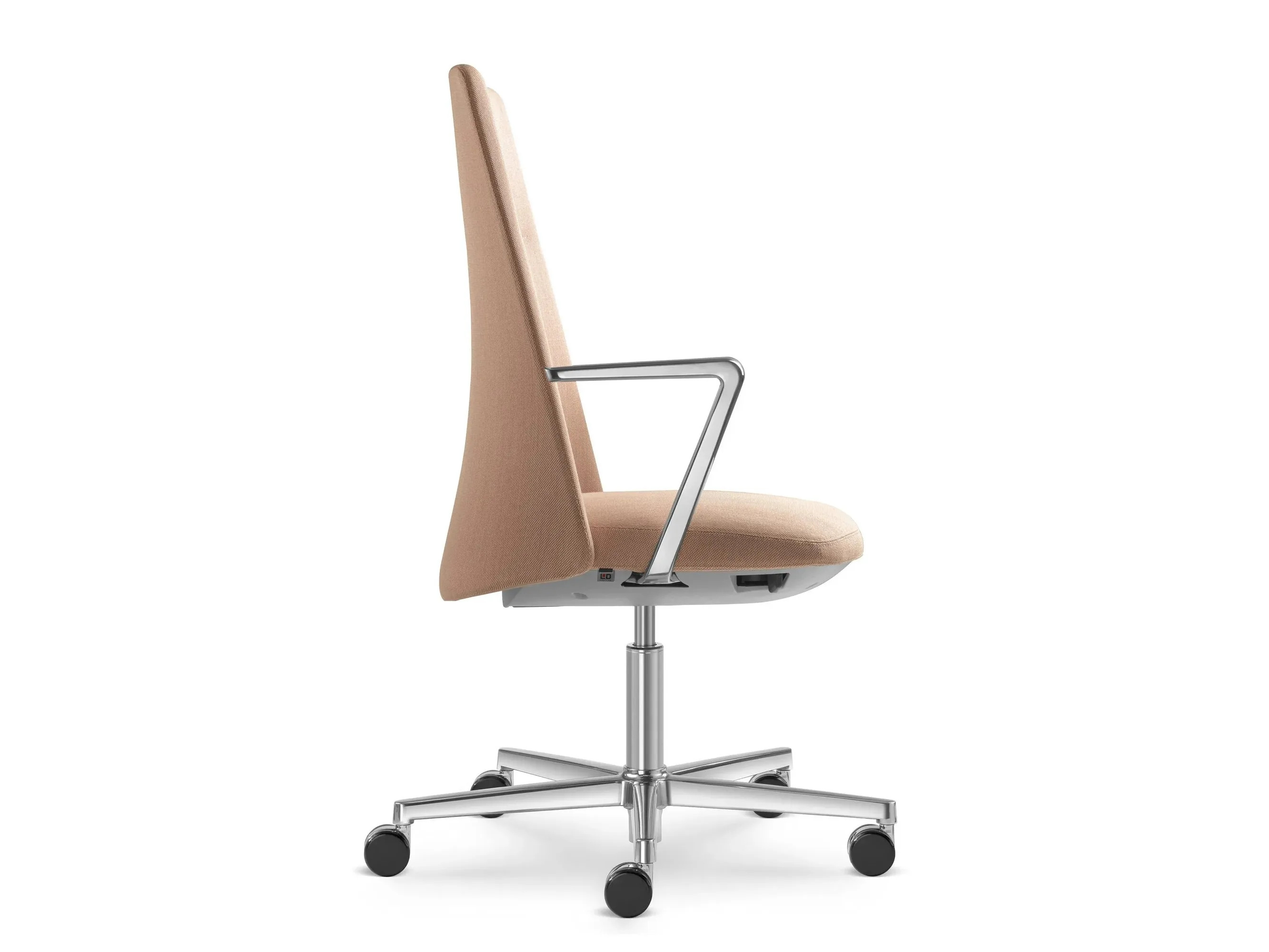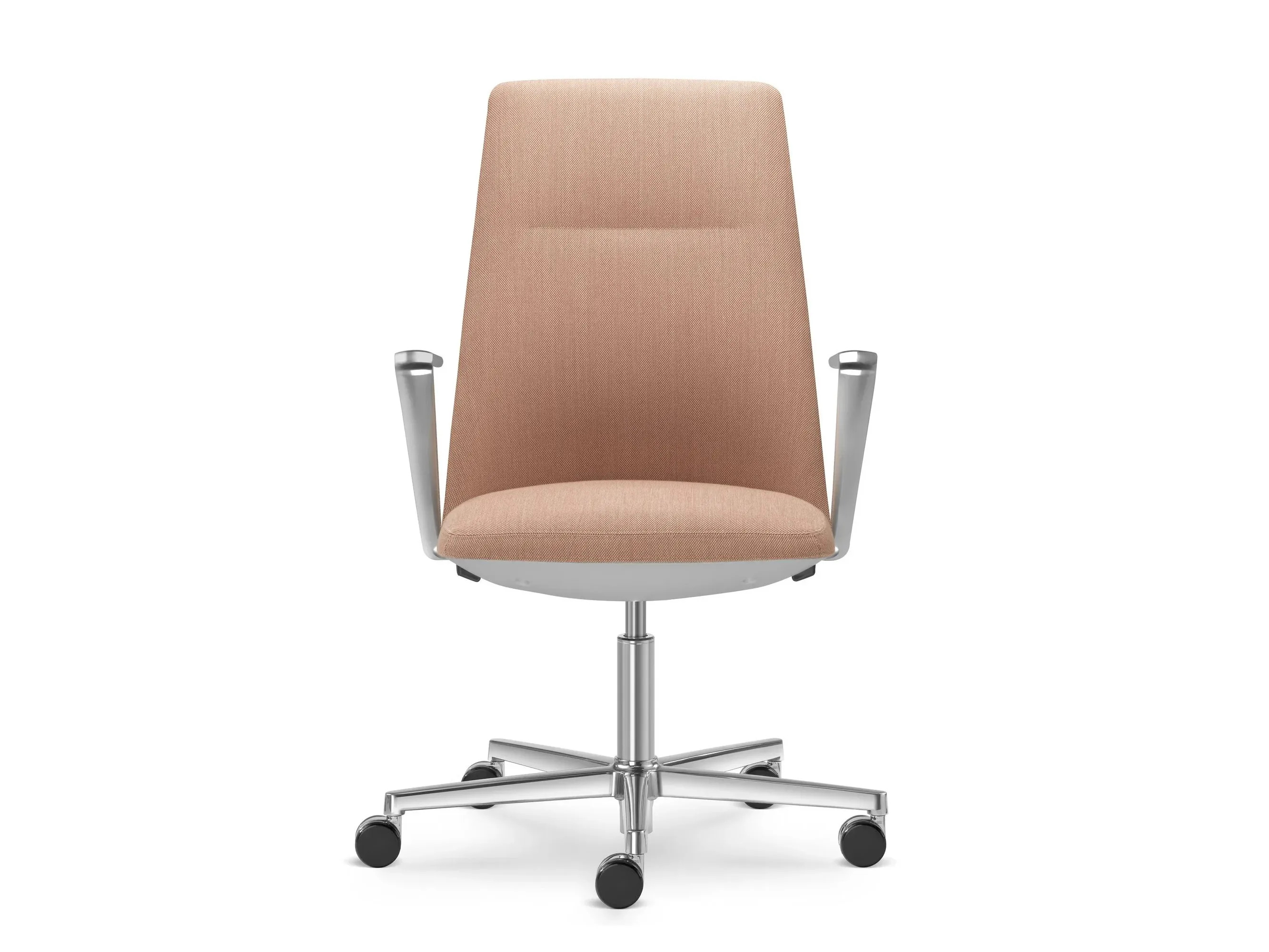 The MELODY DESIGN 785-FR F40-N6 is an ergonomic office chair featuring a height-adjustable swivel design with a medium backrest. It includes an upholstered seat and backrest, complemented by a hidden synchronous mechanism that automatically adjusts backrest tension based on user weight, with manual tension adjustment available via an enclosed key. This model, designed by the Italian studio Orlandini, showcases a polished 5-star aluminum base and black castors with a diameter of 60 mm. The chair's sophisticated upholstery highlights the beauty of unique fabrics, while the hidden mechanics enhance its modern aesthetic. Ideal for corporate offices, coworking spaces, and educational institutions, the MELODY DESIGN series also offers a conference chair with a wooden base, catering to diverse collaborative workspace furniture needs.