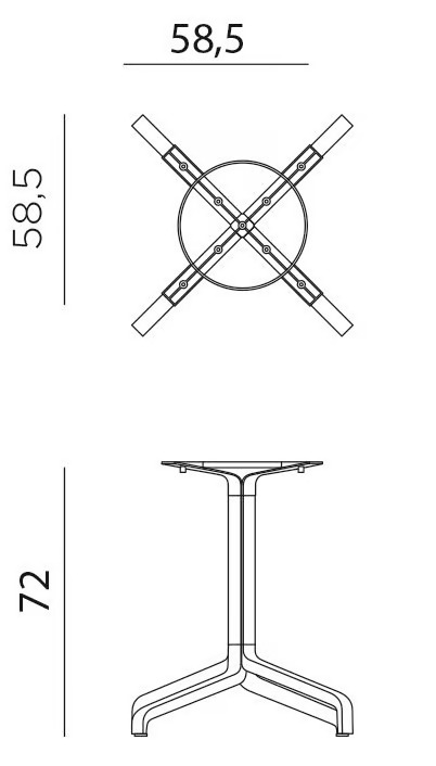 The BASE FRASCA MAXI FIX is a versatile and robust furniture component designed for professional environments. Featuring a coated aluminum 4-foot central leg, it is engineered to support a variety of laminate tops, including Ø80, 80x80 cm, Ø90, 90x90 cm, Ø100, and 100x100 cm sizes, making it suitable for diverse settings such as restaurants. Its design, reminiscent of an inverted tree, combines aesthetic appeal with high-performance technical features. The mini version accommodates Ø60, Ø70, 60x60 cm, and 70x70 cm tops, which can be tilted and stacked horizontally, thanks to its offset feet. This design facilitates easy stacking for space-saving and cleaning purposes. The BASE FRASCA MAXI FIX offers exceptional practicality and adaptability, making it an ideal choice for bars, restaurants, and public spaces.