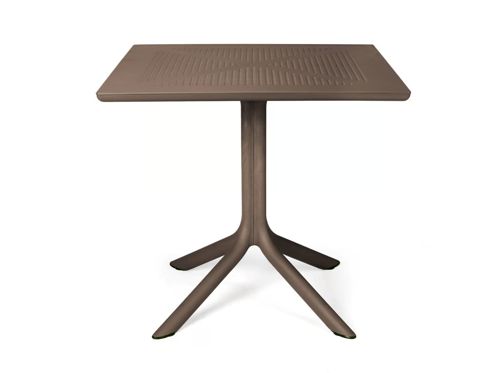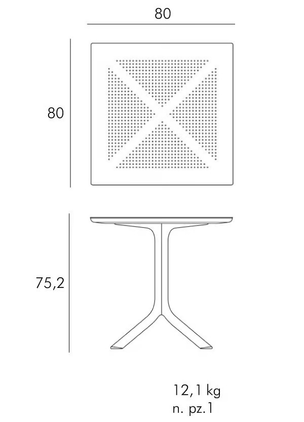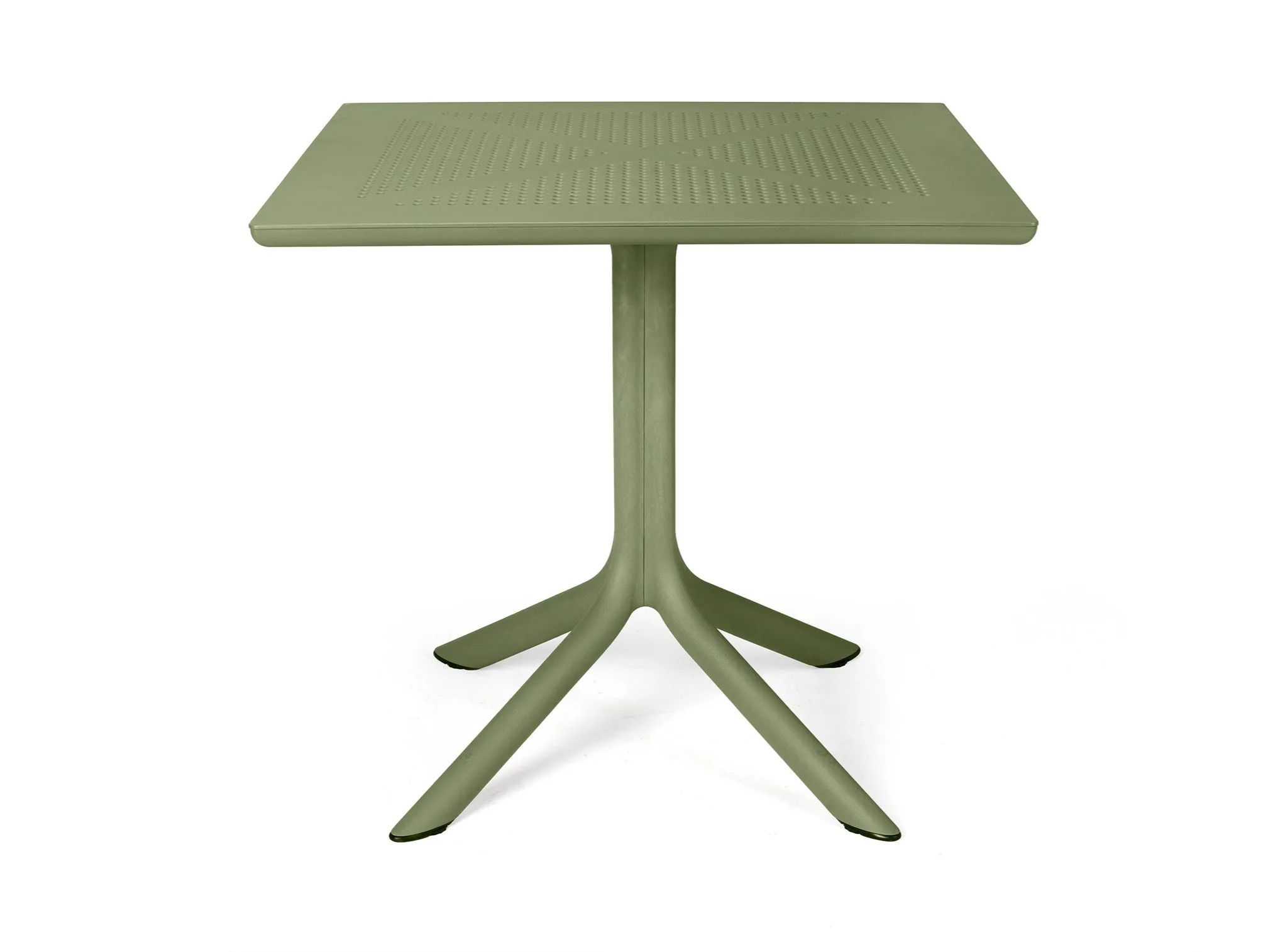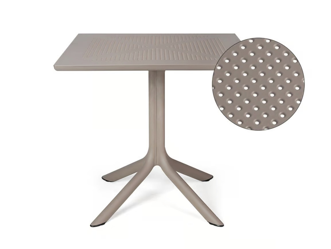 The CLIP 80 is a versatile square table crafted from fiberglass resin, featuring a central support with four spokes and a DurelTop tabletop. Its photo-engraved surface showcases a round perforated pattern, offering a modern design suitable for various settings. Ideal for restaurants, conference rooms, coworking spaces, cafés, event venues, and educational institutions, this table is designed to maximize space efficiency. Complementing the table, the collection includes colorful, round low tables with three legs, perfect for both indoor and outdoor use. These tables are easy to assemble and disassemble with a single slot system, requiring no maintenance. The CLIP 80 pairs seamlessly with ergonomic, stackable café chairs, providing durable seating solutions for any environment.