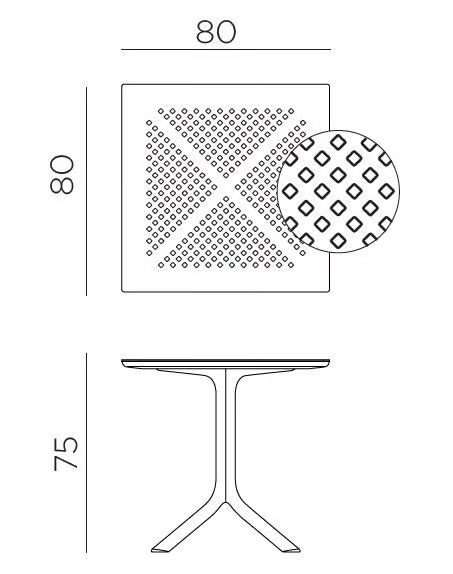 The CLIPX 80 is a versatile square table crafted from fiberglass resin, featuring a central support with four spokes and a DurelTop tabletop. Its photo-engraved diamond perforated pattern adds a touch of modern design, making it suitable for various settings such as restaurants, conference rooms, coworking spaces, cafés, and event venues. This table is designed to occupy minimal space, making it ideal for both indoor and outdoor use, including terraces and gardens. The ergonomic and stackable café chairs complement the table, offering durable seating solutions for educational institutions and banquet halls. Easy to assemble and disassemble with a single slot system, these tables and chairs require no maintenance, ensuring long-lasting functionality.