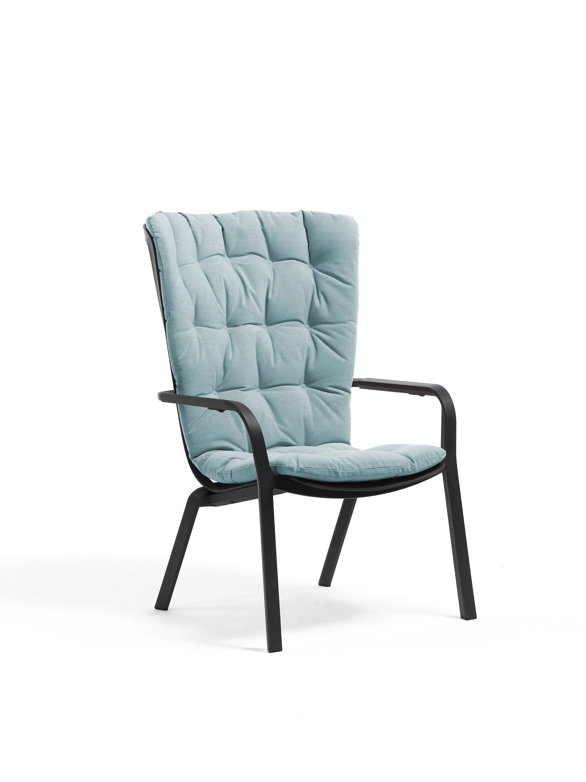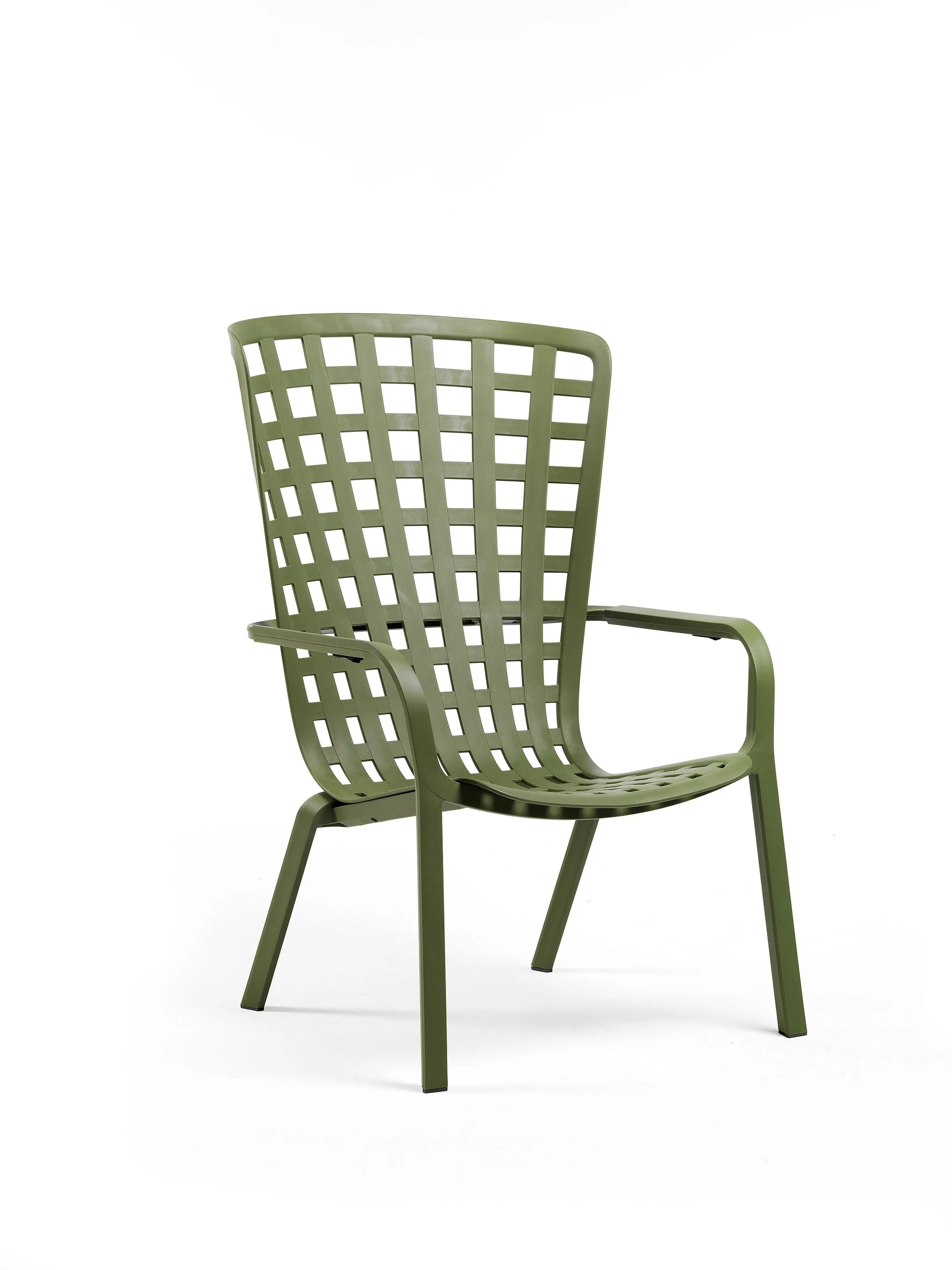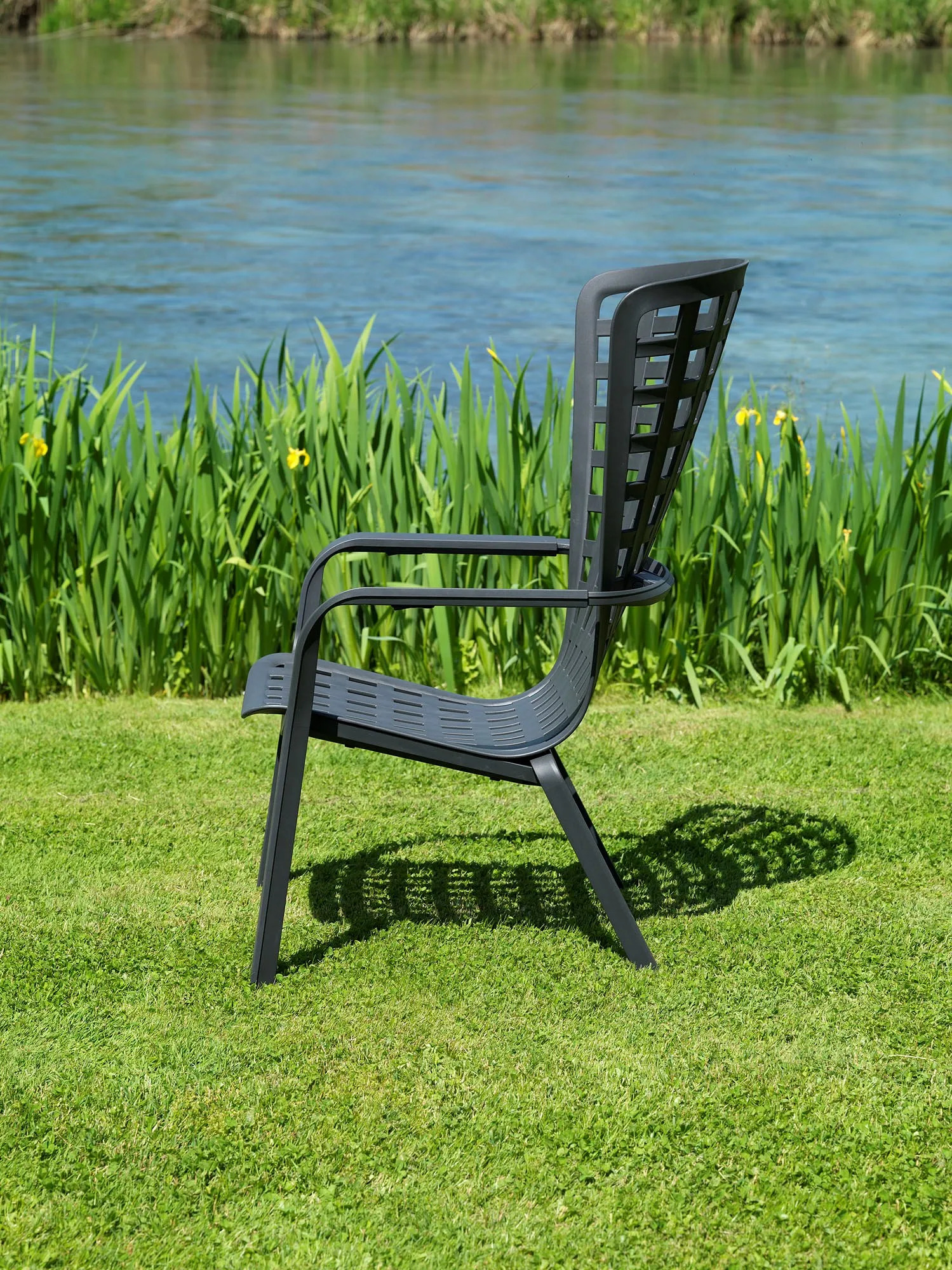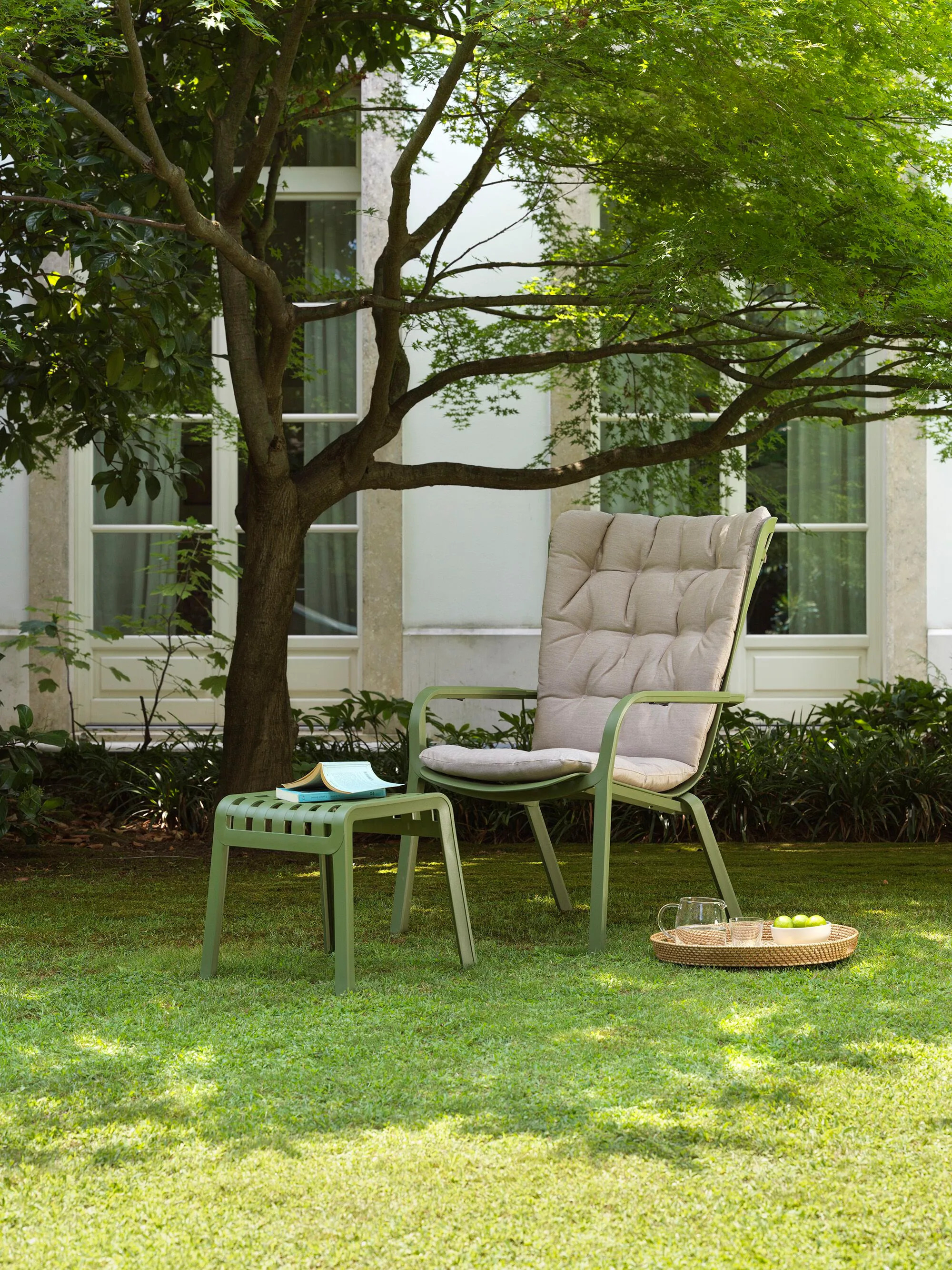 Folio, crafted by Nardi, is an elegant armchair designed for outdoor relaxation, ideal for resorts, cafés, and beachside hotels. Constructed from durable fiberglass resin, it offers a choice between a fixed base or a gentle rocking version. The chair's seamless design features a spacious, enveloping back and a generously lowered seat, providing a refined structural embrace. Its ergonomic form is made from a perforated resin sheet with a square pattern, balancing rigidity and flexibility. The chair reclines smoothly into two positions using a discreet under-arm mechanism. Folio includes customizable, washable cushions available in four fabrics, enhancing comfort with a soft internal cushion and ergonomic headrest. The collection also features the Poggio footrest, matching the armchair's design. Designed by Raffaello Galiotto, Folio is weatherproof, stackable, and recyclable, recognized with the Good Design Award 2020 and Red Dot Award 2021.