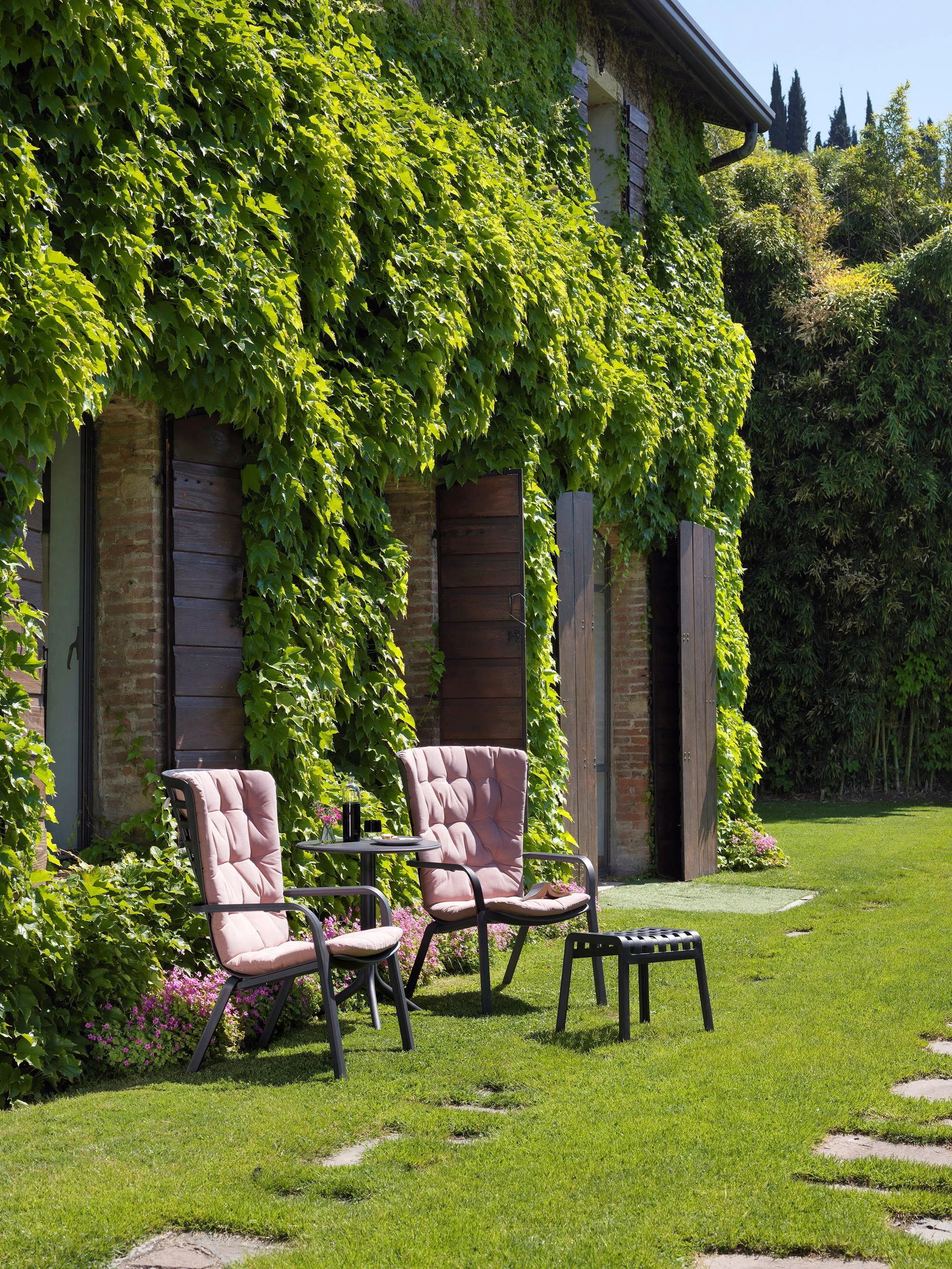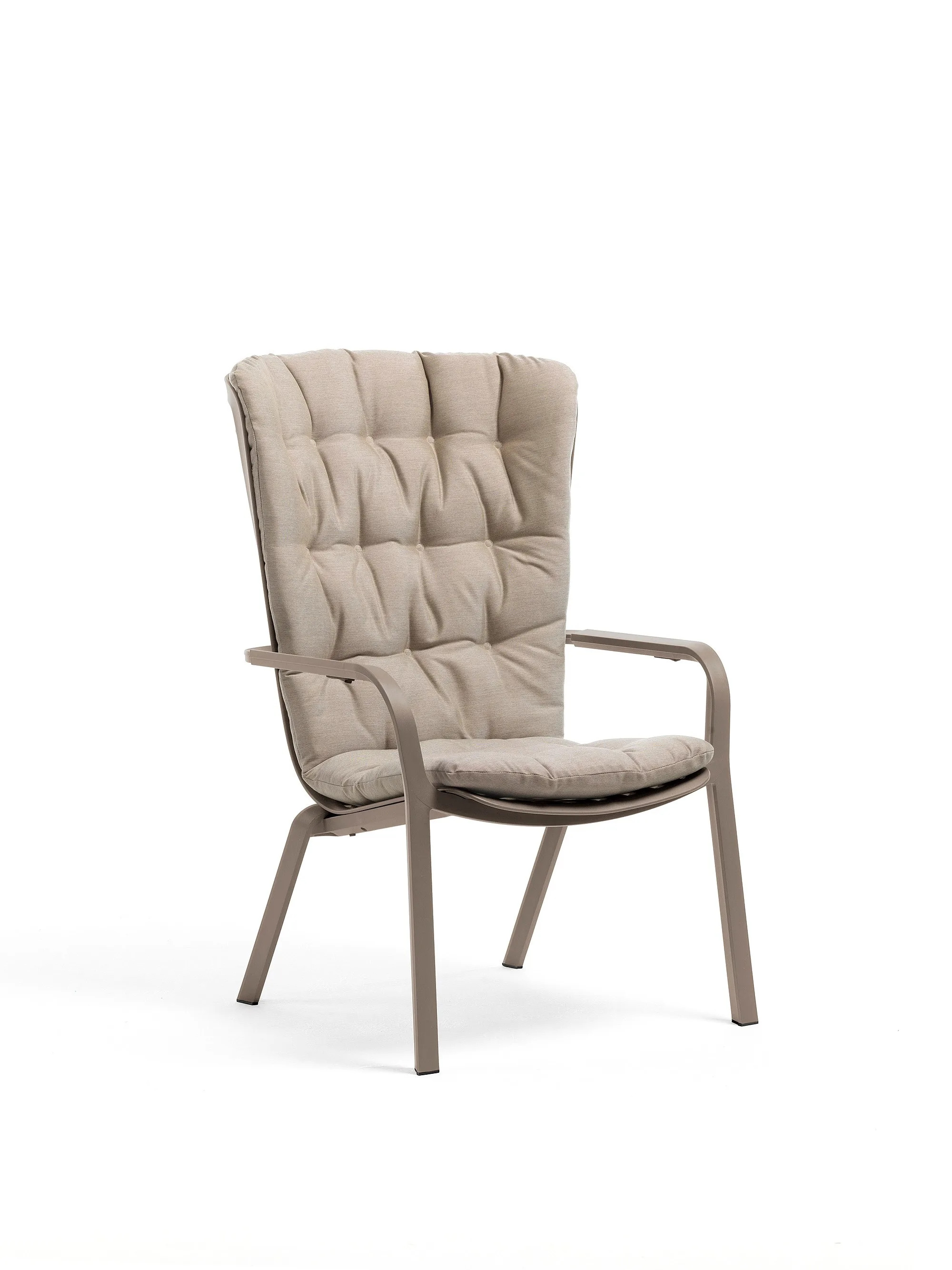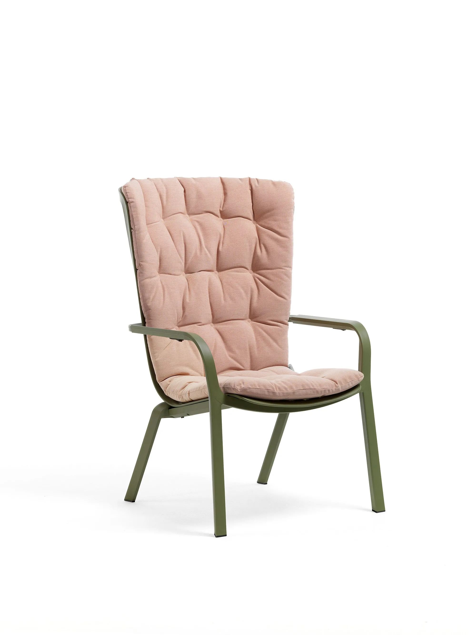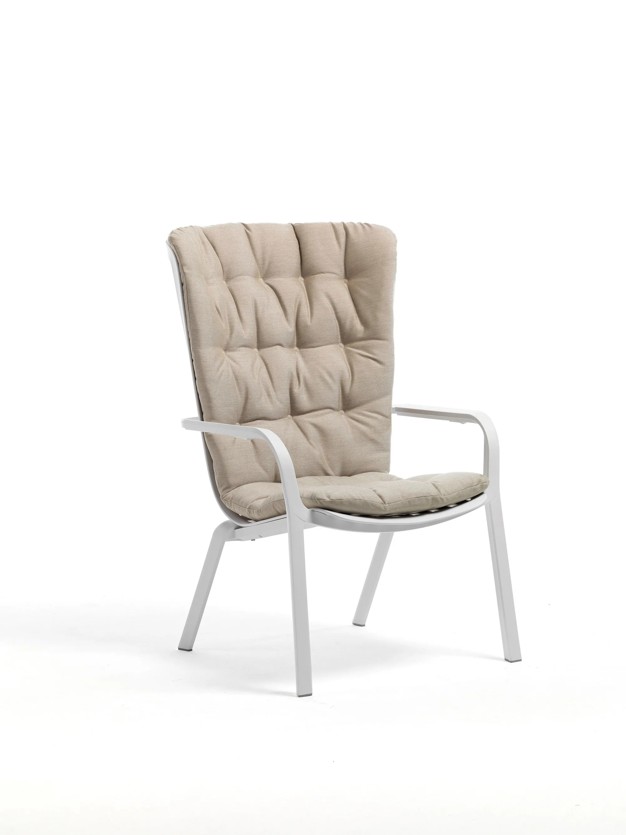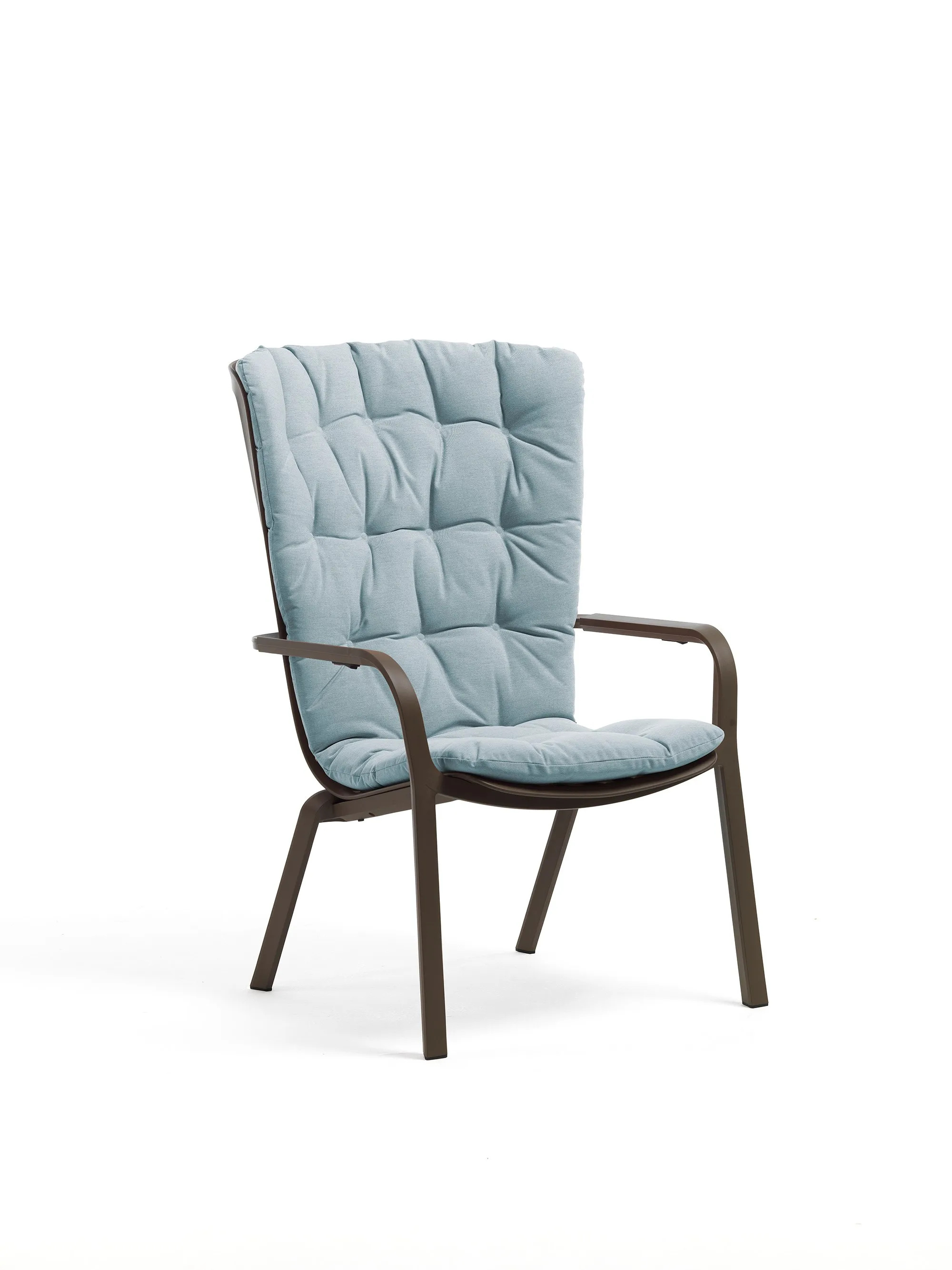Folio, crafted by Nardi, is an elegant armchair designed for outdoor relaxation, ideal for resorts, cafés, and beachside hotels. Constructed from durable fiberglass resin, it offers a choice between a fixed base or a gentle rocking version. The chair's seamless design features a spacious, enveloping back and a generously lowered seat, providing a refined structural embrace. Its ergonomic form is made from a perforated resin sheet with a square pattern, balancing rigidity and flexibility. The chair reclines smoothly into two positions using a discreet under-arm mechanism. Folio includes customizable, washable cushions available in four fabrics, enhancing comfort with a soft internal cushion and ergonomic headrest. The collection also features the Poggio footrest, matching the armchair's design. Designed by Raffaello Galiotto, Folio is weatherproof, stackable, and recyclable, recognized with the Good Design Award 2020 and Red Dot Award 2021.