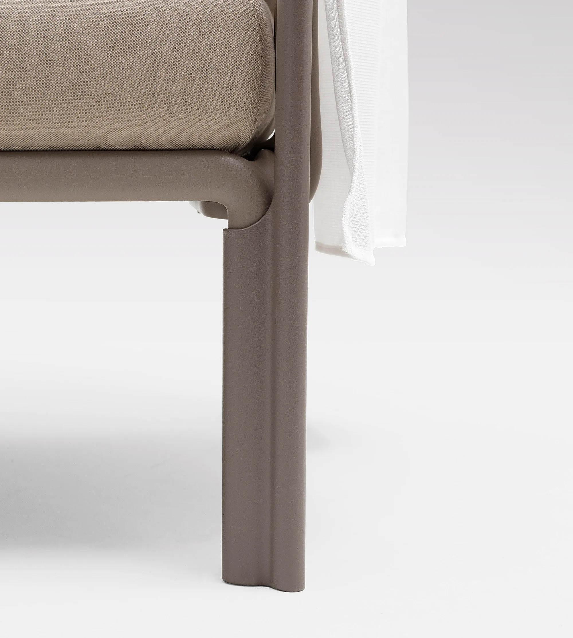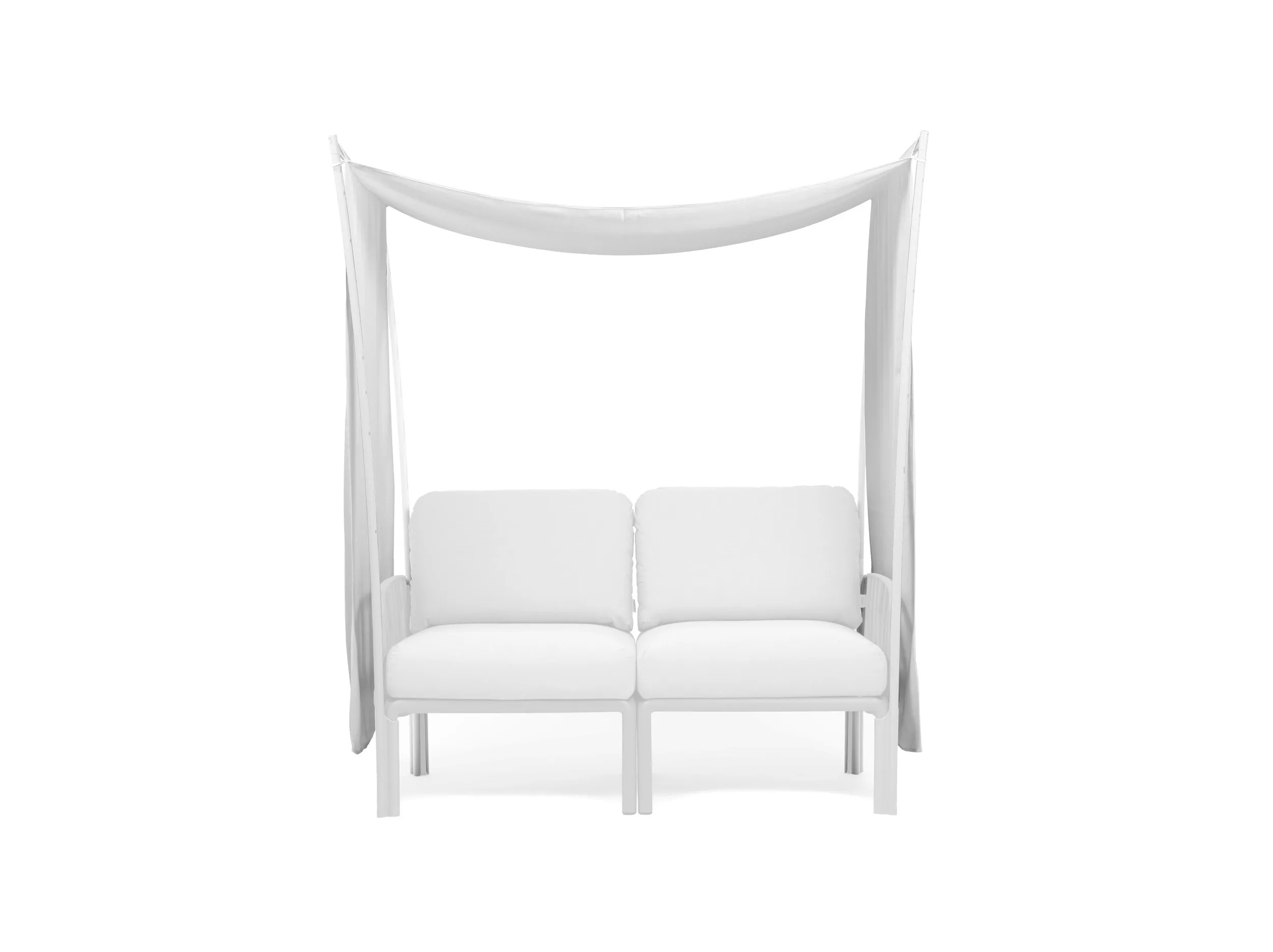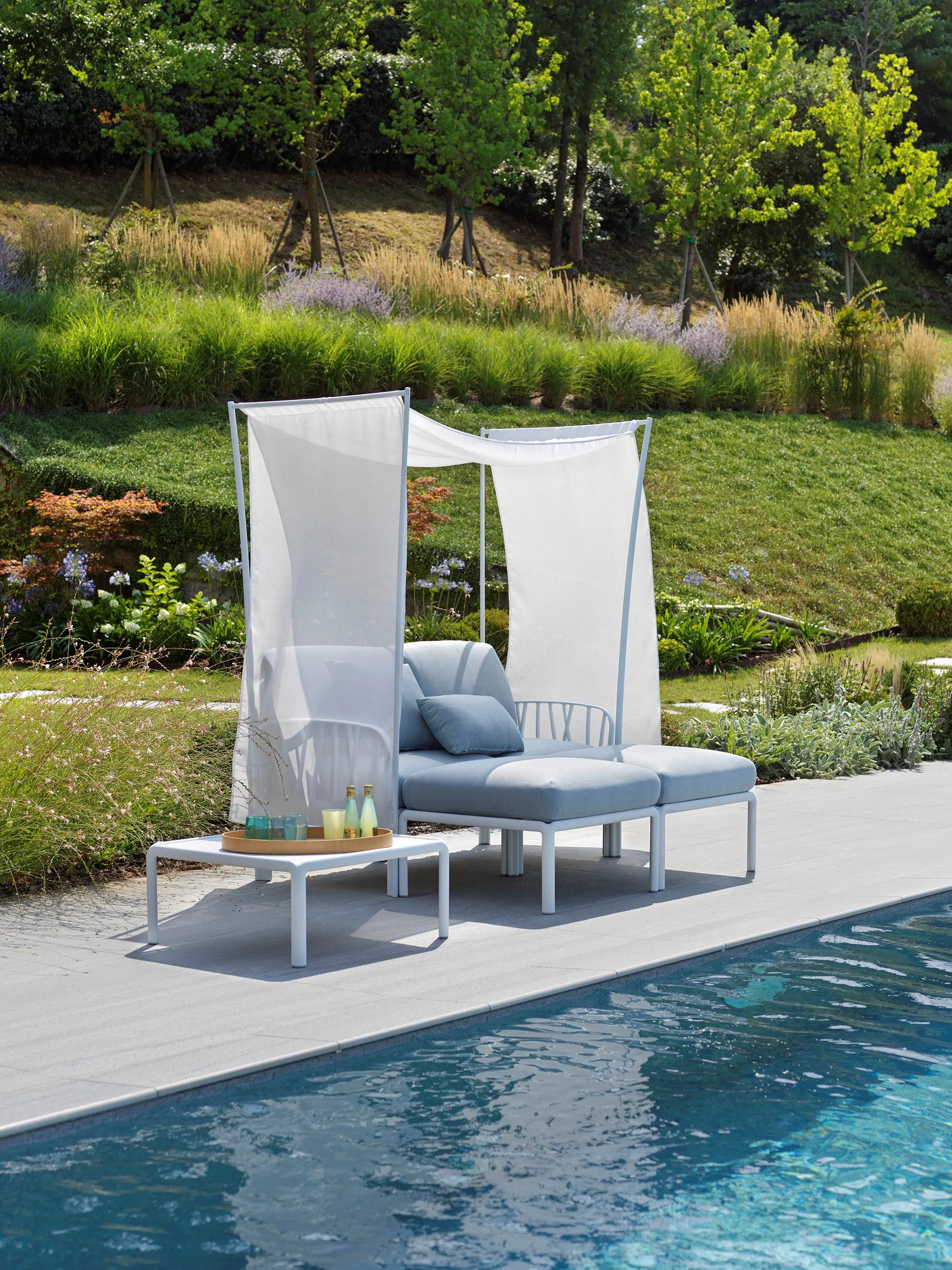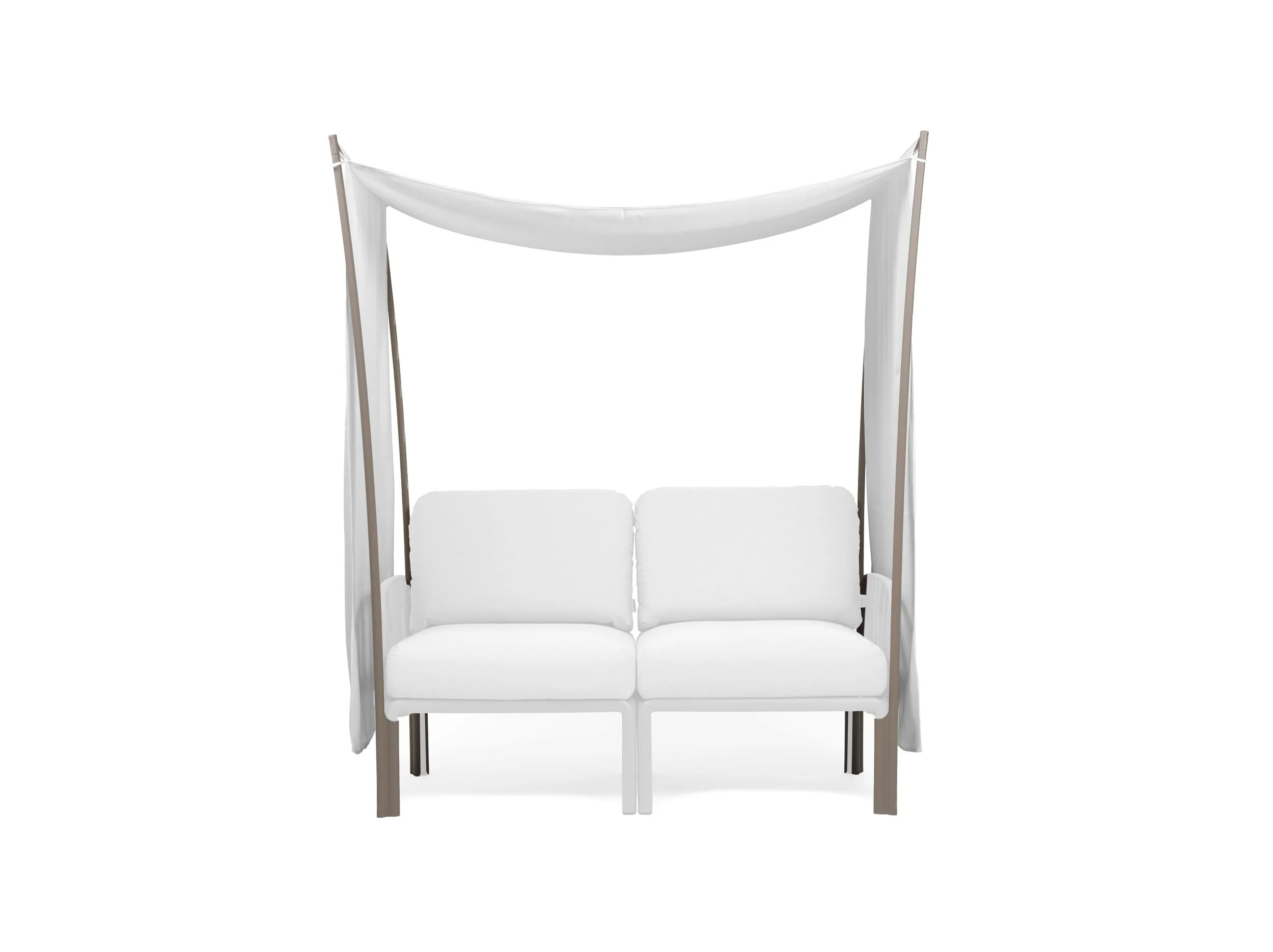 The KOMODO OMBRA 2 is a versatile shade cover system designed for outdoor settings, featuring a unique thread-like structure crafted from fiberglass resin and fabric. This design offers an ethereal shading effect, ideal for creating comfortable environments in resorts, cafés, and beachside hotels. The structure is highly flexible, allowing it to sway gently with the wind, enhancing its durability in various weather conditions. It seamlessly integrates with the Komodo 2 and 3-seater upholstered seating systems, making it a perfect addition to modular outdoor seating arrangements. The Velo cover, made from technical fabric, is available in a natural white hue, complementing any garden furniture set or poolside lounge area. This all-weather outdoor furniture piece is an excellent choice for those seeking durable patio chairs and comfortable poolside loungers.