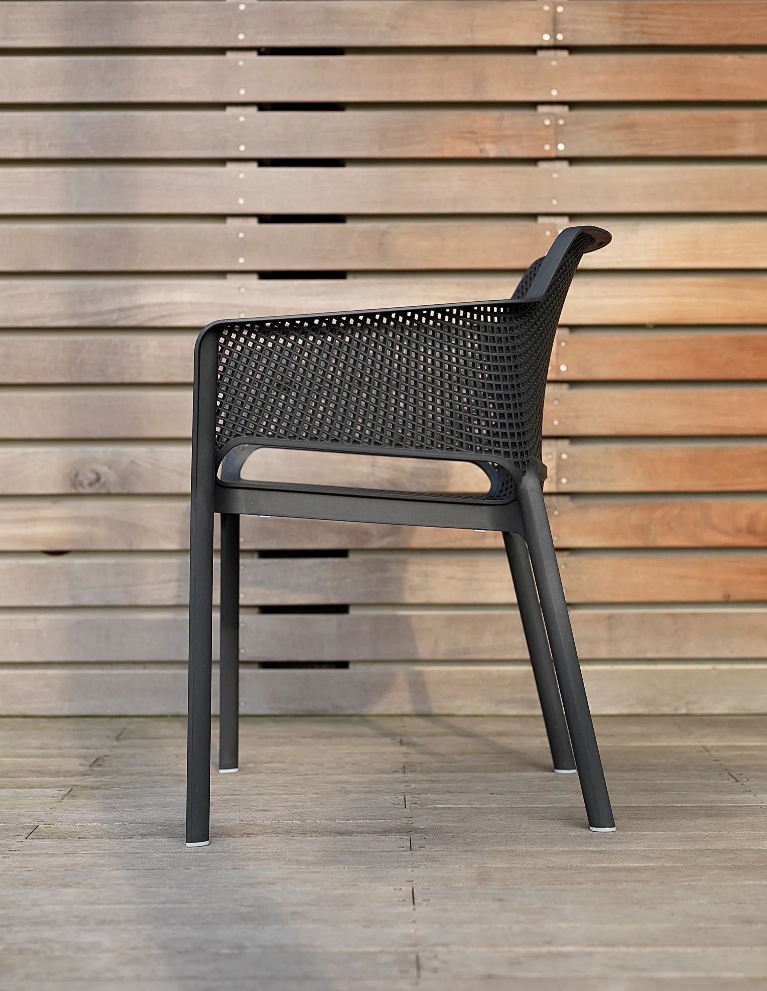 The NET armchair offers a blend of modern design and durability, making it suitable for restaurants, conference rooms, coworking spaces, cafés, event venues, and educational institutions. Crafted from UV-treated fiberglass resin, this ergonomic chair features non-slip feet and a stackable design, ensuring practical and durable seating solutions. Its distinctive radial pattern of square perforations enhances both the seat and backrest, available in six colors: white, anthracite, dove grey, coral, mustard, and willow green. Designed for versatility, it fits seamlessly in both indoor and outdoor settings. The standard dimensions are H. 80 cm, W. 60.5 cm, D. 58.5 cm, with a seat height of 46.5 cm. The Relax version, recognized by the ADI Design Index and Good Design Award, measures H. 86.5 cm, W. 67 cm, D. 70 cm, with a seat height of 41.5 cm. A variety of cushions are available for added comfort.