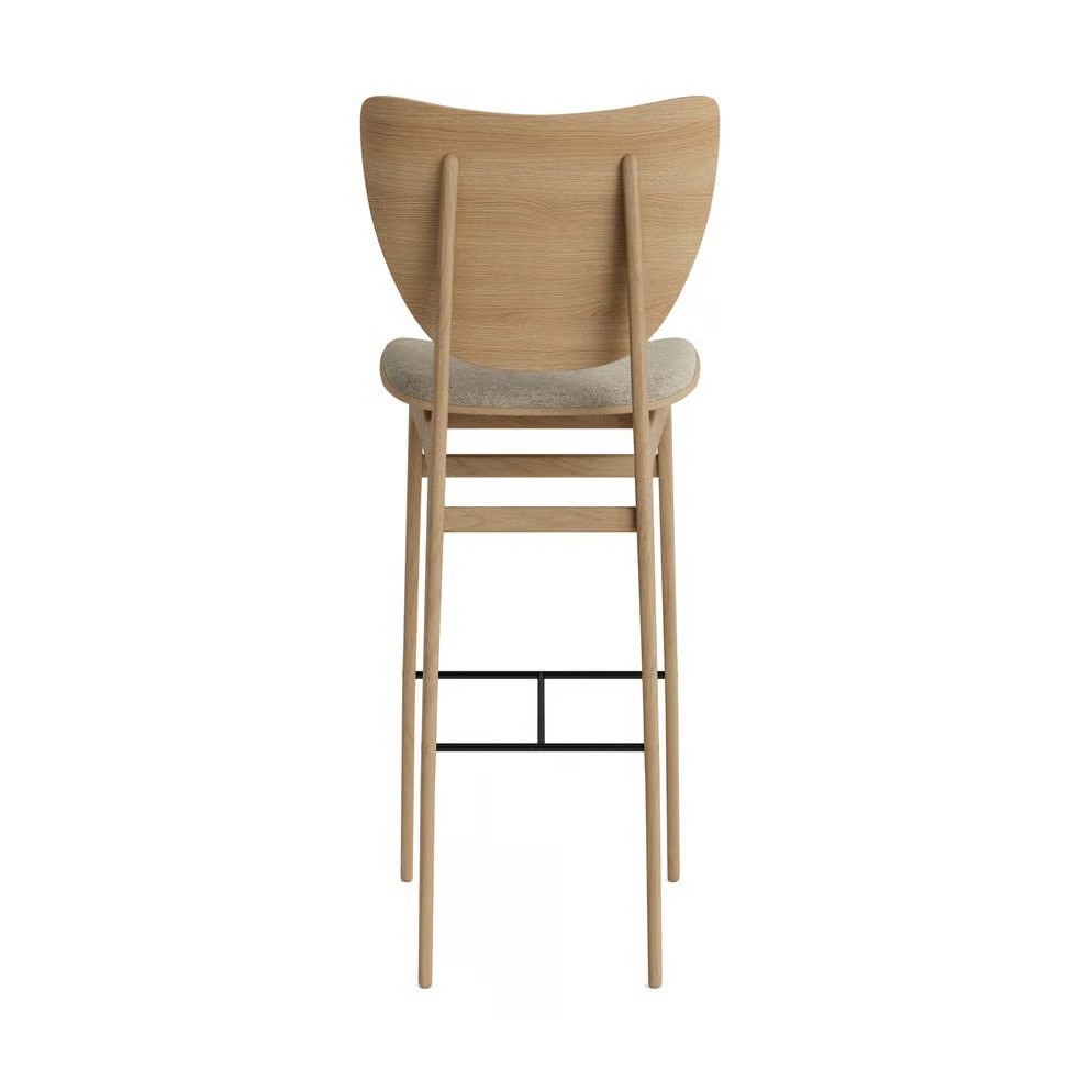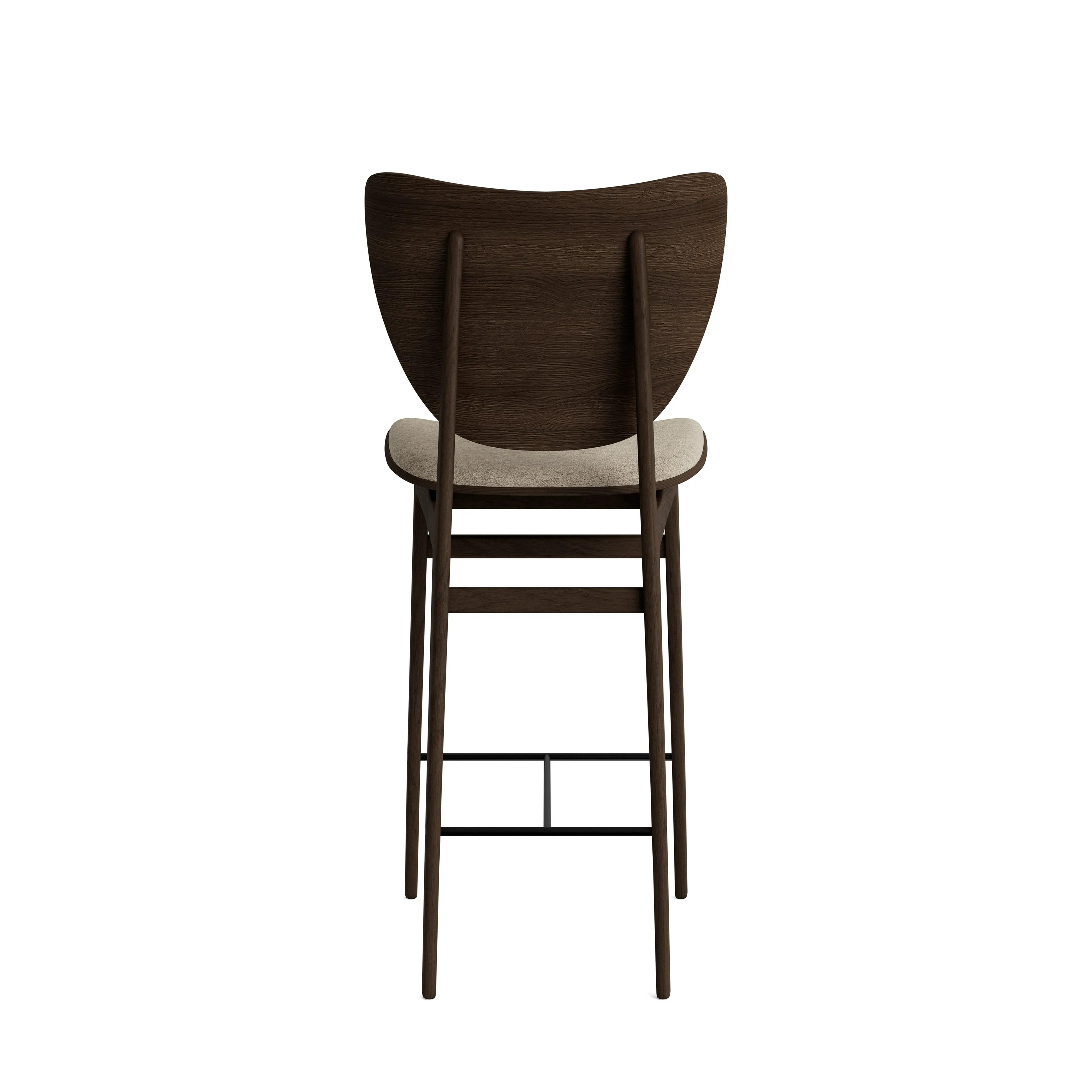 The Elephant Bar stool combines a high-quality fabric seat with a solid oak frame, offering a sophisticated seating solution for various settings. Its gently curved back mirrors the soft lines of the Elephant series, providing ergonomic support. The sculptural wood base enhances its modern design, making it suitable for dining tables, café chairs, and conference room furniture. The stool features a comfortable seat with replaceable upholstery plates, ensuring durability and adaptability. Crafted with a laminated oak veneer for the seat and back, it is finished with a water-based clear lacquer, highlighting its natural beauty. This versatile piece is ideal for restaurants, coworking spaces, and educational institutions, offering both style and functionality. Made in Latvia, it exemplifies quality craftsmanship.