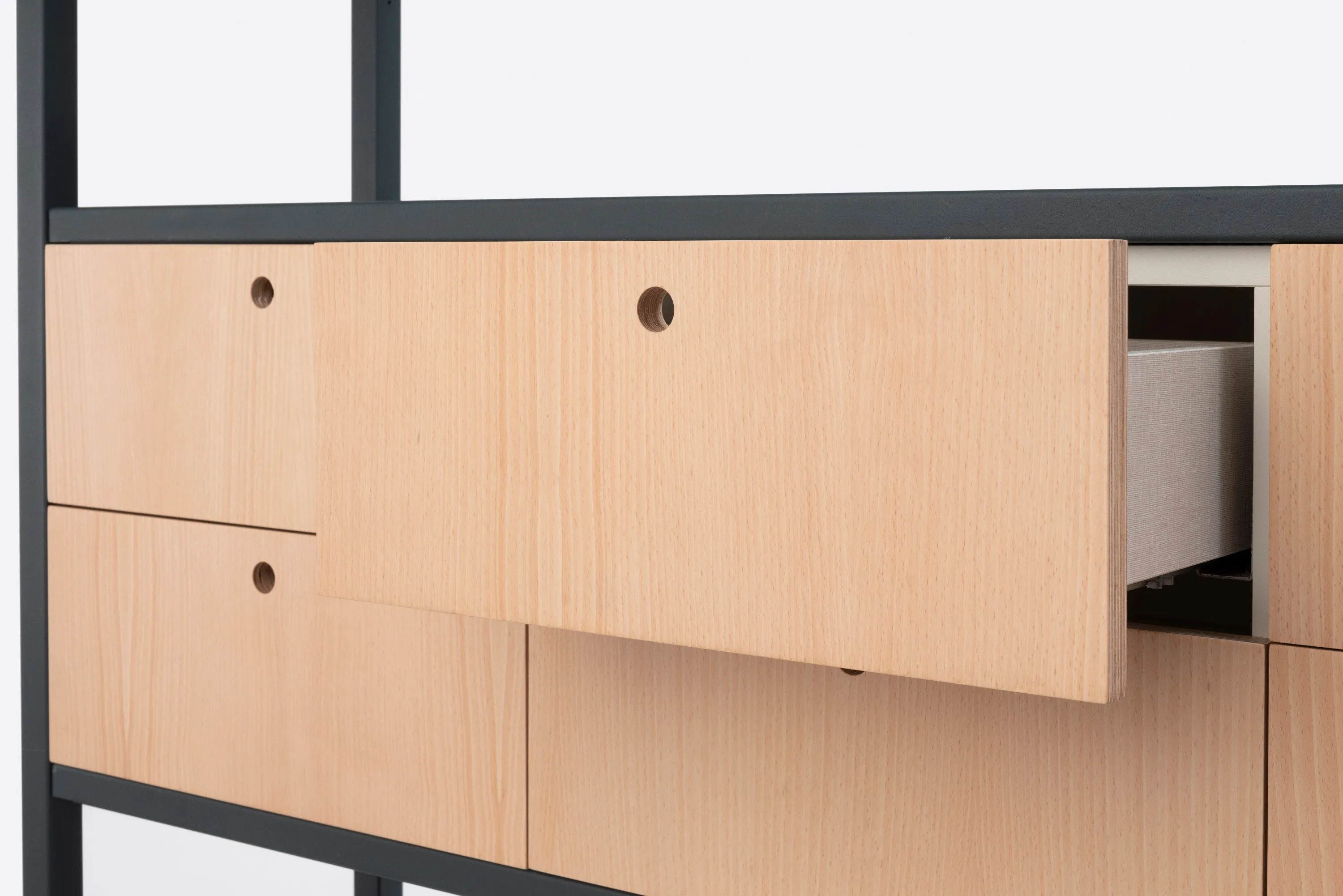 DRY MODULE 5 offers a versatile solution for various environments, including offices, boutique shops, hotels, libraries, and coworking spaces. This modular storage furniture features a minimalist design, allowing for endless configurations to suit diverse needs. Constructed with a durable steel frame, it can be customized with modules that include doors, drawers, and even perforated panels for added functionality. In addition to steel, birch plywood options are available, providing a stylish alternative. The collection's origins lie in a bench with simple, elegant lines, which have been seamlessly integrated into the DRY range of tables. These tables are available in double or triple configurations, with varying heights, widths, and lengths, making them ideal for modern conference settings, dining areas, and more.