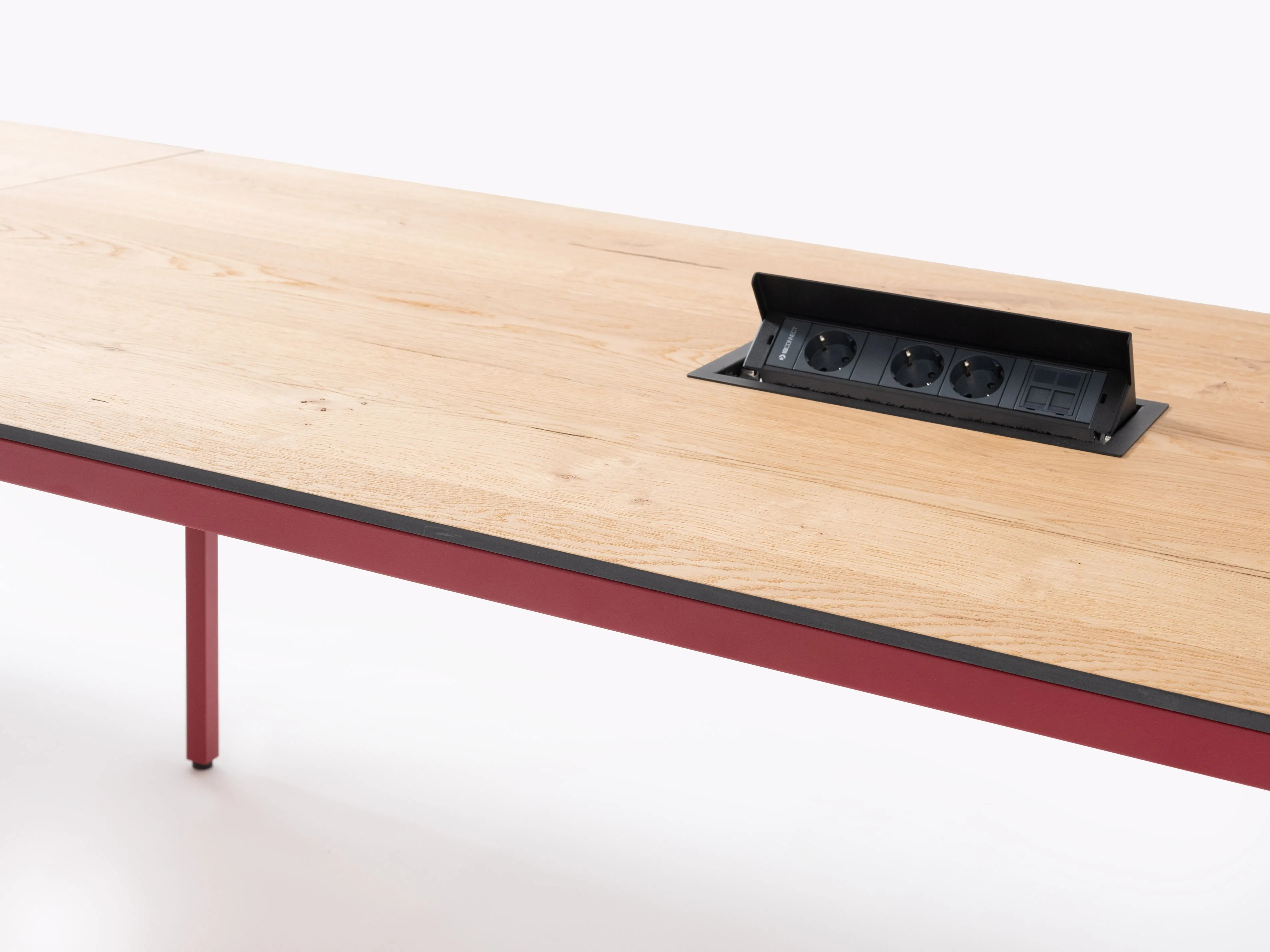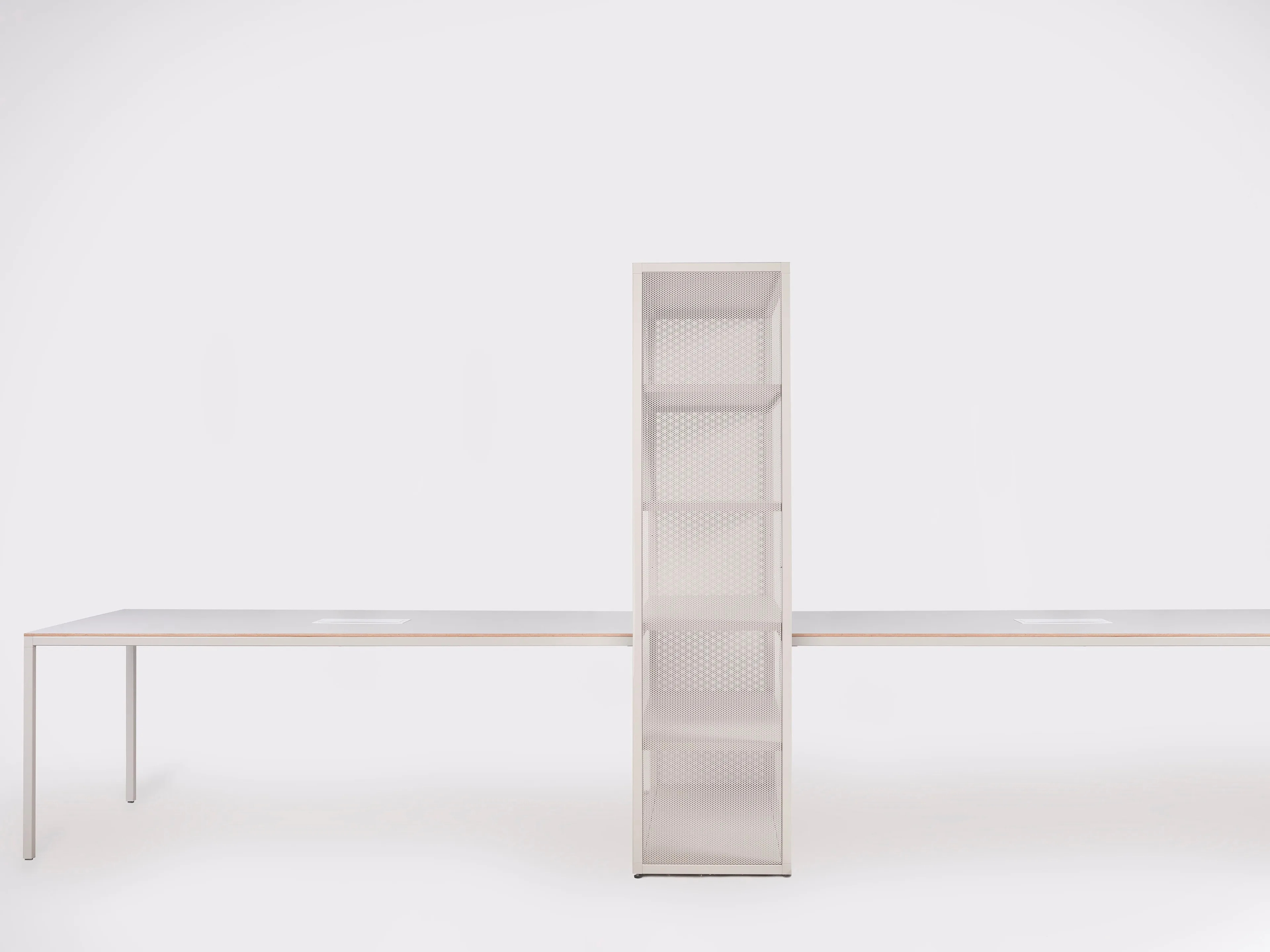 The DRY TABLE + SHELF offers a versatile solution for various environments, including offices, boutique shops, hotels, libraries, and coworking spaces. This modular storage furniture combines a minimalist design with practical functionality, featuring a steel frame that supports a range of configurations. The modular storage units can be customized with doors, drawers, castors, and perforated panels, providing adaptable office cabinets and retail storage solutions. The collection includes durable storage furniture options, such as birch plywood shelves, and is complemented by the addition of double or triple tables available in various heights, widths, and lengths. This space-saving furniture is ideal for creating unique, efficient spaces, offering both style and utility. The DRY collection's architectural simplicity is reflected in its modern conference tables and versatile wall-mounted shelves, making it a suitable choice for hotel room storage, retail shelving solutions, and more.