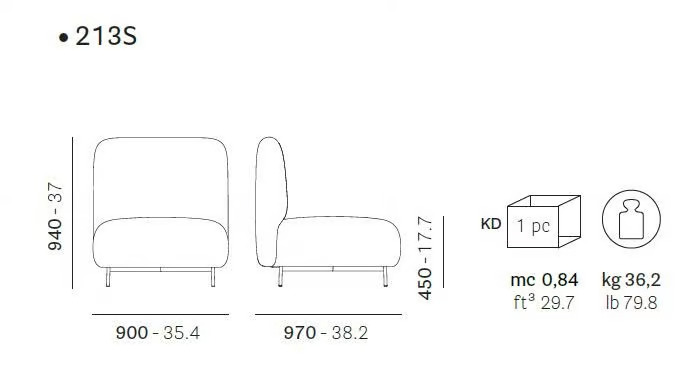 The BUDDY 213S offers a blend of contemporary design and versatility, ideal for hotels, cafés, lounges, waiting rooms, and residential interiors. This piece showcases a striking contrast between its bold, plush seating and a sleek, lightweight frame. The ergonomic design ensures comfort, while the modular nature allows for customizable sofa arrangements, making it suitable for various spaces, including compact areas. Upholstered in high-quality materials, the chaise-longue features polyurethane injected foam for superior comfort, supported by durable aluminum legs. With a seat height of 450 mm, it provides a comfortable seating solution, fitting seamlessly into modern lounge settings.