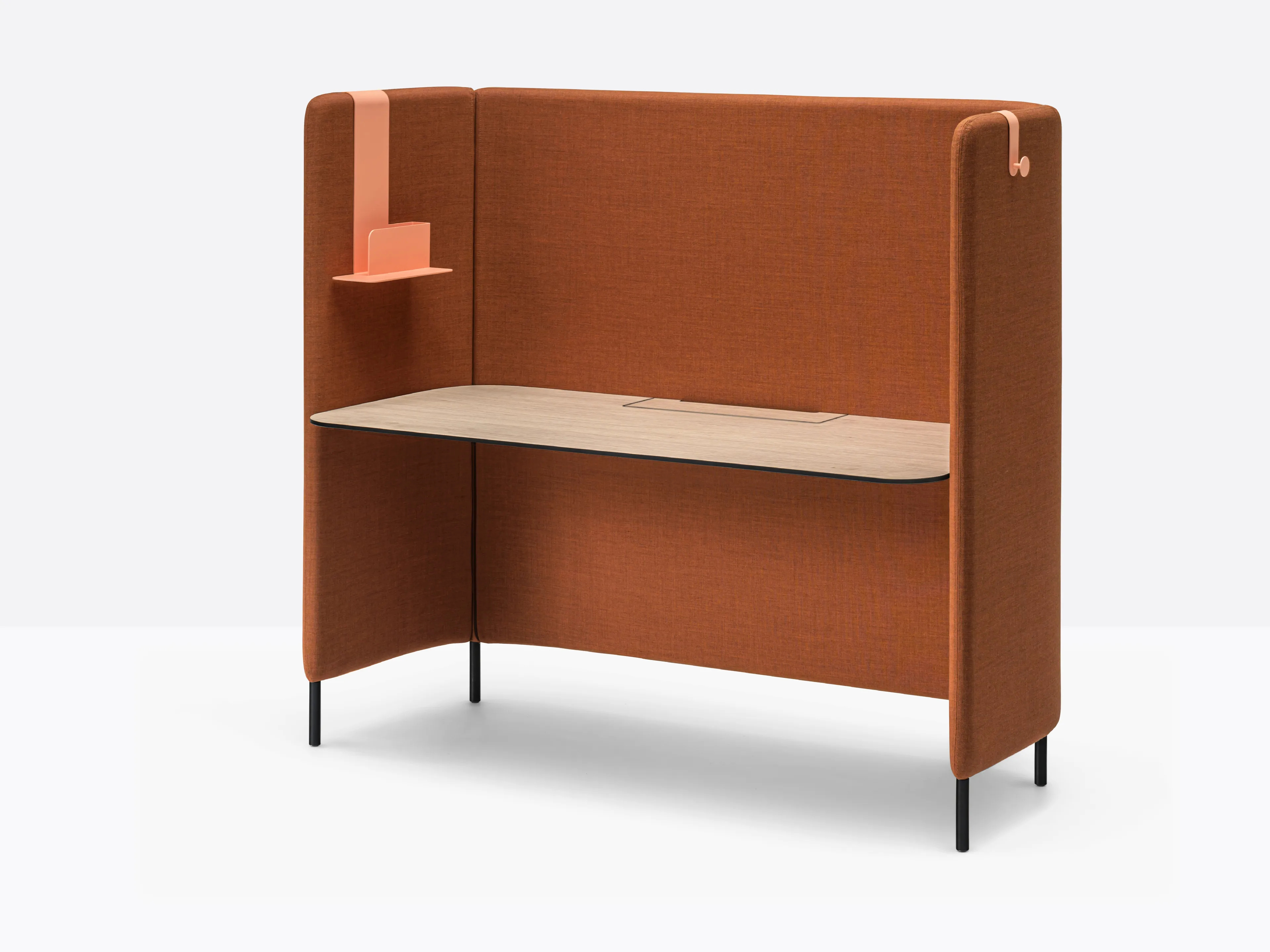 The BUDDYHUB DESK BDS002/140 offers a practical and efficient solution for corporate offices, coworking spaces, and educational institutions. Designed with a perimeter sound-absorbing panel, it provides acoustic and visual privacy, making it ideal for focused work. The solid laminate top is embraced by this panel, creating a semi-enclosed niche. Its modular design allows seamless integration with other modern office desks or lounge seating from the same collection, facilitating the creation of collaborative workspace furniture and meeting areas. The lightweight frame elevates the panel, enhancing its aesthetic appeal and simplifying cleaning and maintenance. This modular workstation furniture also includes cable access, supporting a tidy and organized workspace.