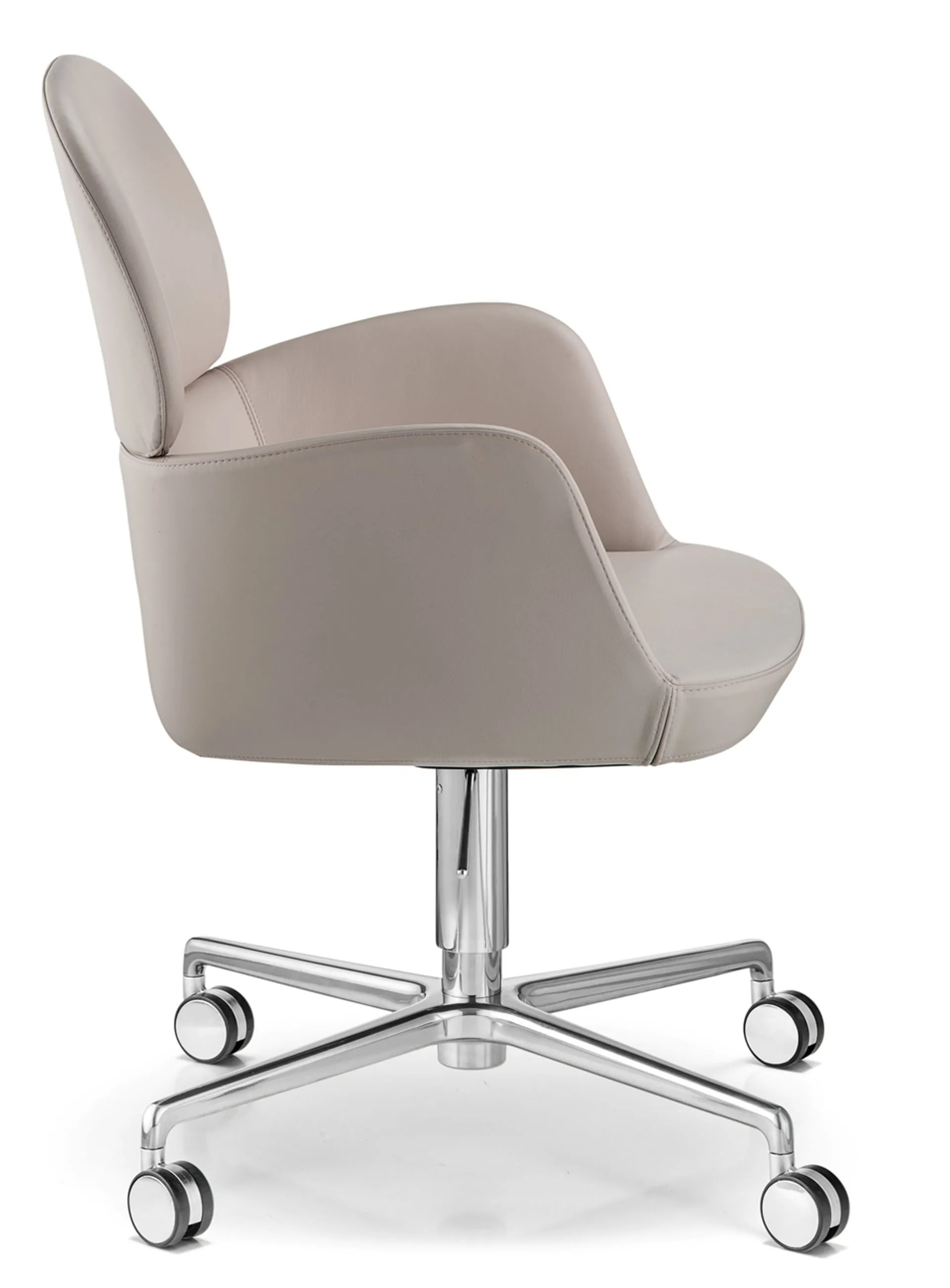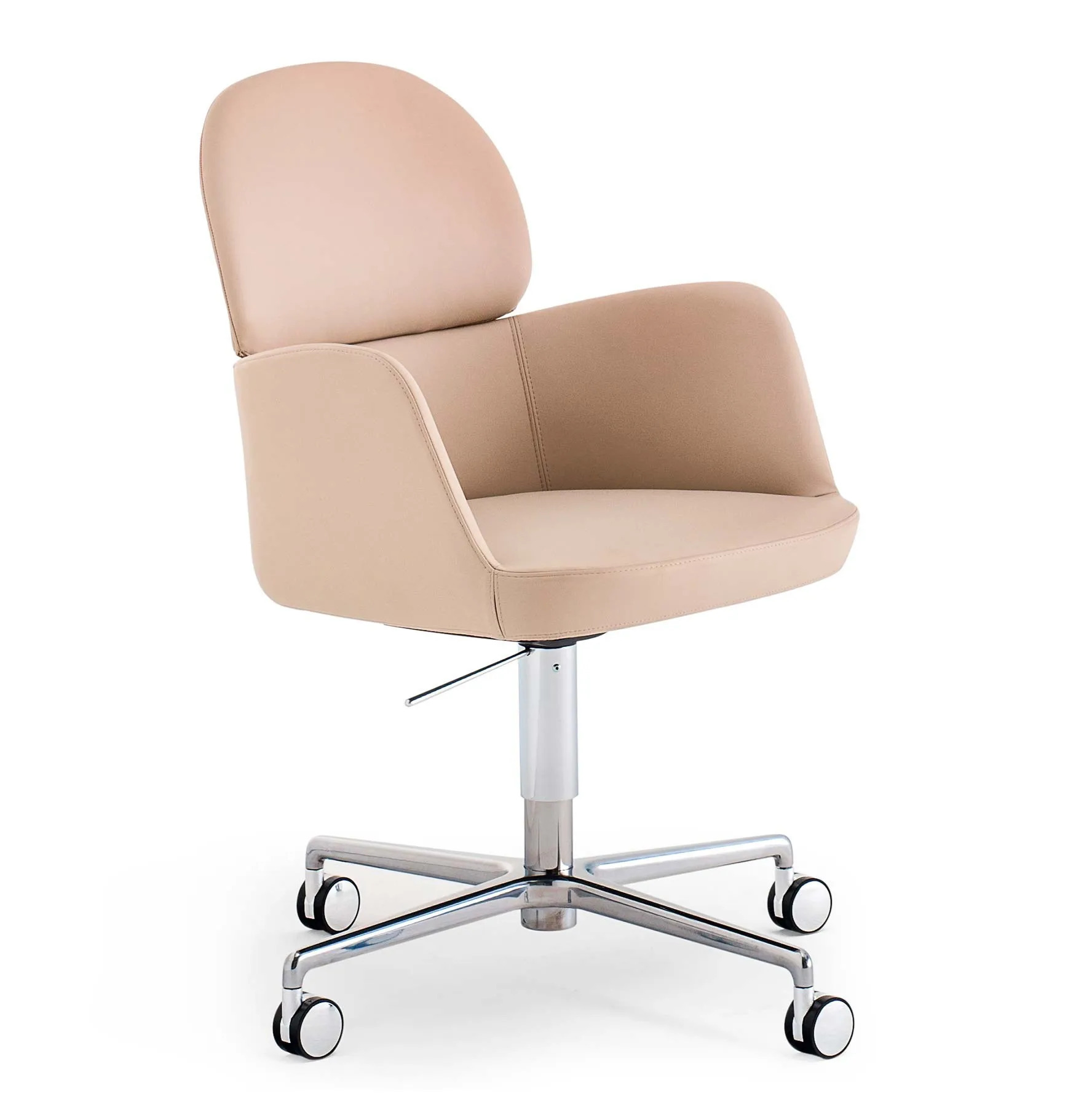 The ESTER 696 armchair combines sophistication and comfort, making it a versatile choice for corporate offices, coworking spaces, and educational institutions. Its central four-spoke base, available with or without castors, suits executive settings and meeting areas. The chair's design features a smooth, upholstered finish in either leather or fabric, providing exceptional comfort. The seat, crafted from polyurethane foam with elastic belts, is supported by a durable steel structure. Available in two backrest sizes, this chair complements ergonomic office chairs, modern office desks, and collaborative workspace furniture. Its modular workstation furniture design and adjustable height desks compatibility enhance its adaptability in various professional environments.