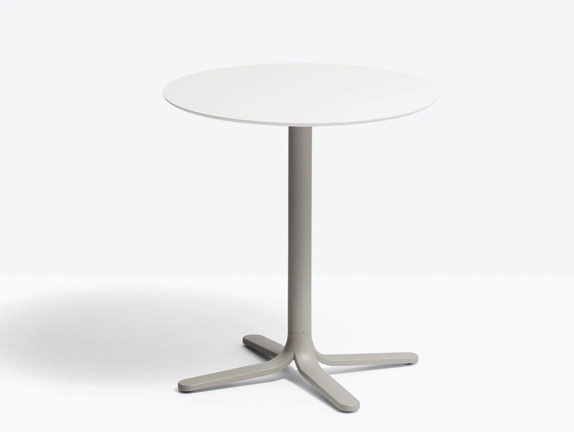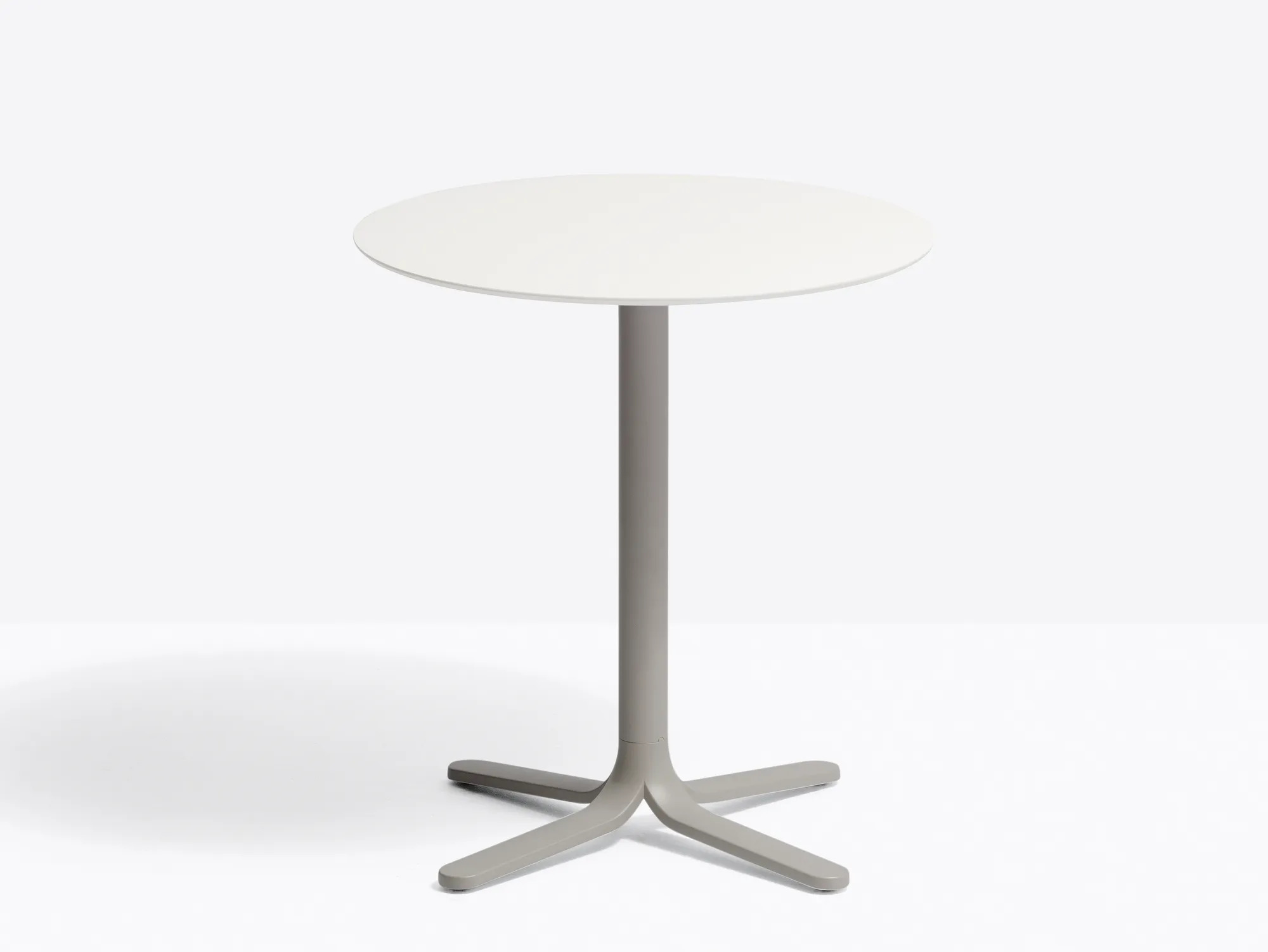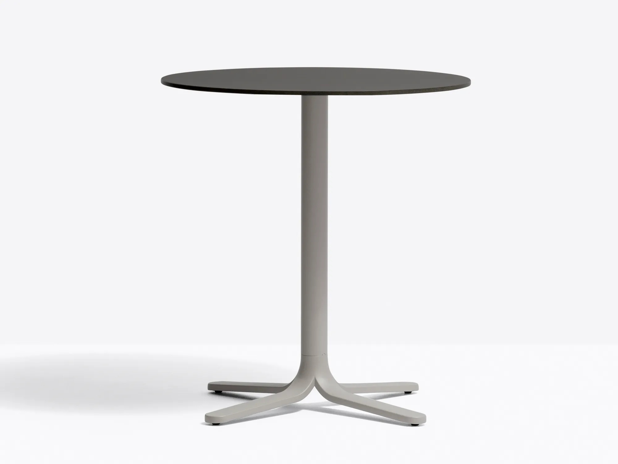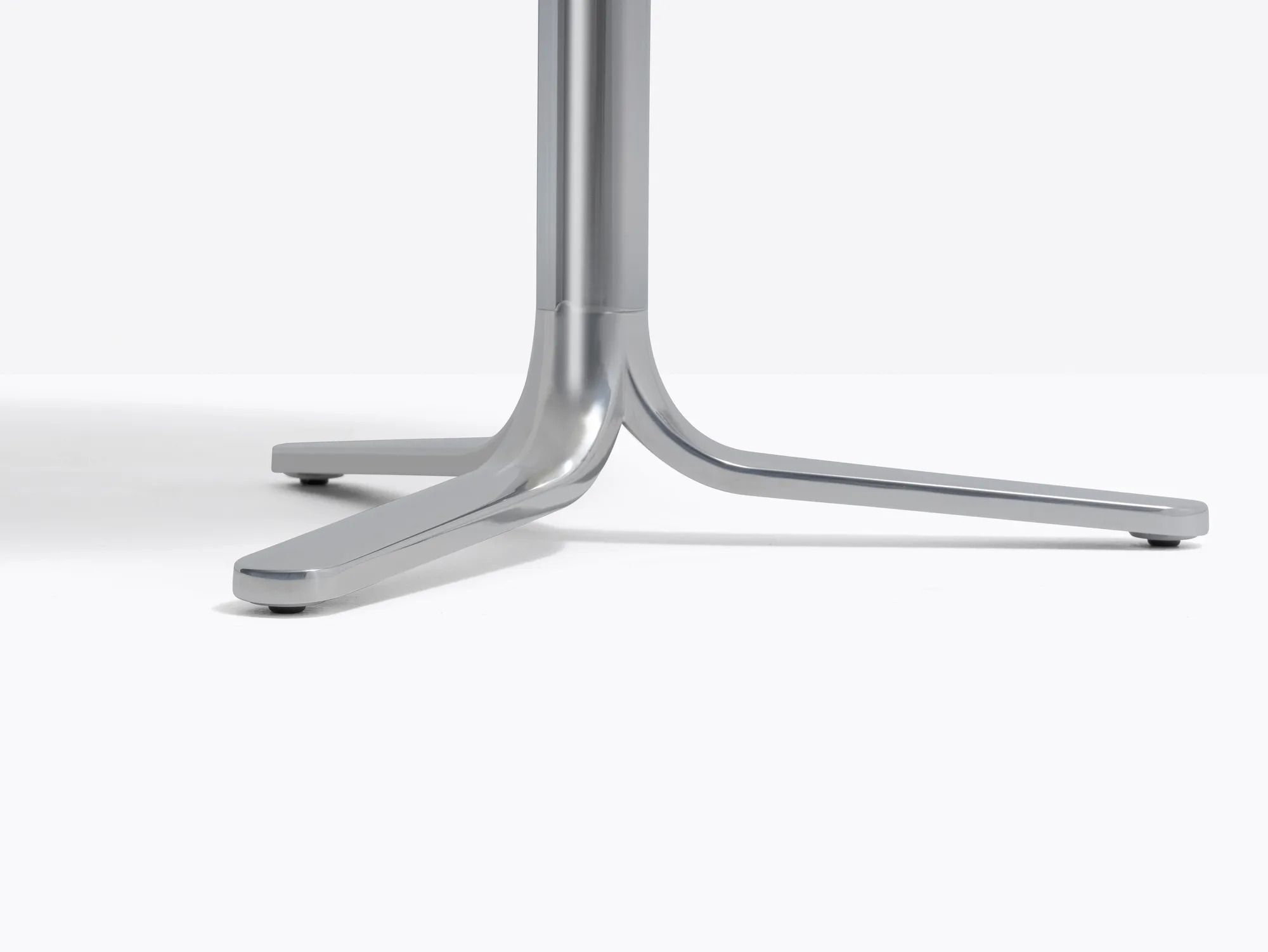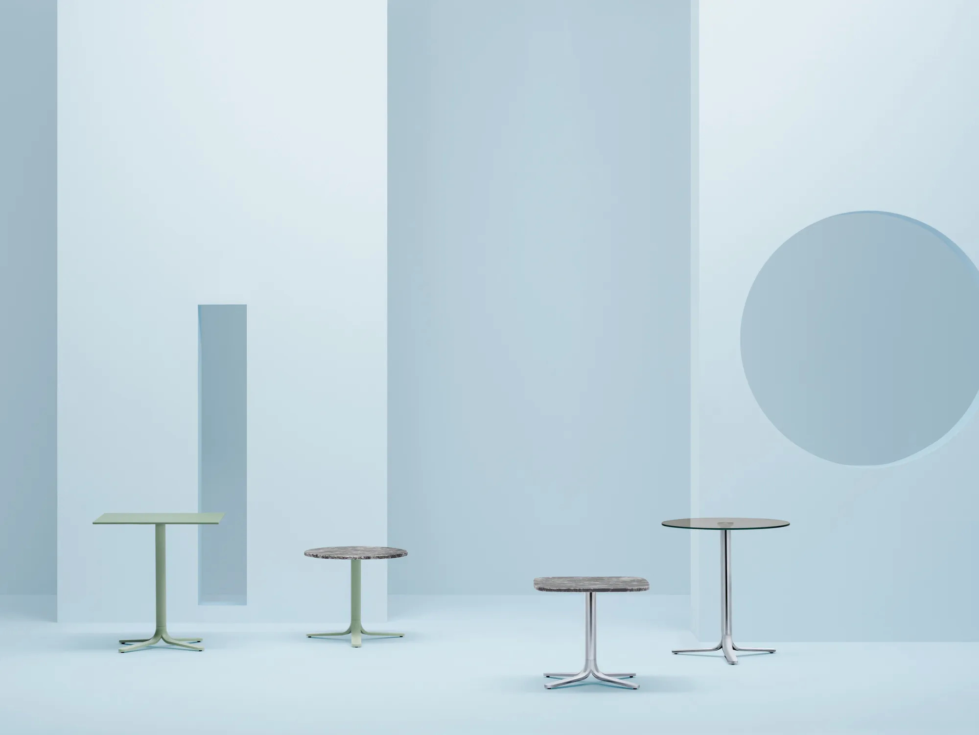 The FLUXO 5460 is crafted for environments such as restaurants, conference rooms, coworking spaces, cafés, event venues, and educational institutions. This piece combines traditional elements with a modern design, featuring a minimalist aesthetic. Its geometric form is defined by a circular-section vertical column that transitions into a base of "ribbons," creating a seamless flow from vertical to horizontal. Constructed from die-cast aluminum, the table offers a stable and durable structure. Available in three heights, it comes in a variety of powder-coated colors or polished aluminum finishes. The FLUXO 5460 is complemented by ergonomic, stackable café chairs, making it an ideal choice for dining tables and conference room furniture.
