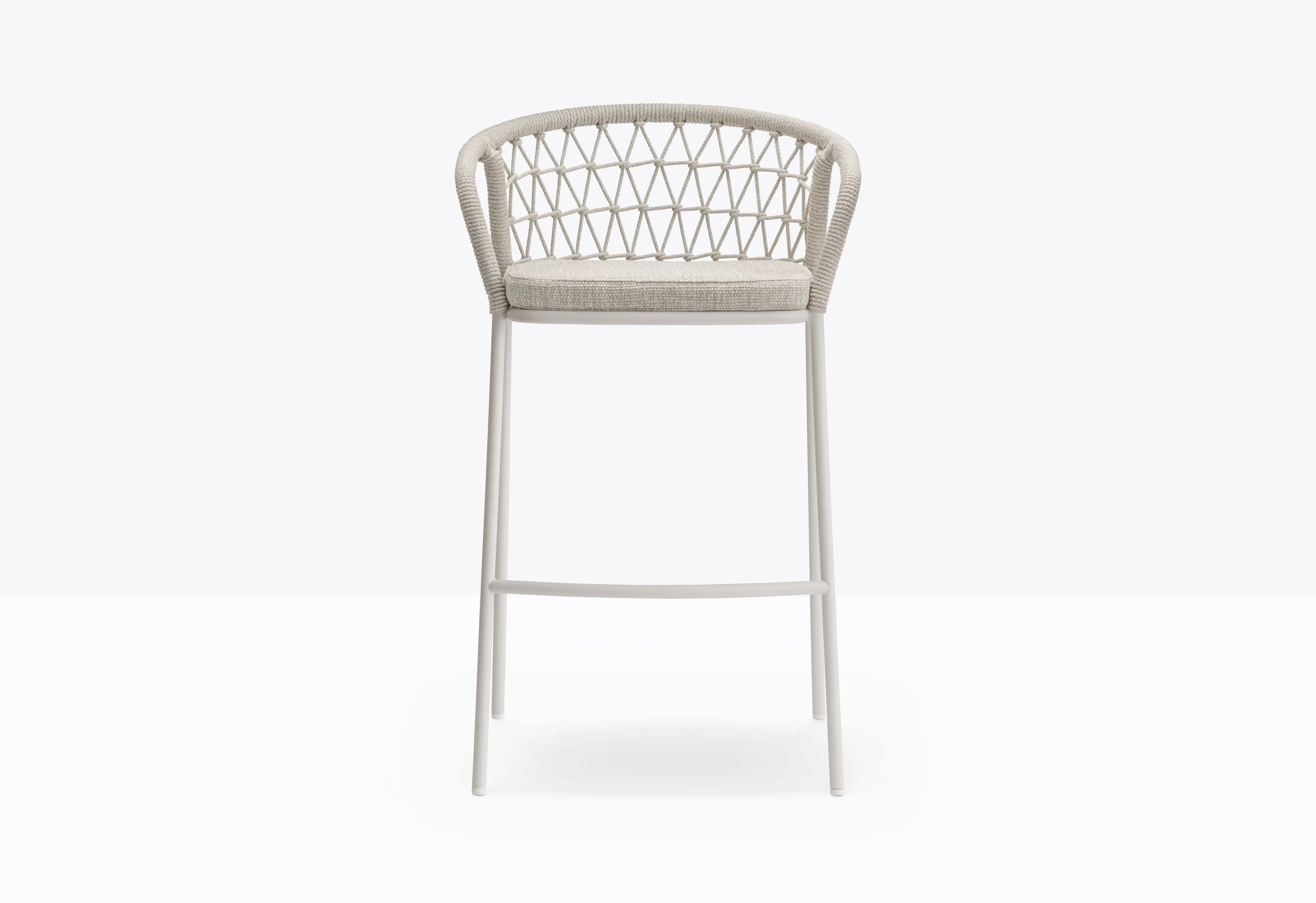 PANAREA 3678 is a versatile seating option crafted for diverse environments such as restaurants, conference rooms, and cafés. This high garden stool combines a steel frame with a handcrafted polypropylene rope weave, offering both durability and modern design. The Ø 20 mm steel tube frame is complemented by a front footrest, allowing for easy stacking. The seat features a cushion padded with quick-drying polyurethane foam, covered in fabric matching the weave. Inspired by the Mediterranean coastline, the design reflects Italian craftsmanship with its hand-woven elements. The wide, curved backrest showcases an intricate geometric pattern, enhancing both aesthetics and functionality. Suitable for outdoor use, the chair's lightweight structure ensures easy mobility. The collection also includes ergonomic chairs and café chairs, ideal for educational institutions and event venues seeking durable seating solutions.