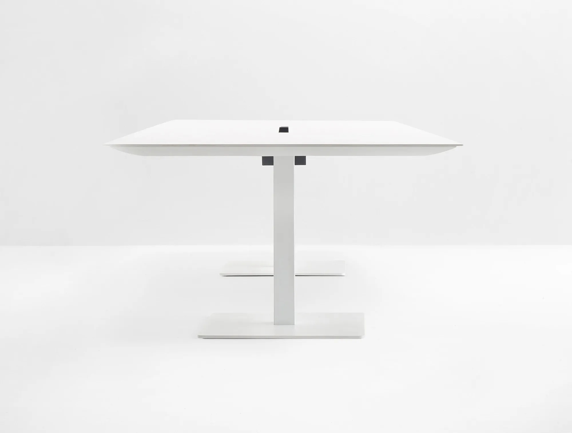 The PLANO 2 collection offers a sleek and minimalist design, ideal for various professional environments. Featuring an ultra-thin solid laminate top, these modern meeting room tables rest on an extruded aluminum frame supported by two square bases. Available in three sizes, they cater to diverse space requirements and can include cable management options. The bases come in brushed stainless steel or a white powder-coated finish, ensuring durability and style. Perfect for comfortable meeting room chairs and modern waiting room seating, PLANO 2 seamlessly integrates into reception area furniture and durable meeting room desks, making it suitable for offices, clinics, government buildings, corporate offices, and coworking spaces.