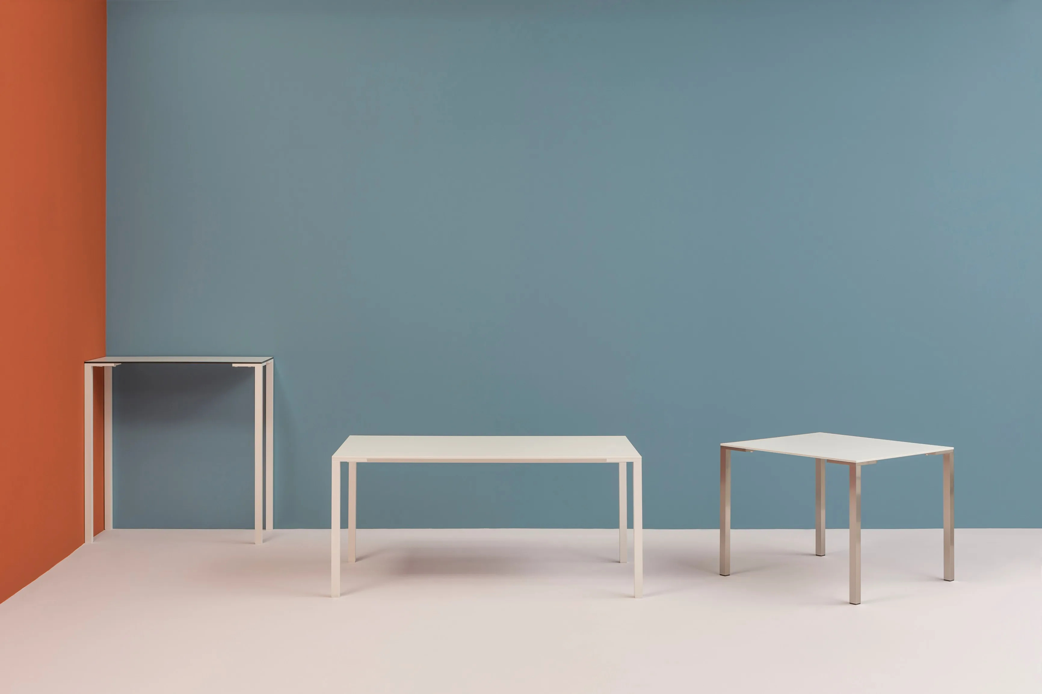 The TOGO table features essential, squared-off shapes, combining a clean design with a robust character. Its extruded aluminum legs, available in brushed or powder-coated finishes, support various square or rectangular top dimensions. The tabletop is securely attached using four cast-aluminum plates, with a maximum size of 2000x900 mm. A version with white powder-coated legs and a white laminate top is also available. The table is offered in a height of 1100 mm, making it suitable for diverse settings such as restaurants, conference rooms, coworking spaces, cafés, event venues, and educational institutions. This modern design table is ideal for those seeking durable seating solutions, including stackable and ergonomic chairs, to complement their dining tables and conference room furniture.