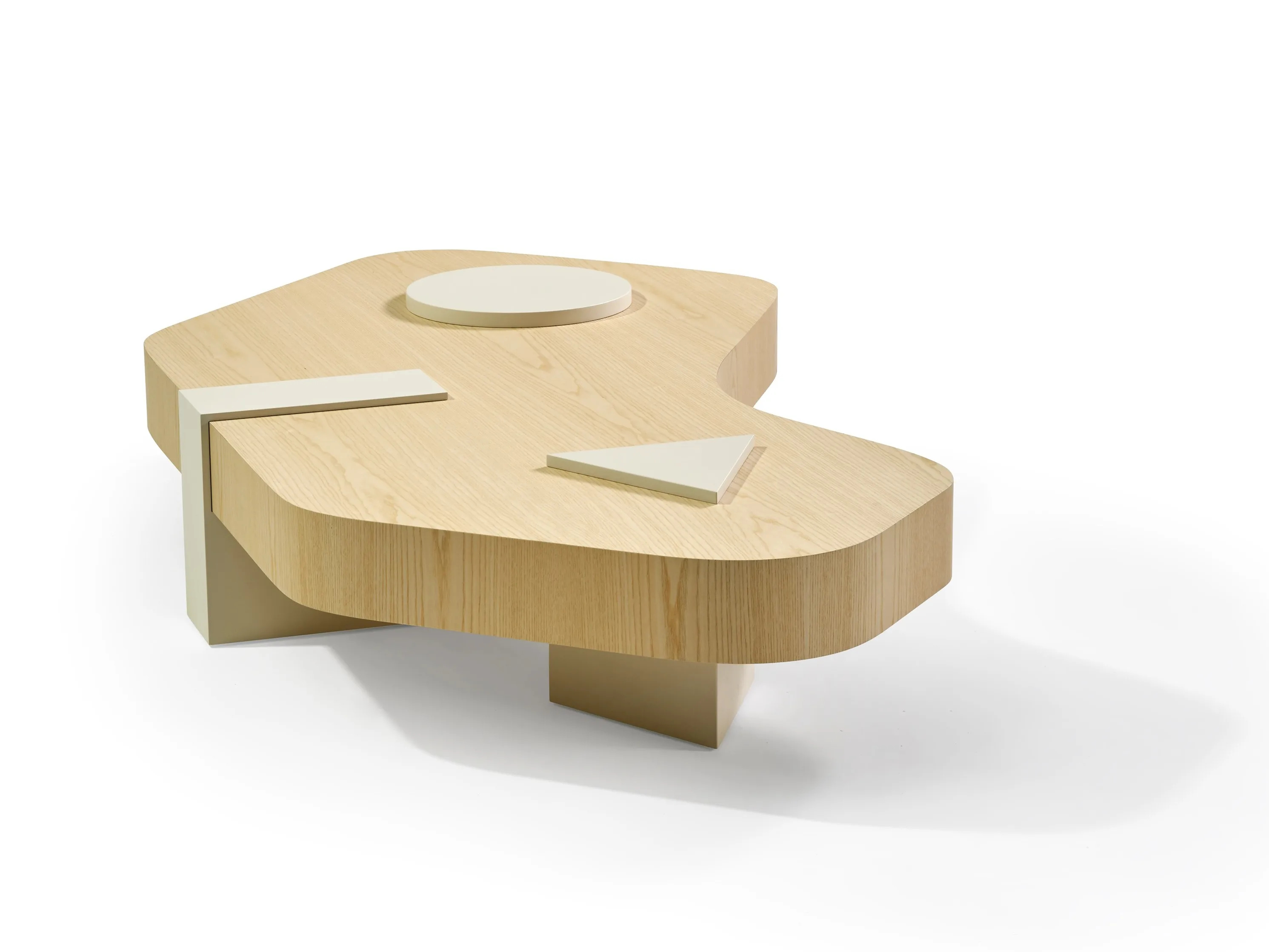 BOLD is a striking table that draws inspiration from the charismatic Memphis style, designed by Studiopepe. Its oversized top features an irregular outline, supported by legs in basic geometric shapes—rectangle, circle, and triangle—that create a dynamic visual effect as they emerge at varying levels. Despite its substantial size, BOLD seamlessly integrates into spaces, offering fluid and elegant transitions. The design showcases a blend of diverse materials, a hallmark of Chiara and Arianna’s work, presenting a technical challenge that merges experimentation with industry standards. Available in various materials and finishes, BOLD offers two-color options with different tones for legs and top, in MDF, ash veneer, or the unique vintage veneer of the Designer’s Edition. Monocolor options in Lima or Tabaco high gloss lacquers, or any color from the extra-matte range, highlight its sculptural essence. The Designer’s Edition pays tribute to the iconic Memphis group, reflecting the innovative spirit of Italian design.
