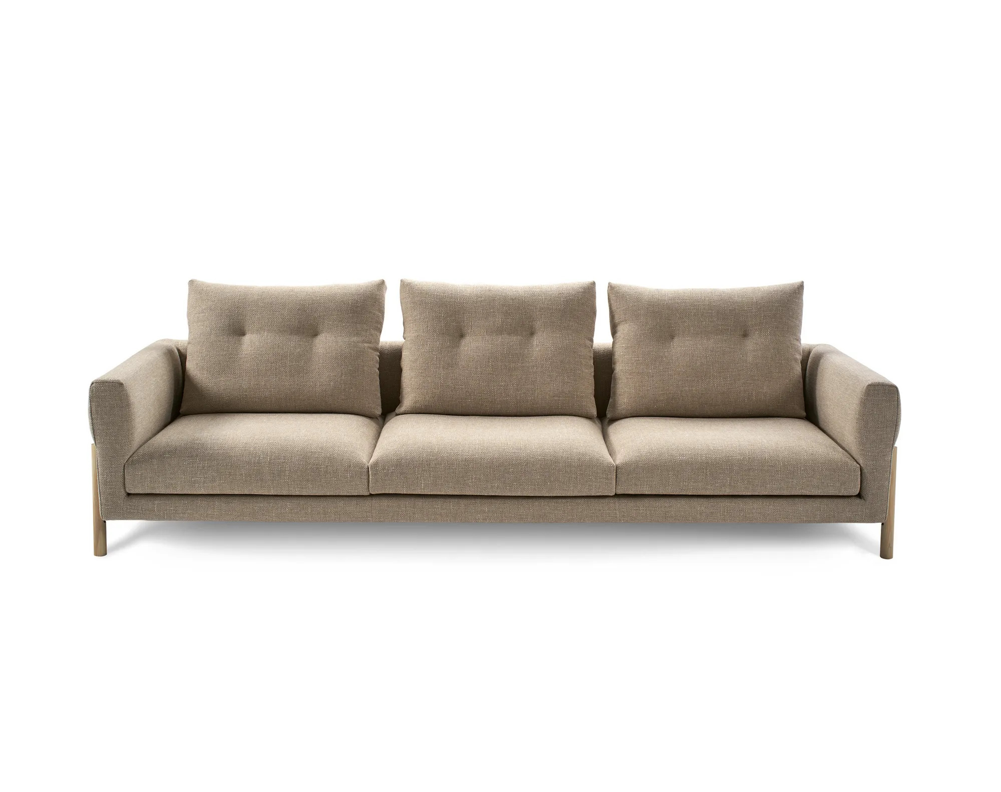 MOMIC, designed by Rafa García, reimagines the classic 1950s Mid-Century sofa aesthetic for today's modern interiors. Its delicate lines, soft curves, and organic shapes offer a blend of elegant simplicity and timeless appeal, making it ideal for hotels, cafés, lounges, and waiting rooms. The MOMIC collection features an extensive modular program, allowing for customizable sofa designs, including 2 and 3-seater options, modules with or without armrests, chaise longues, poufs, terminal pieces, and a 45º angled module. This flexibility suits both compact spaces and expansive open-plan layouts. The sofa's moderate dimensions and light structure create an airy appearance, while the reinforced back cushions ensure firm support. Sturdy ash wood legs, available in various stains, complement the sinuous armrests. Upholstered in a wide range of fabrics, MOMIC embodies the vibrant yet neutral tones of Mid-Century design, offering comfortable seating solutions for any modern lounge setting.