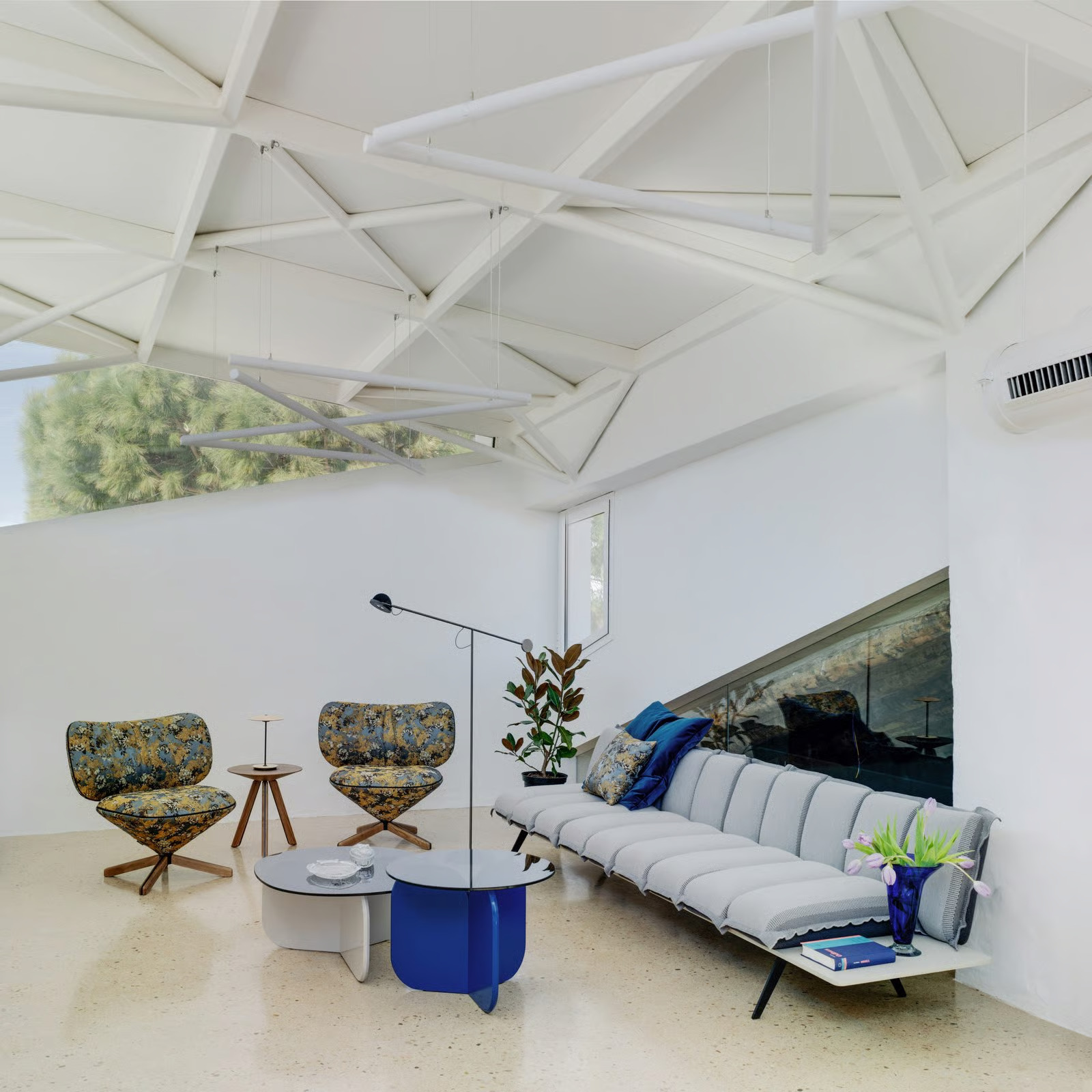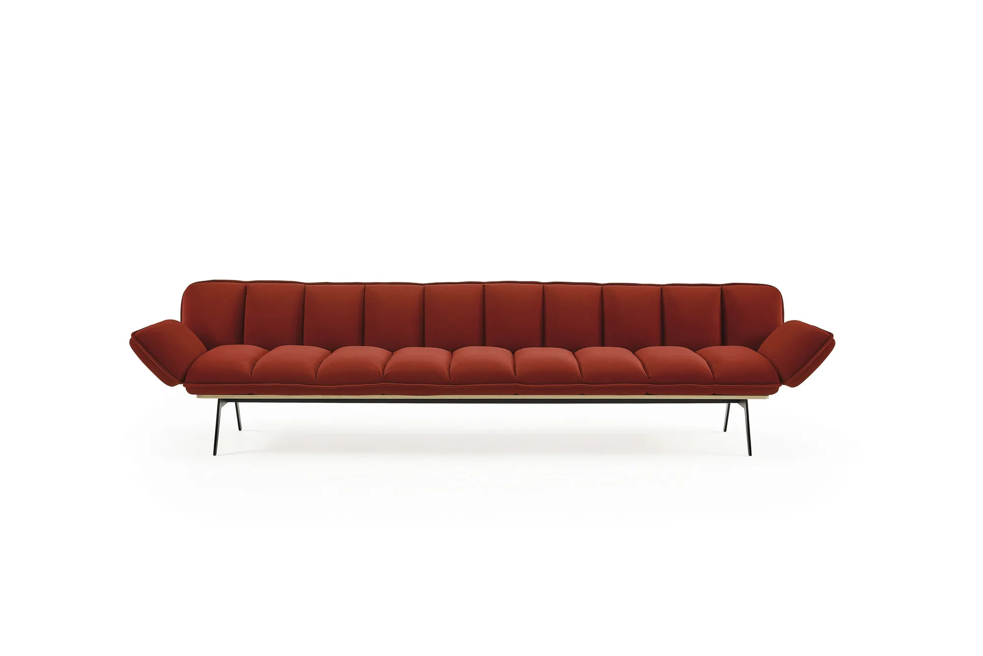 The NEXT STOP bench with back, designed in collaboration with Luca Nichetto, offers a versatile seating solution for restaurants, conference rooms, coworking spaces, cafés, event venues, and educational institutions. Drawing inspiration from the symmetry of train seats and the lighting of Milan's Turati station, this modular seating system features a unique fabric called Zero, developed with Marie Louise Rosholm. This woolen textile minimizes seams and waste, available in five bi-color options reminiscent of a knitted jersey. The bench's design includes three seating pads within a textile cover, allowing for customizable lengths. Optional arms can transform the bench into sofas or armchairs, while some configurations reveal a practical table. The steel structure comes in black or chrome with a textured epoxy coating, and the marine board veneer is available in ash or natural walnut. This modern design seamlessly integrates with dining tables and café chairs, providing durable and ergonomic seating for various settings.