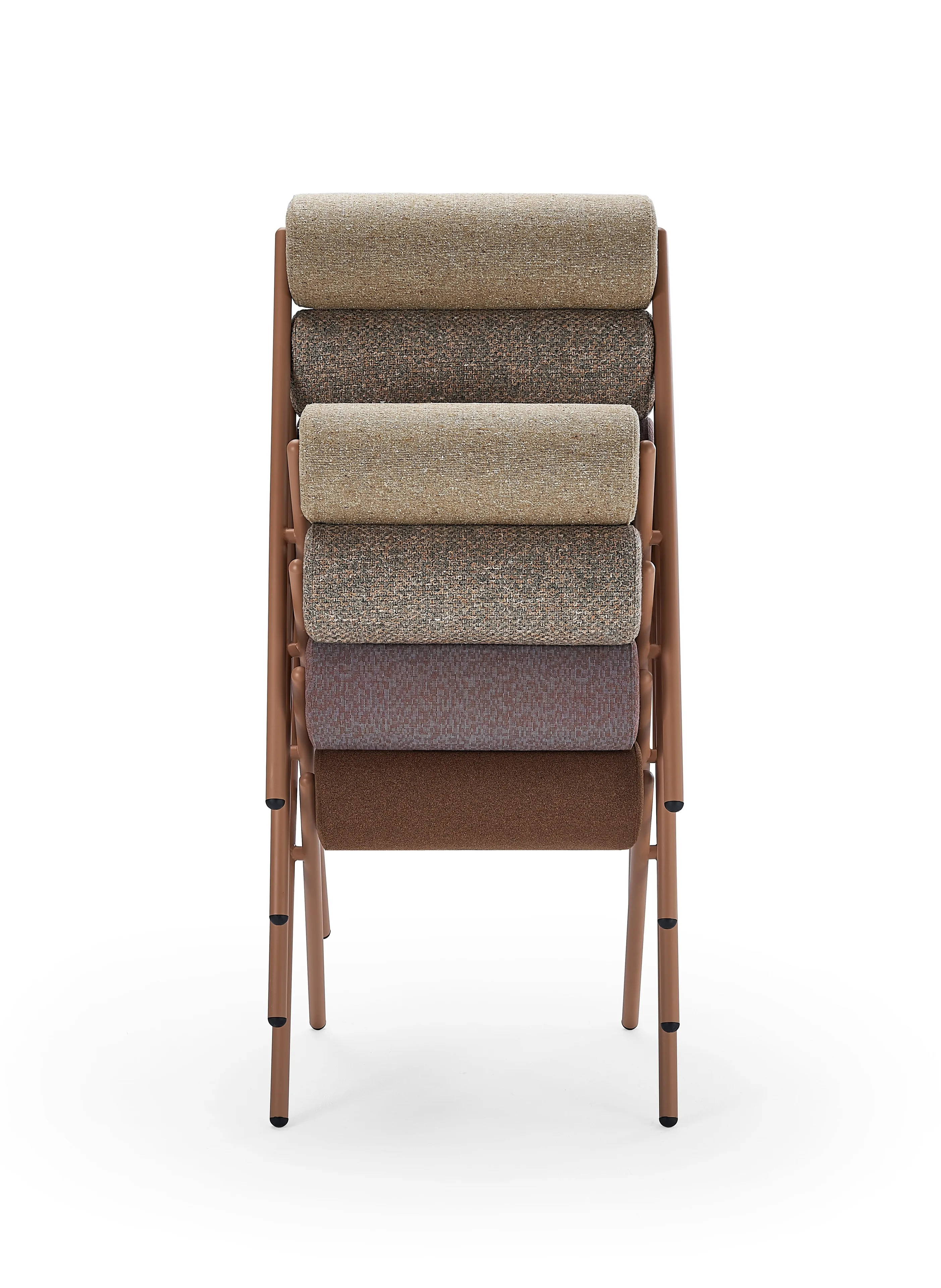 The Roll chair embodies a unique blend of modern design and functionality, making it an ideal choice for restaurants, conference rooms, coworking spaces, cafés, event venues, and educational institutions. Its design, inspired by gym leg presses, offers a minimalist aesthetic with two essential elements: steel tubes and cylindrical pads for the back and seat. This ergonomic chair provides durable seating while maintaining a contemporary look. The Roll chair's stackable nature transforms it into a sculptural piece, enhancing its appeal as conference room furniture. With customizable cushions available in various fabrics and twelve lacquer colors for the metal frame, personalization is effortless. The chair's sustainable design, using minimal materials, ensures ease of recycling, while its robust construction promises longevity.