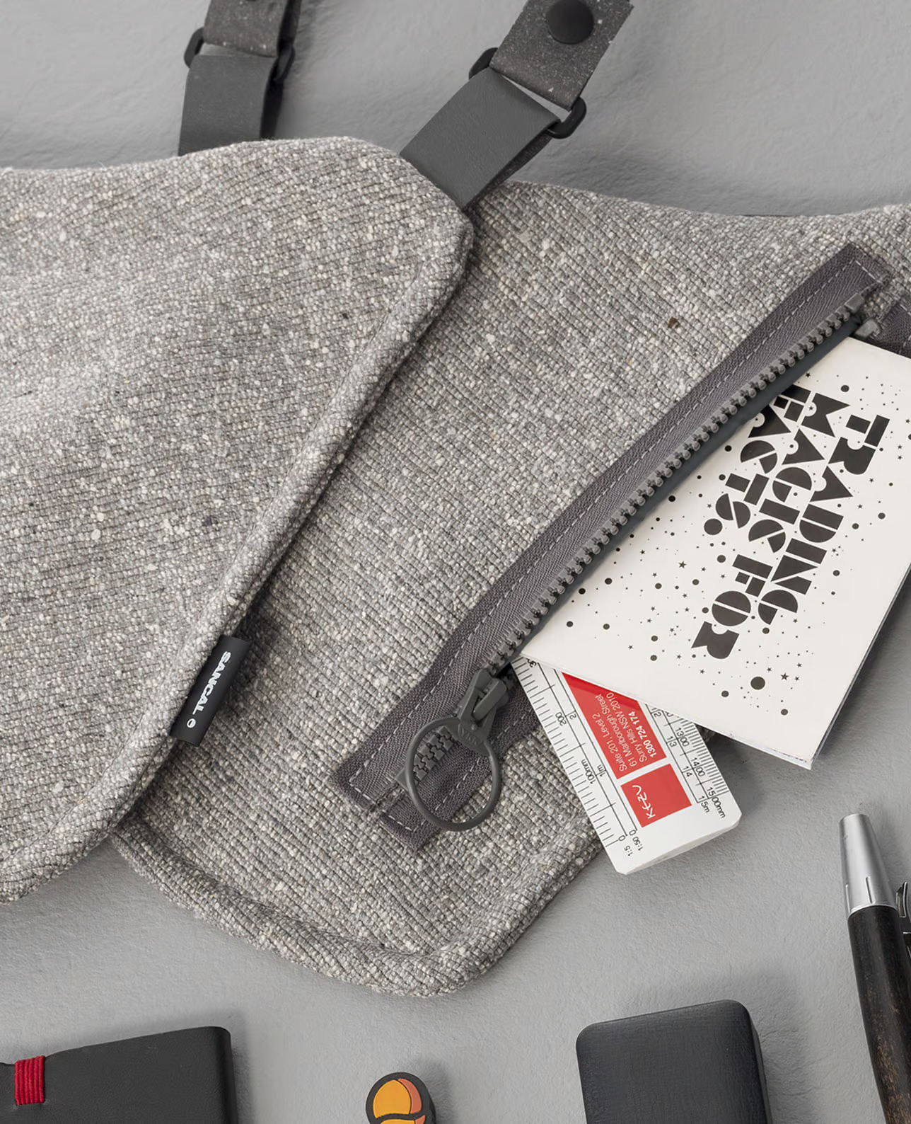 The SIN PISTOLS CENIZA holster offers a unique blend of materials, combining wool, silk, viscose, and linen for a durable yet pleasant texture. Its handles are crafted from sustainable recycled leather, providing a smooth feel. Featuring high-quality injected YKK nylon zips and accessories, this holster is recognized for its superior craftsmanship. Sancal introduces this distinctive piece to architects and the design community, marking its entry into the fashion realm. As a premium edition of Las Culpass' holster-bag, it holds a special place in Spain's underground fashion scene. The thoughtful design, meticulous craftsmanship, and carefully chosen materials make this version stand out.