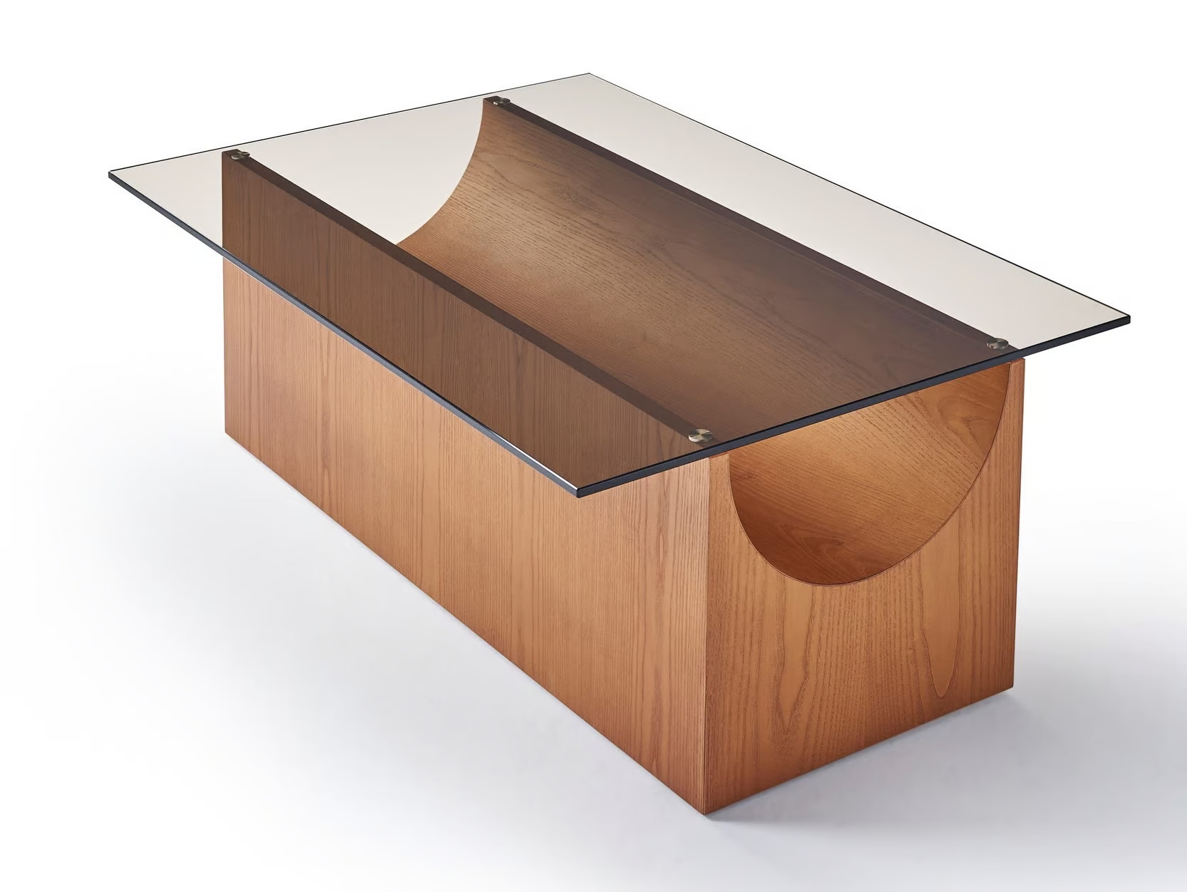 The Vestige coffee table combines a glass top with a wood base, offering a modern design suitable for restaurants, conference rooms, coworking spaces, cafés, event venues, and educational institutions. Its sculptural base, inspired by ancient architectural forms, features a rectangular block with a cylindrical section removed, creating a striking visual contrast. The tempered glass top rests on this unique structure, highlighting its geometric elegance. Available in various finishes, including Menta, Lavanda, and Calabaza stains for the ash wood base, as well as classic Nogal and Cerezo colors. The base can also be finished with iQ from Tarkett, known for its durability in flooring and wall applications, or a lacquer color with an extra-matt finish. While occasional tables offer multiple tabletop options, dining tables are exclusively available with a glass top, making them ideal for spaces requiring durable seating and conference room furniture.