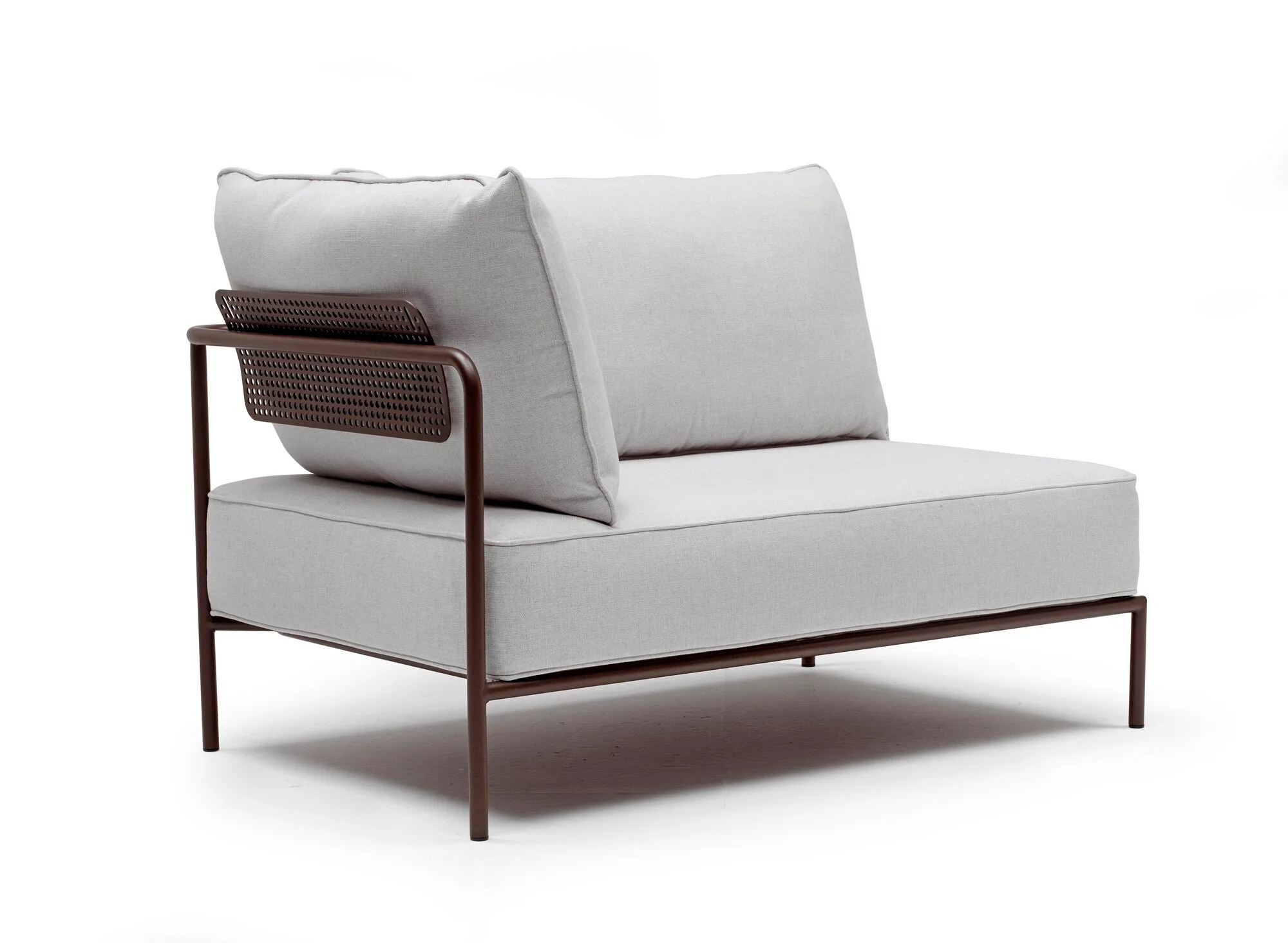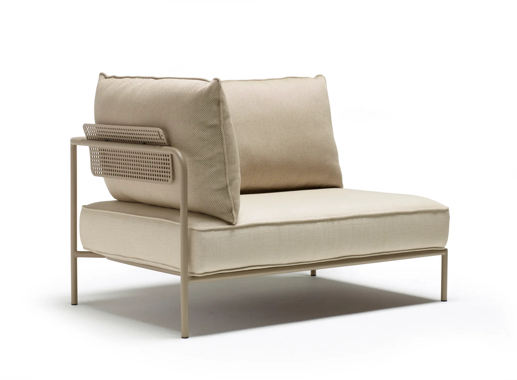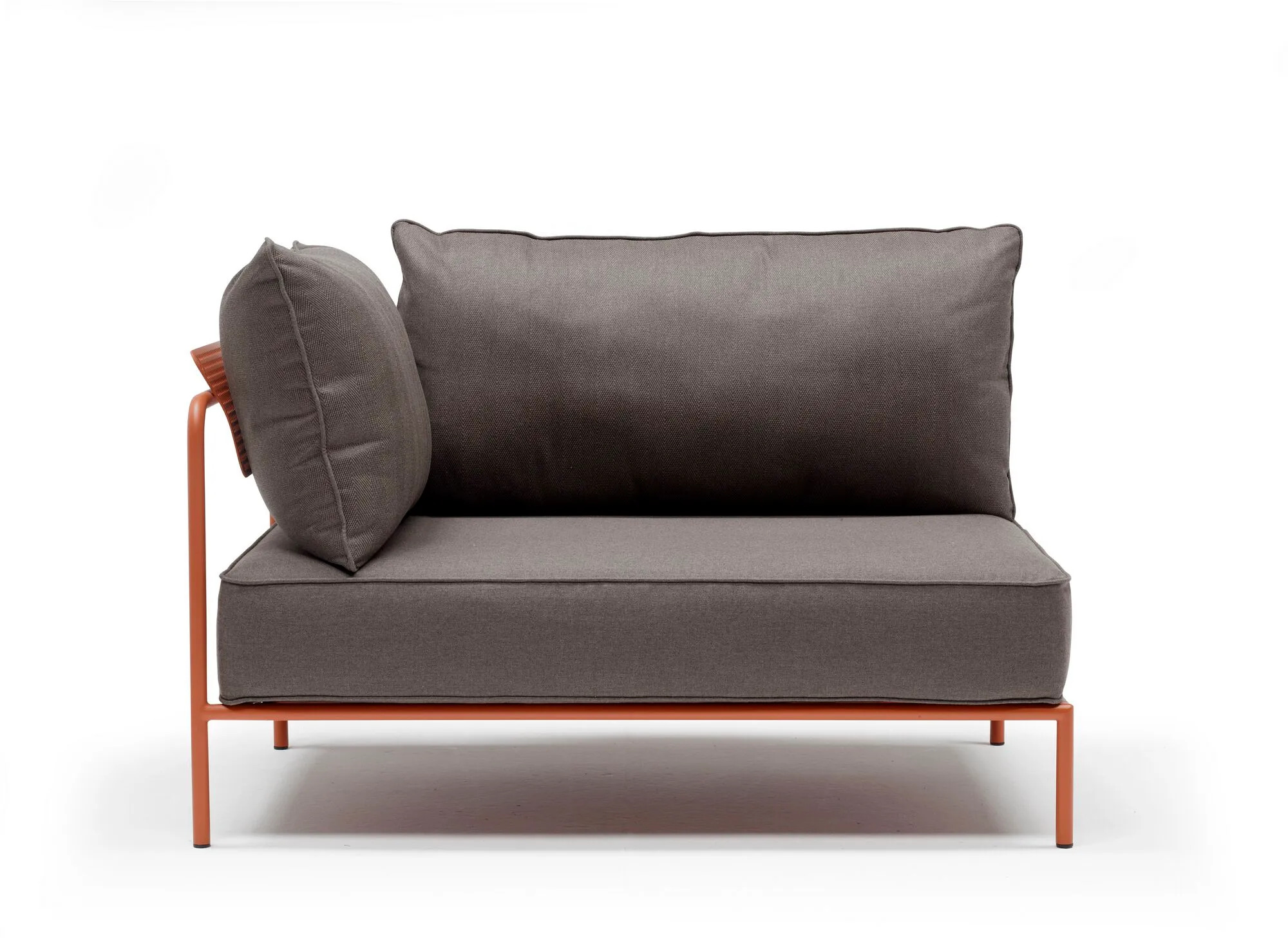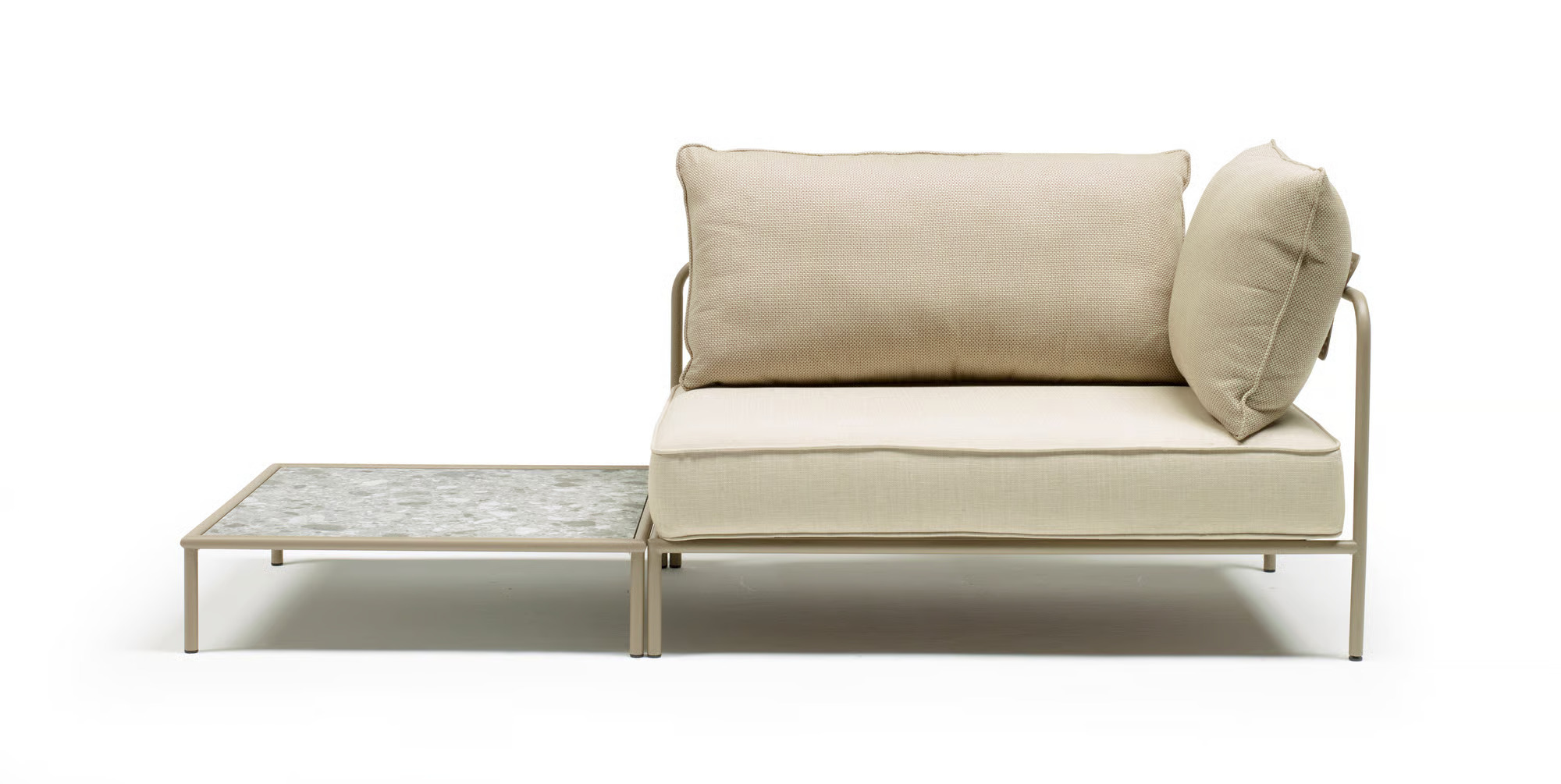 FLAP by Meneghello Paolelli offers a unique blend of modular upholstered seating, seamlessly bridging the gap between indoor and outdoor environments. This versatile piece features seating elements that can be combined with support surfaces, making it ideal for resorts, cafés, and beachside hotels. The design includes elements resembling aircraft flaps attached to the backrest, providing support for the rear cushions. Constructed with a durable metal frame, FLAP is available in a variety of colors, including linen, dove grey, anthracite, mocha, and terracotta. Its wide selection of outdoor fabrics ensures suitability for all-weather conditions, making it a reliable choice for garden furniture sets, comfortable poolside loungers, and durable patio chairs.