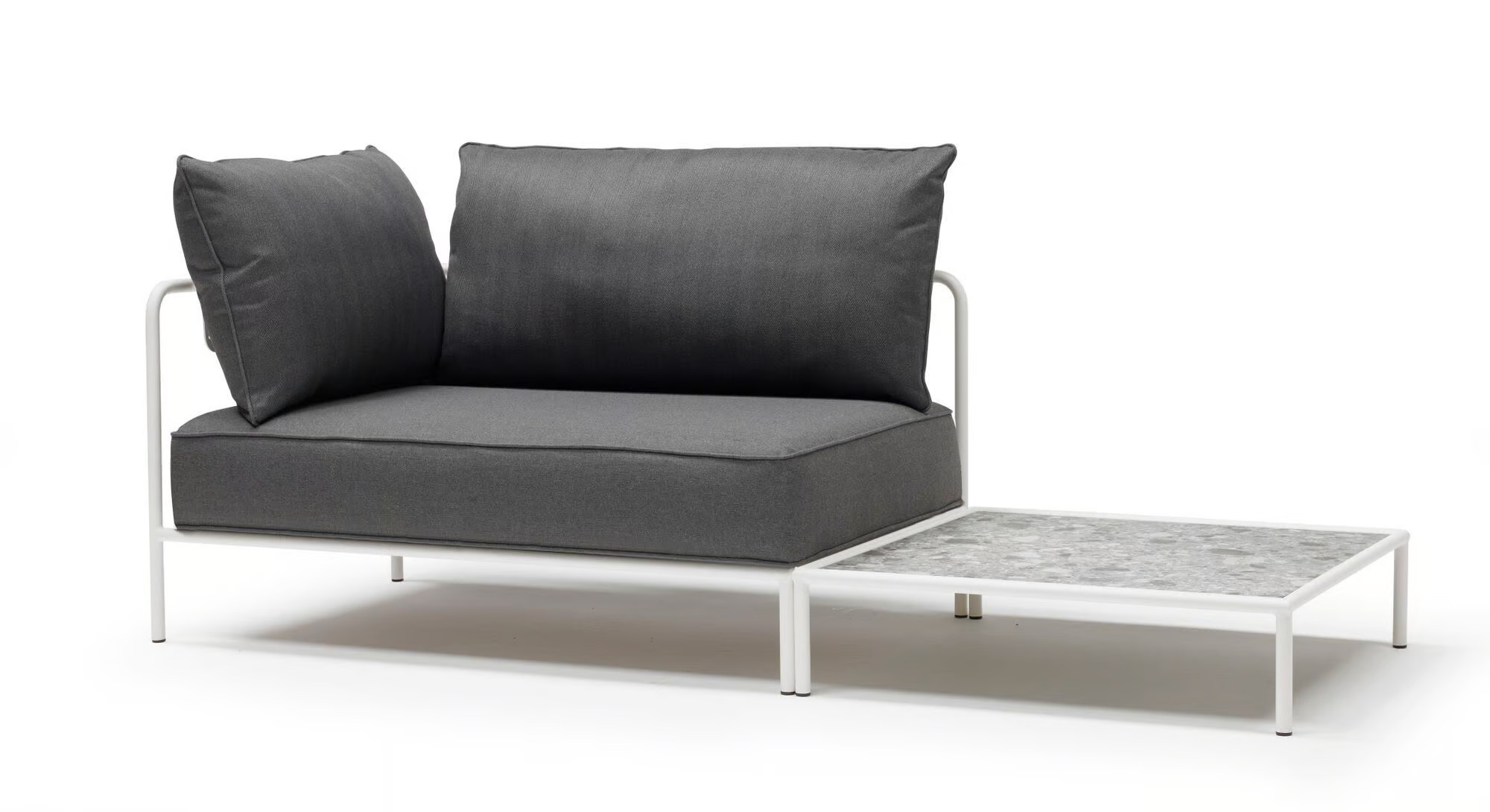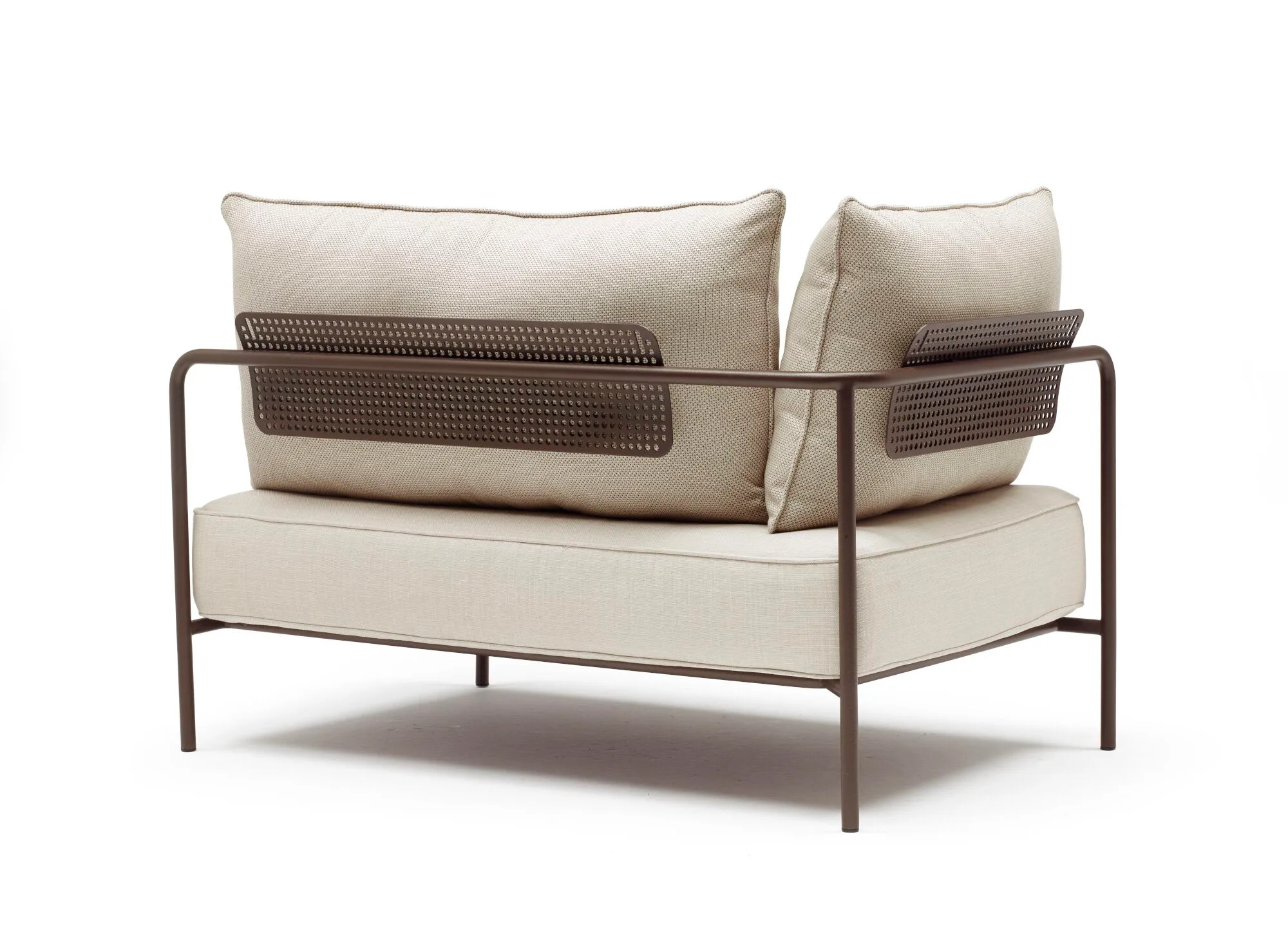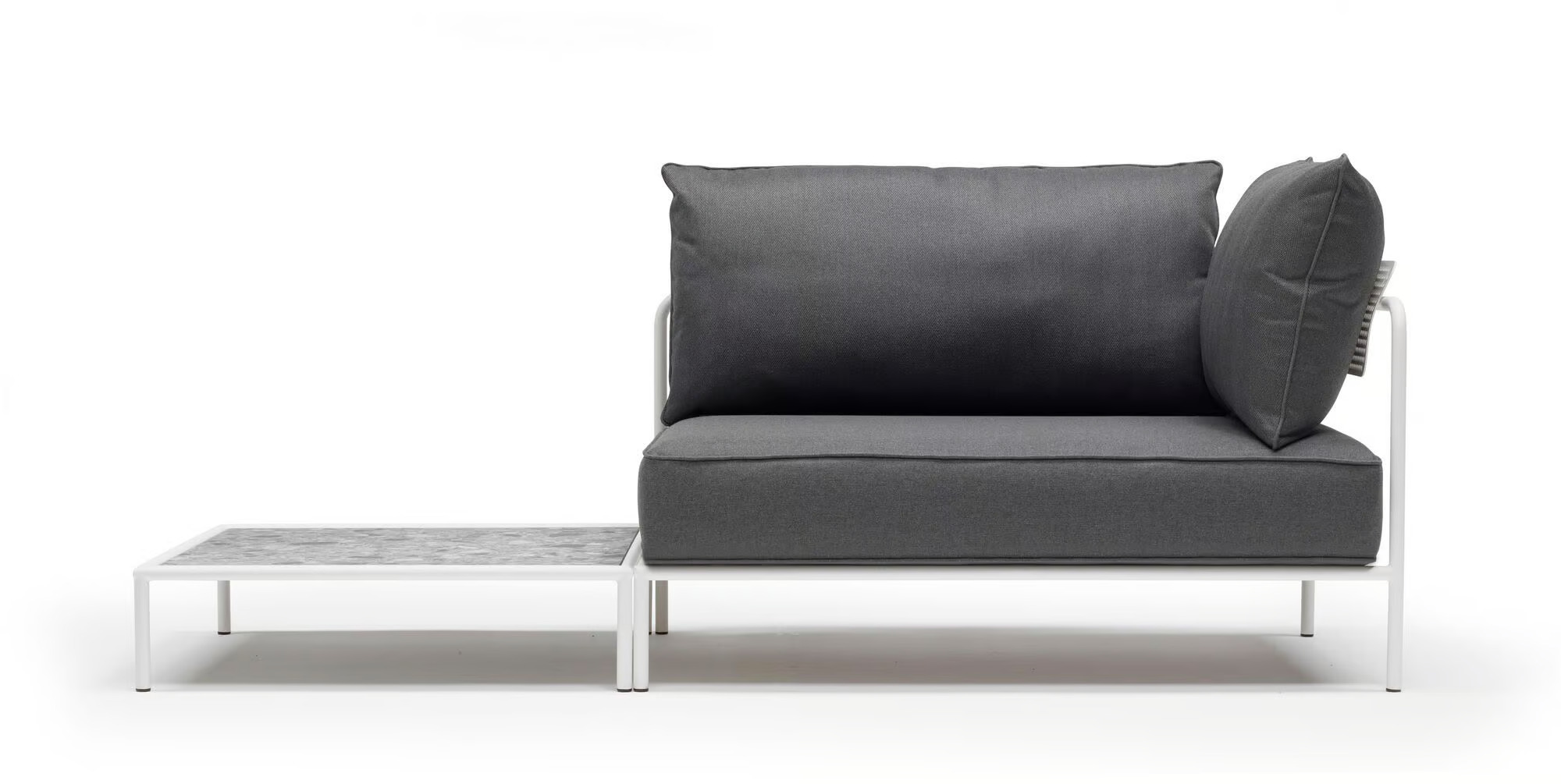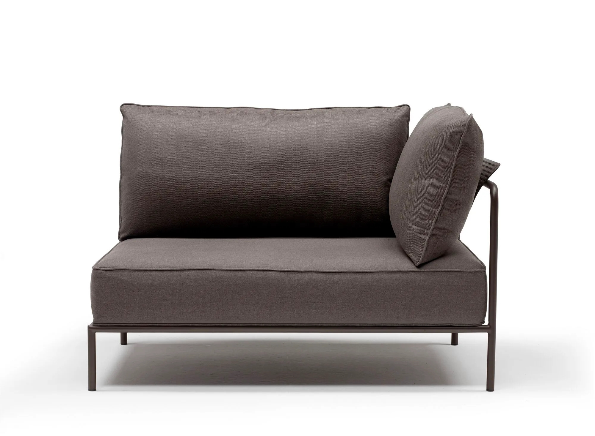 FLAP by Meneghello Paolelli offers a unique blend of modular upholstered seating, seamlessly bridging the gap between indoor and outdoor environments. This versatile piece features seating elements that can be combined with support surfaces, making it ideal for resorts, cafés, and beachside hotels. The design includes elements resembling aircraft flaps attached to the backrest, providing support for the rear cushions. Constructed with a durable metal frame, FLAP is available in a variety of colors, including linen, dove grey, anthracite, mocha, and terracotta. Its wide selection of outdoor fabrics ensures suitability for all-weather conditions, making it a reliable choice for garden furniture sets, comfortable poolside loungers, and durable patio chairs.