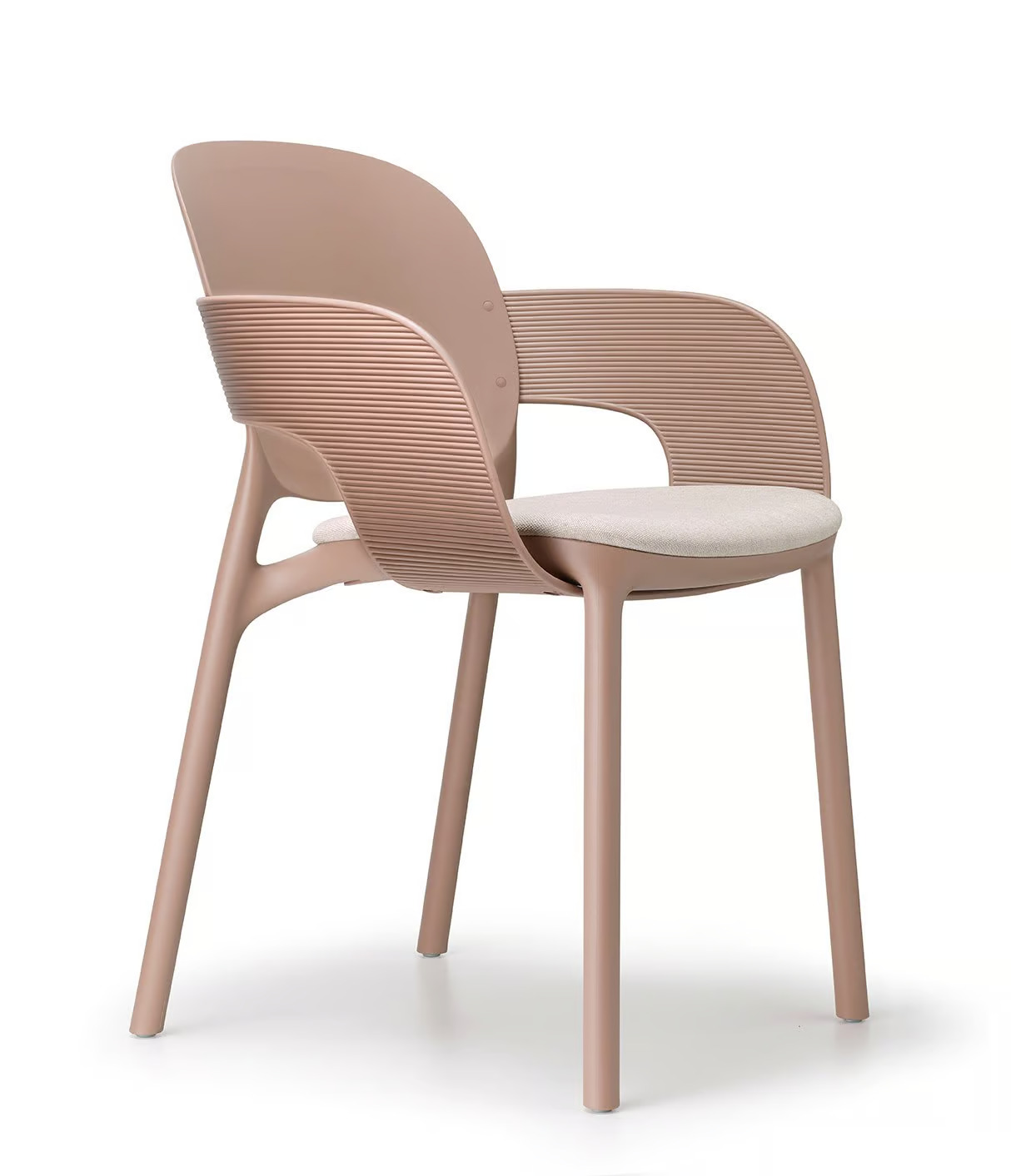 The HUG chair, crafted from polypropylene, features armrests and a unique band element that seamlessly connects the seat and back, offering a harmonious blend of form and function. Its rounded, balanced design ensures ergonomic comfort, making it suitable for both indoor and outdoor settings. Available in two versions, the chair can be entirely made of technopolymer with an embossed striped motif or enhanced with a fabric-covered seat cushion and padded band for added comfort. This versatile seating solution is ideal for dining tables, café settings, and conference room furniture, providing durable seating with a modern design. The stackable nature of the HUG chair makes it a practical choice for educational institutions and event venues, where space efficiency is key. The collaboration between Meneghello Paolelli and S•CAB highlights a commitment to usability and sustainability, resulting in a flexible system that adapts to various configurations.