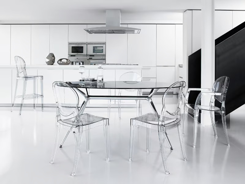 The IGLOO chair features a polycarbonate frame, offering a versatile seating solution for restaurants, conference rooms, coworking spaces, cafés, event venues, and educational institutions. Available in a range of colors, both transparent and solid, this chair is suitable for both indoor and outdoor environments. Its stackable design ensures easy storage, making it ideal for spaces requiring flexible seating arrangements. Measuring W45 D52 Hs46 H87 cm, the IGLOO chair can be enhanced with an optional textile cushion, attachable with Velcro, for indoor use. Upholstery options include velvet, woven, and cotton fabrics. The price includes a set of two chairs with the same configuration, providing a practical and stylish addition to any modern design table or conference room furniture setup.