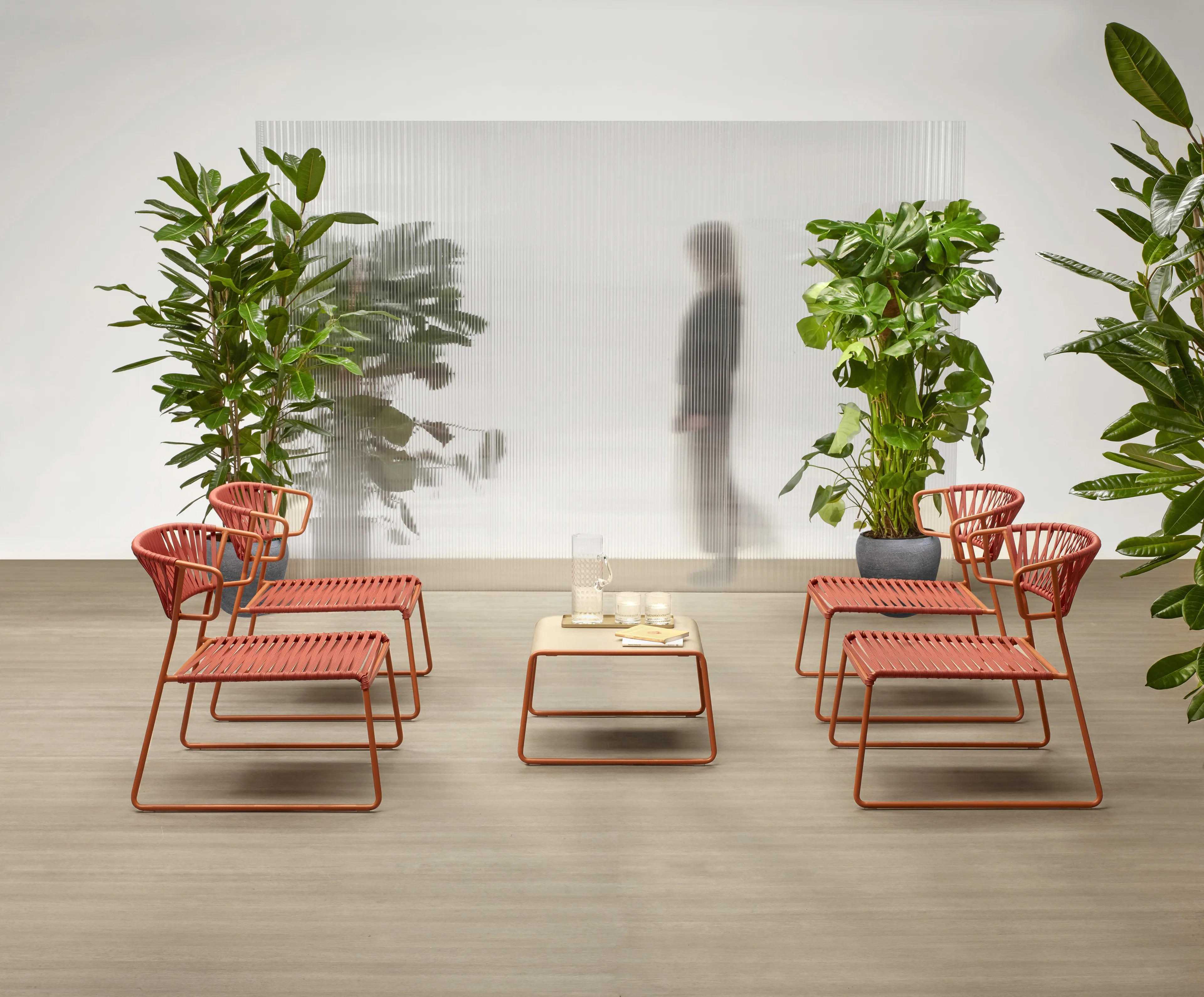Crafted from coated galvanized steel, the LISA LOUNGE side table combines functionality with a modern design aesthetic, making it a versatile addition to dining tables and café chairs. Its adaptable top, which can be positioned with edges facing up or down, serves as a practical tray. Available in dove grey, anthracite, terracotta, linen, and air force blue, this piece reflects the elegant style of the 1950s and 1960s. The ergonomic chairs feature a comfortably upholstered seatback and seat, ideal for conference room furniture and other professional settings. The lightweight yet durable metal structure enhances its visual appeal, offering a sense of lightness. LISA LOUNGE is available in chair, armchair, and stool versions, providing stackable and durable seating solutions for various environments.