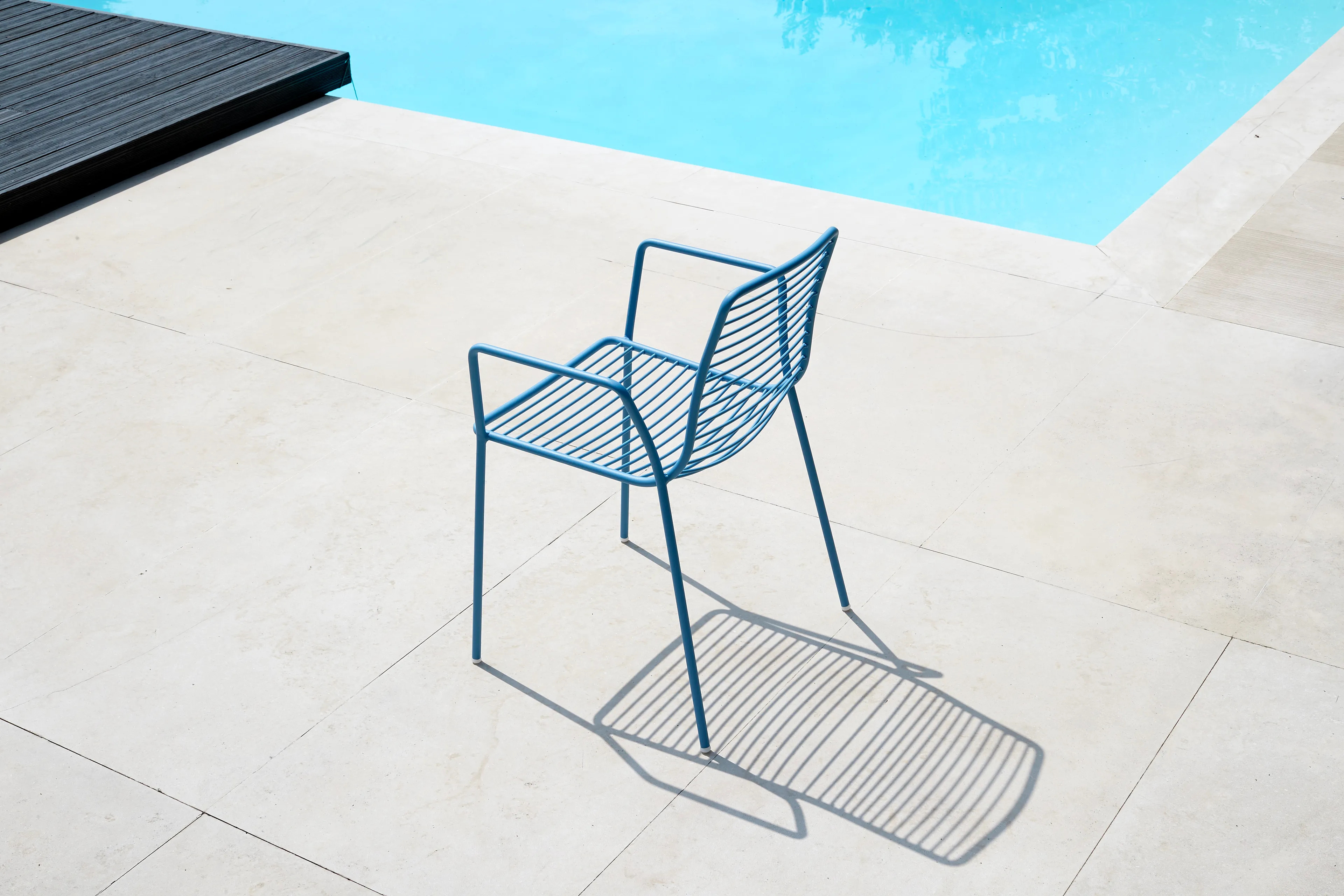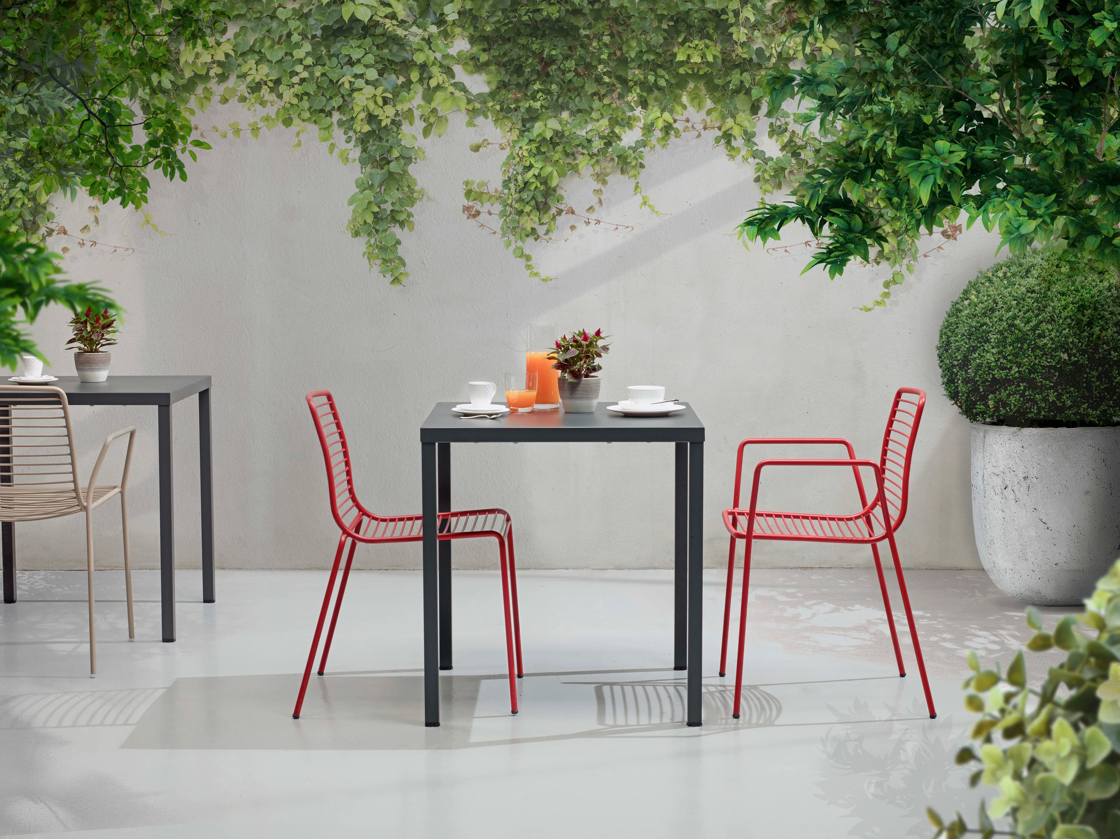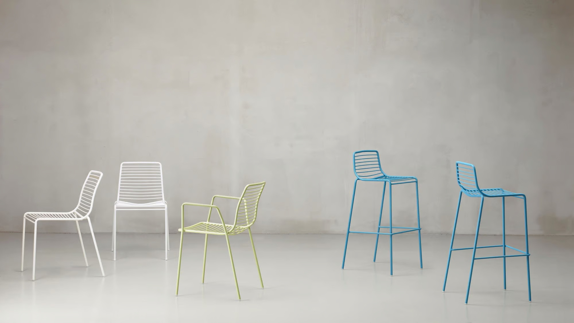 The SUMMER collection features dining tables and café chairs crafted from powder-coated tubular steel, offering a sleek and robust design. Available in three variations—without armrests, with armrests, and as a bar stool—these pieces are suitable for both indoor and outdoor settings, including restaurants, conference rooms, coworking spaces, cafés, event venues, and educational institutions. The modern design tables and ergonomic chairs come in a range of pastel finishes, including white, anthracite, dove gray, brick red, linden green, and light blue. Lightweight and stackable, these durable seating options provide versatility and ease of storage. The galvanized steel structure with a polyester powder-coat finish ensures longevity, making them an ideal choice for conference room furniture and other professional environments.