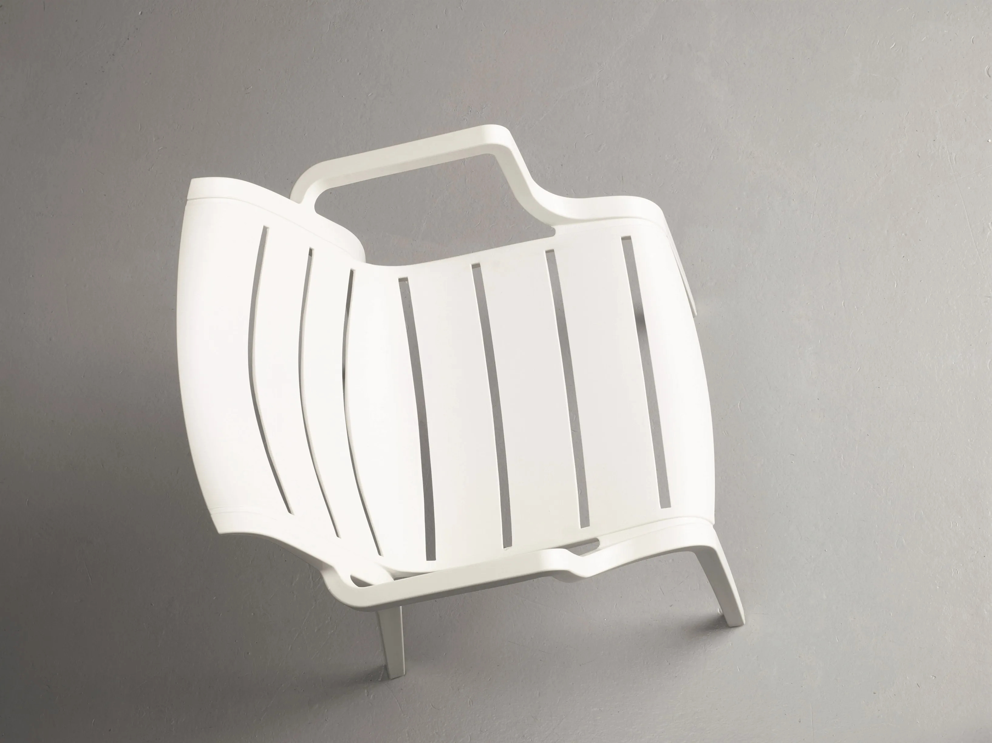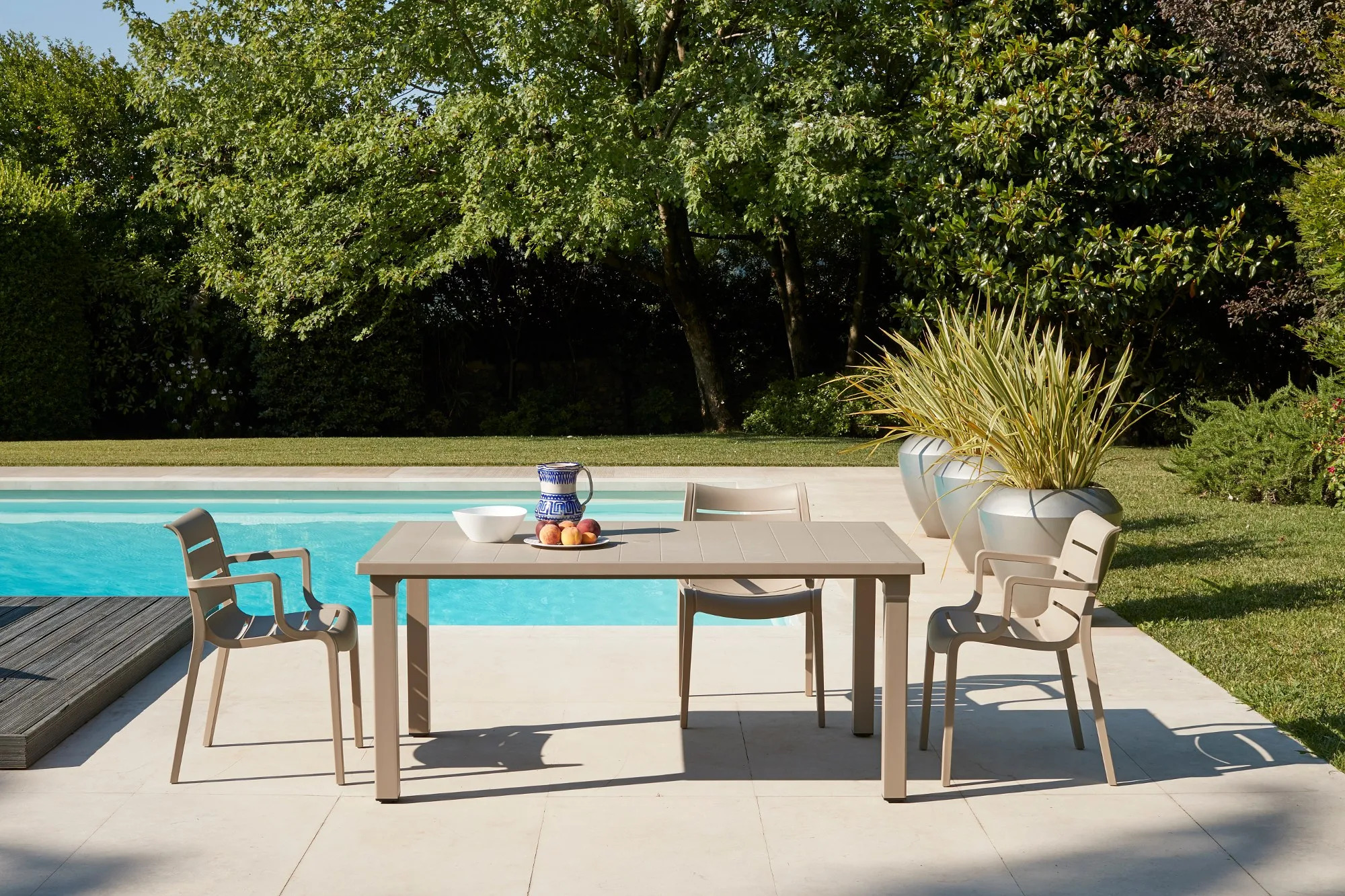 The Sunset armchair by Scab Design offers a blend of ergonomic comfort and modern aesthetics, making it suitable for various professional settings. Its classic design features intersecting pure lines and distinctive staves, creating a contemporary look that complements outdoor environments. Constructed from durable technopolymer, this chair is both sturdy and lightweight, ensuring resistance to weather conditions. Ideal for dining tables in restaurants, café chairs, or conference room furniture, Sunset is practical and stackable, allowing for easy storage. Available in a range of colors, from vibrant geranium red and yellow to subtle pistachio green and light blue, as well as neutral tones like linen, anthracite, and dove grey, it seamlessly integrates with diverse furniture styles. Designed by architect Luisa Battaglia, Sunset is sold in sets of four.