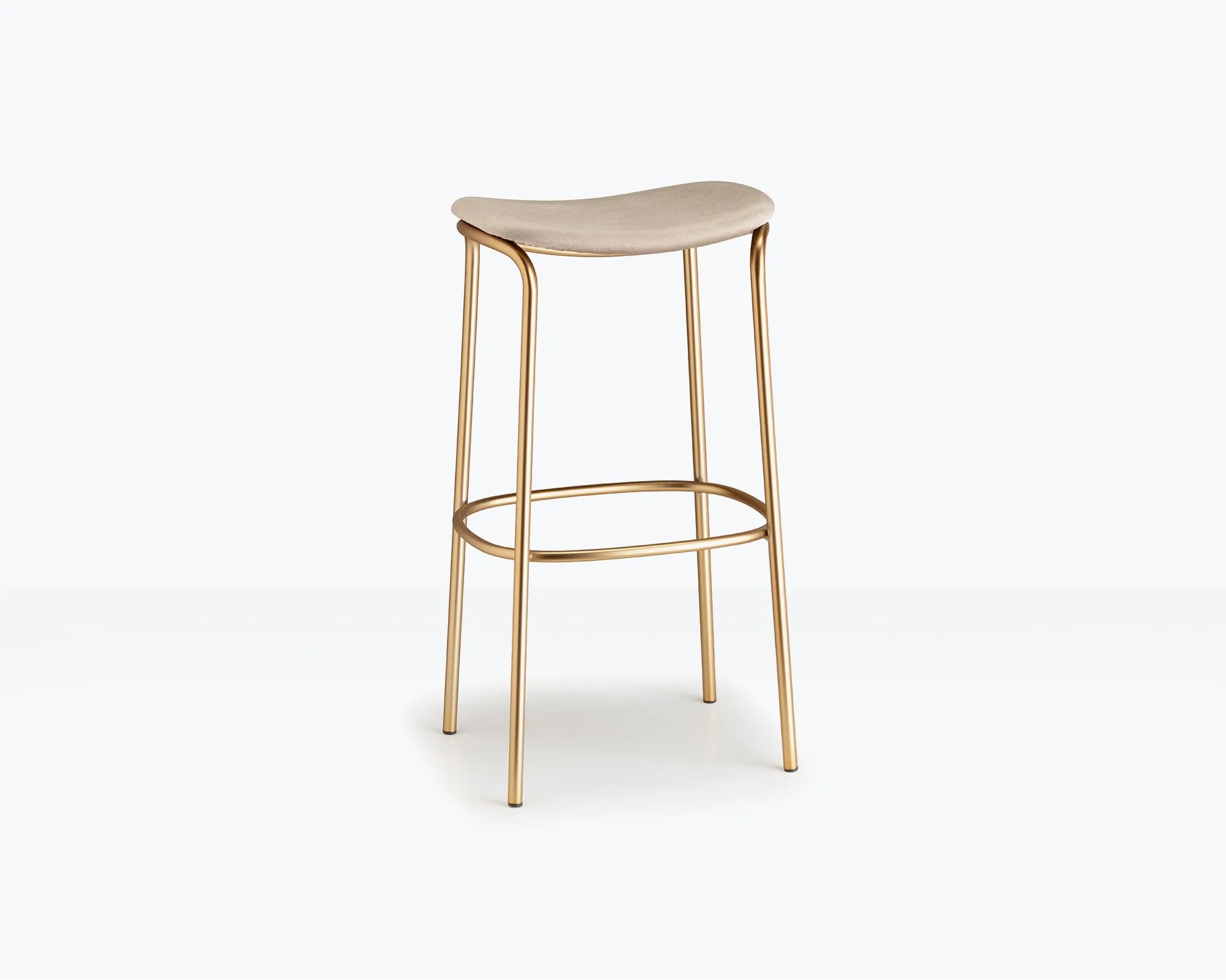 The TRICK POP barstool combines minimalist design with expressive curves, creating a versatile seating option for various settings. Its metal structure is defined by smooth lines, while the padded seat offers comfort and support. Designed for large-scale production, it complements the SI-SI collection. Available in a range of colors and finishes, including painted, galvanic matt gold, or polished black nickel, it caters to diverse aesthetic preferences. The stool features a padded seat in velvet or fabric, with a steel frame that is either galvanized or painted in a single color. Suitable for indoor use, it enhances dining tables and café chairs, while its durable construction makes it ideal for conference room furniture. The painted metal version is also suitable for hybrid indoor-outdoor spaces, such as covered terraces.